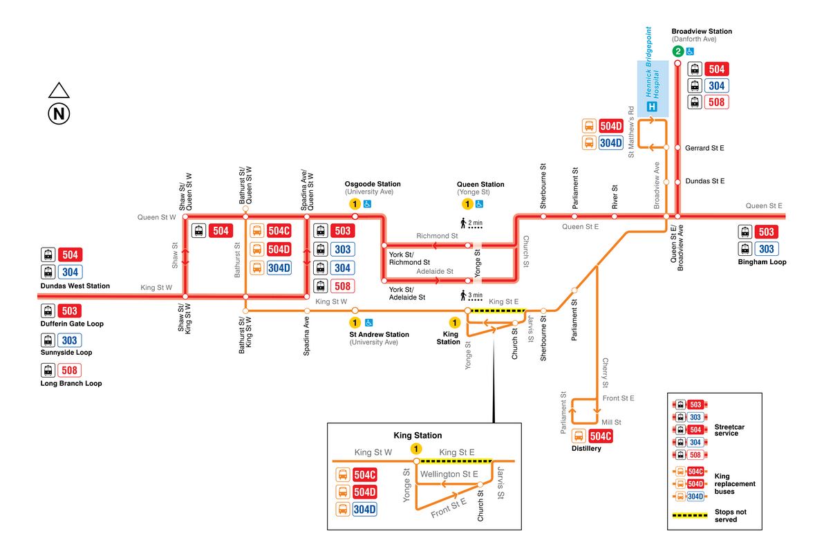 Updated 3:50pm with revised diversion map for routes 504/304, 503/303 and 508. Not shown are routes 501 Queen and 511 Bathurst.