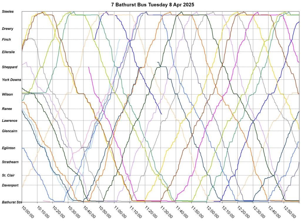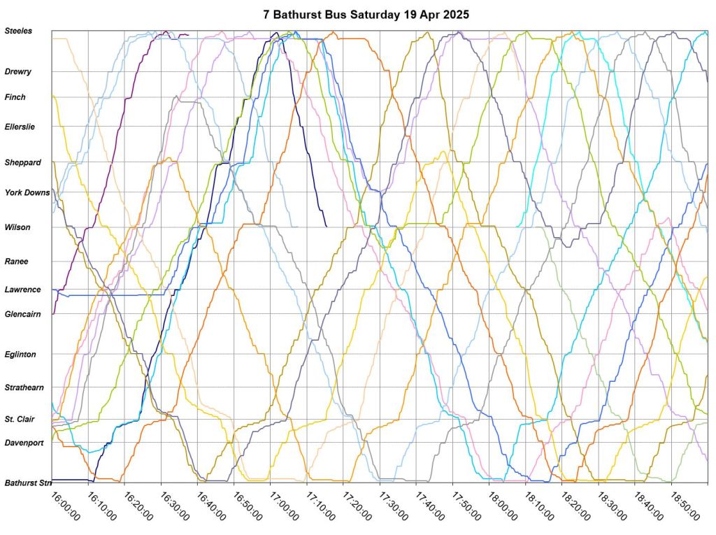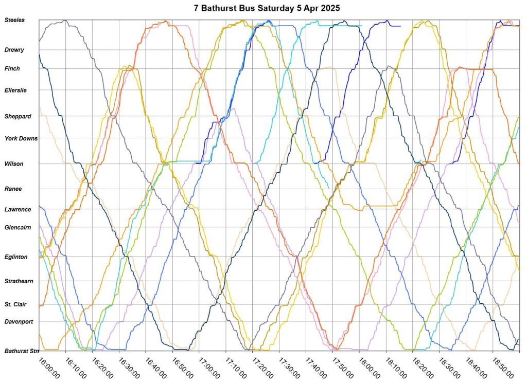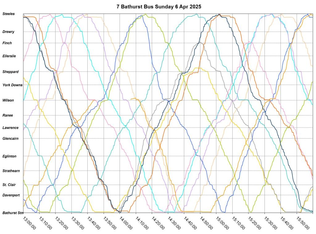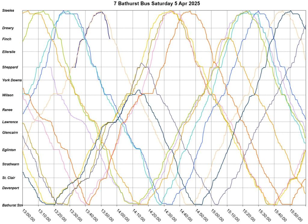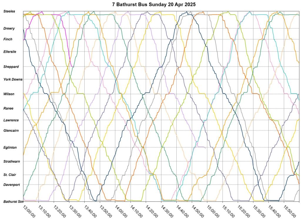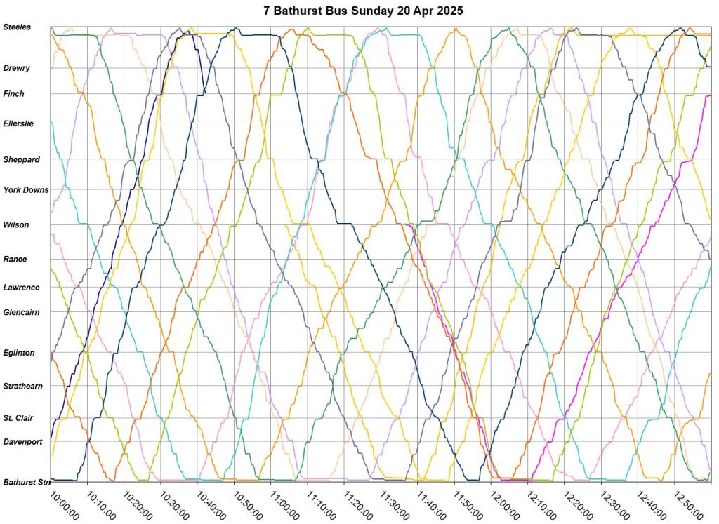 Mid-route headway control is challenging on two counts. First, riders don’t like sitting while a bus waits for its time, and also there should be somewhere for the vehicle to do this without blocking traffic. This is relatively simple on a route where every vehicle is going to the same place at the same nominal speed, like Bathurst, but not where there are multiple routes and/or express/local branches where an idling bus could interfere with other routes.