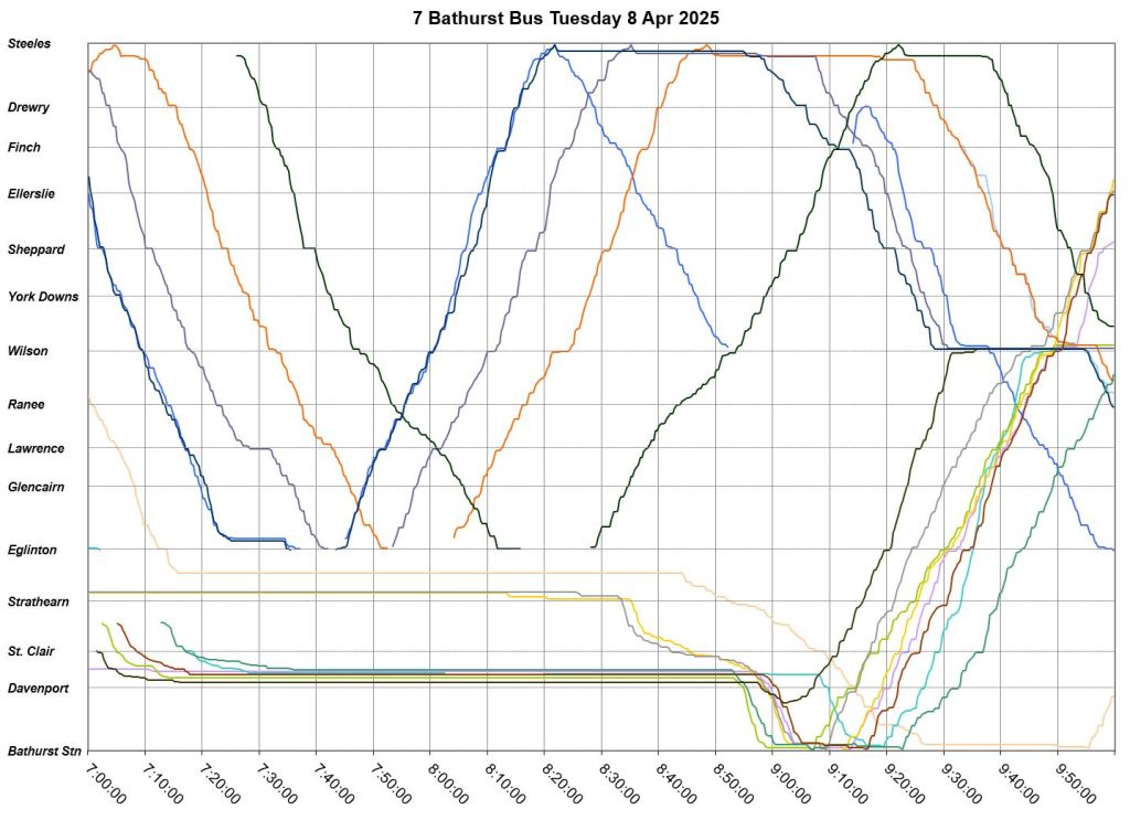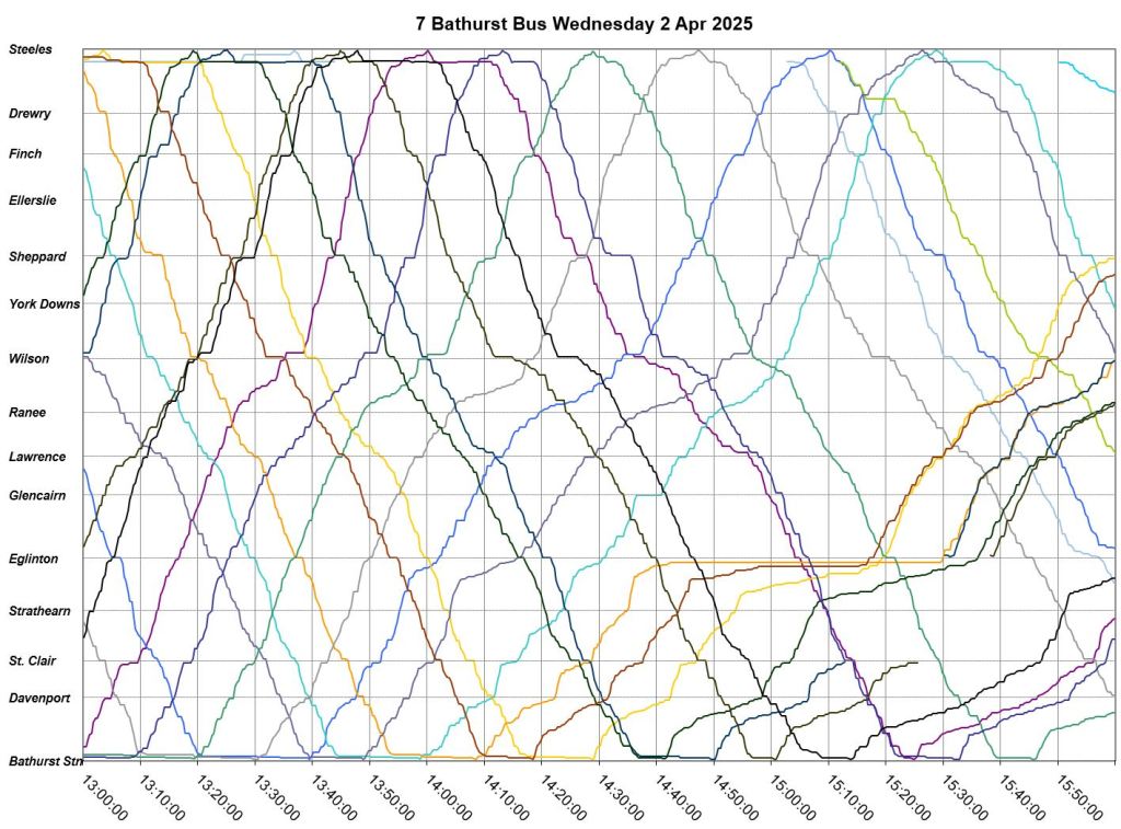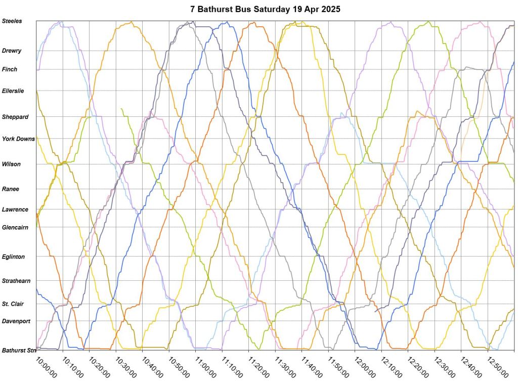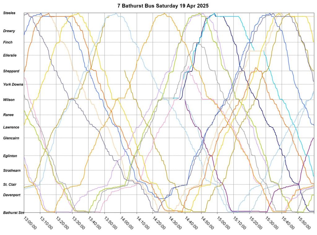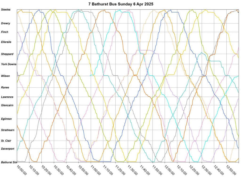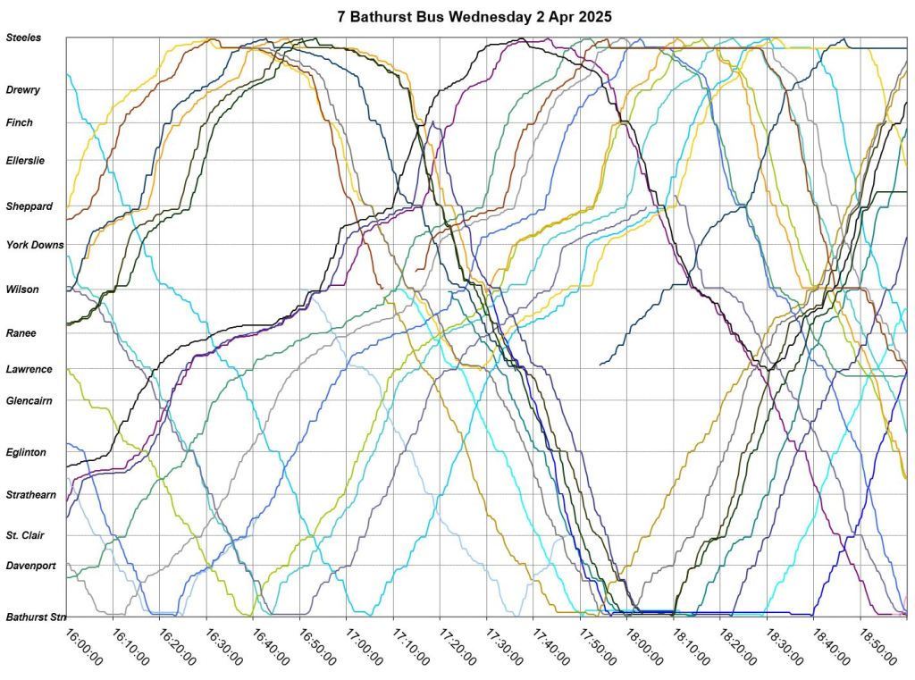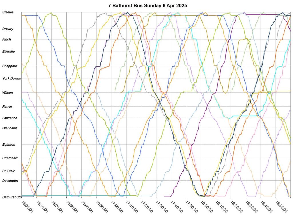 Mid-route headway control is challenging on two counts. First, riders don’t like sitting while a bus waits for its time, and also there should be somewhere for the vehicle to do this without blocking traffic. This is relatively simple on a route where every vehicle is going to the same place at the same nominal speed, like Bathurst, but not where there are multiple routes and/or express/local branches where an idling bus could interfere with other routes.