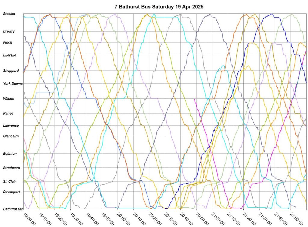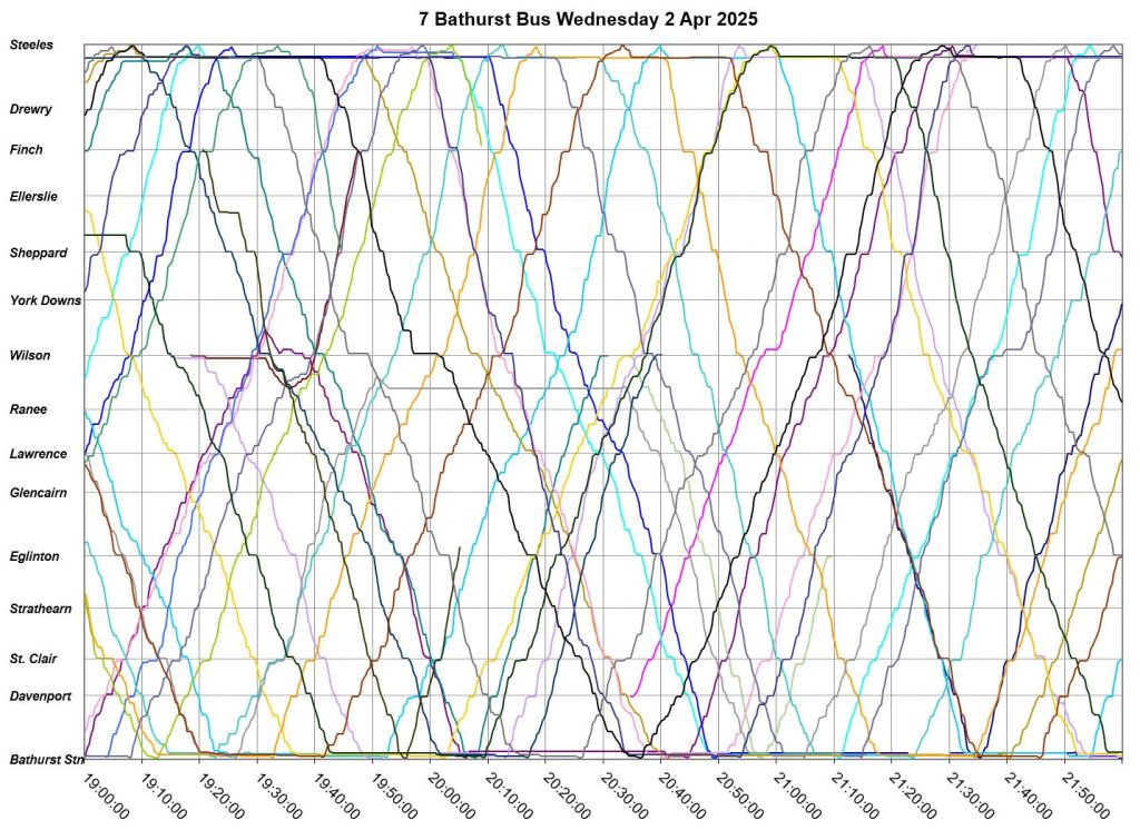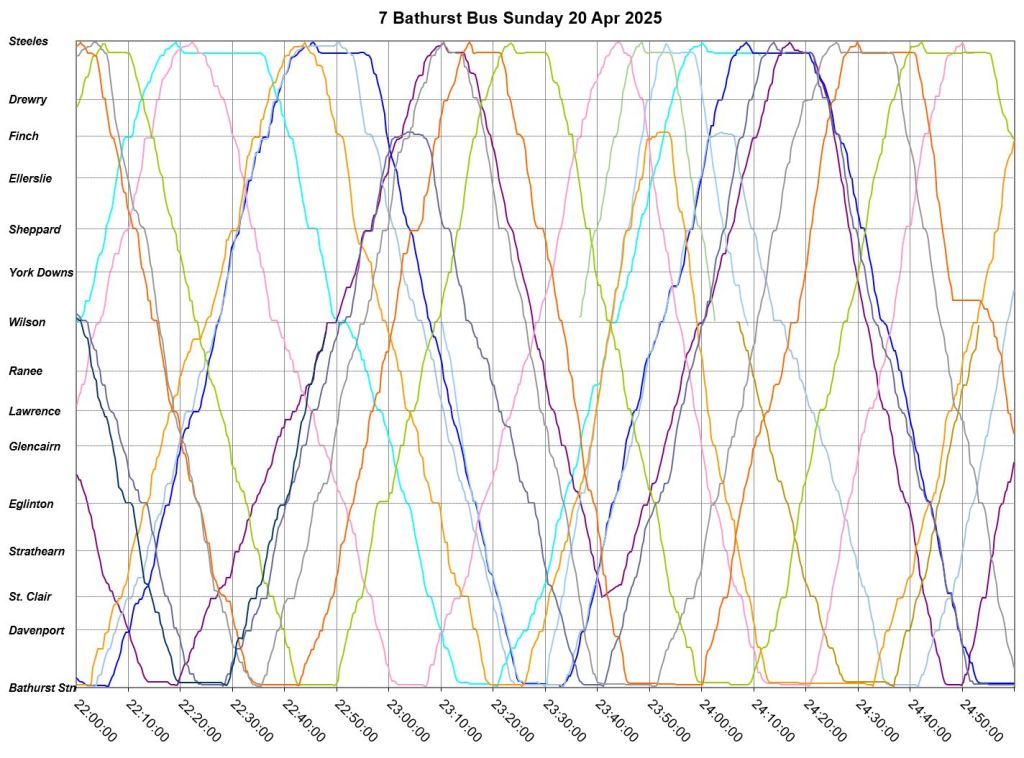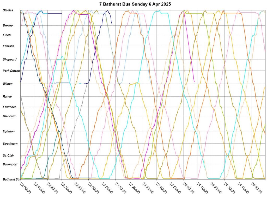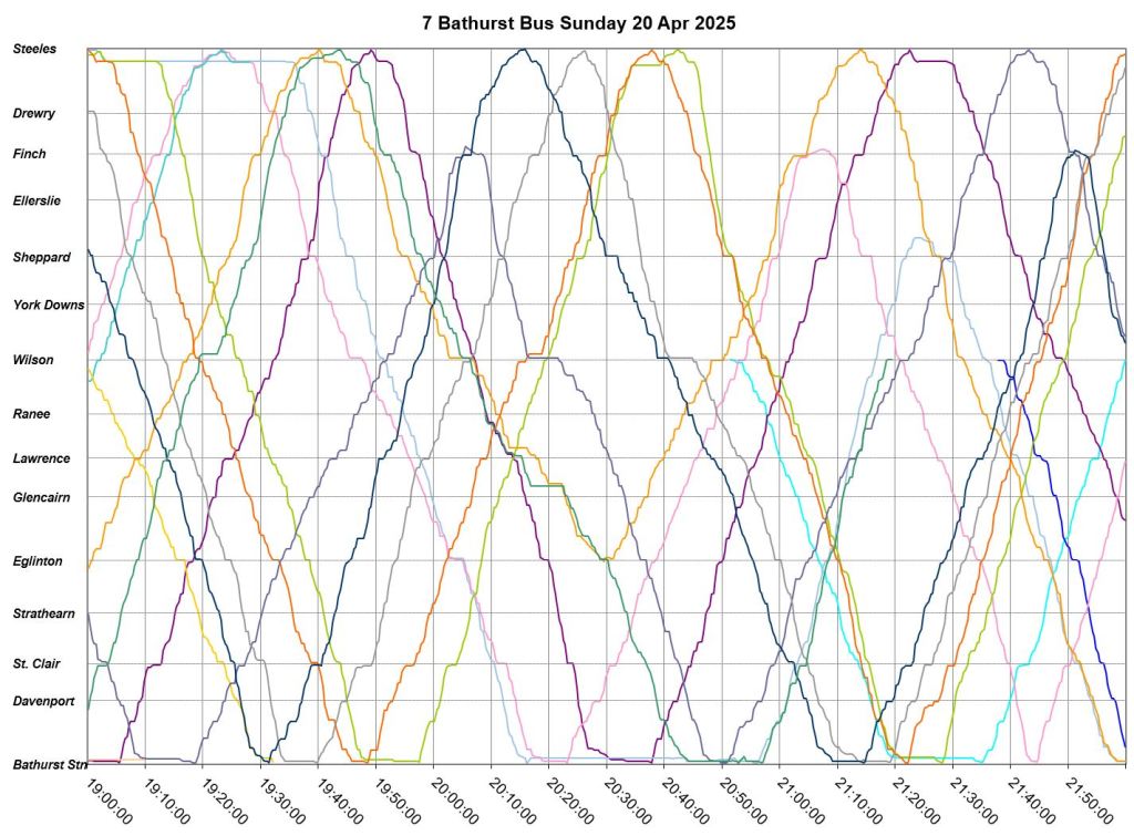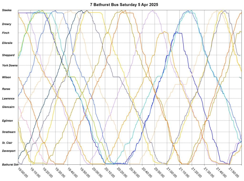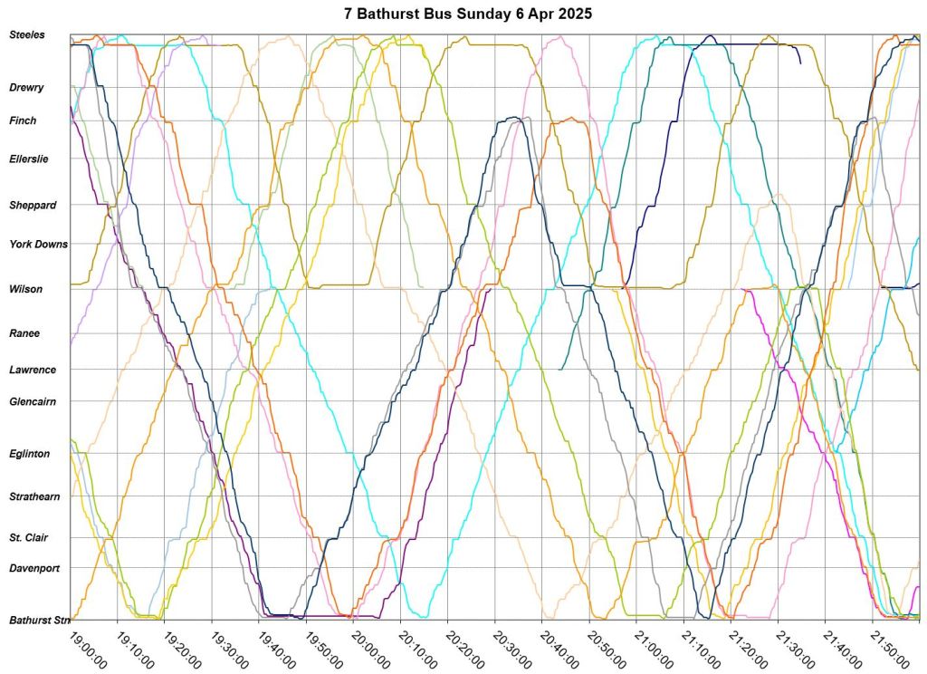 Mid-route headway control is challenging on two counts. First, riders don’t like sitting while a bus waits for its time, and also there should be somewhere for the vehicle to do this without blocking traffic. This is relatively simple on a route where every vehicle is going to the same place at the same nominal speed, like Bathurst, but not where there are multiple routes and/or express/local branches where an idling bus could interfere with other routes.