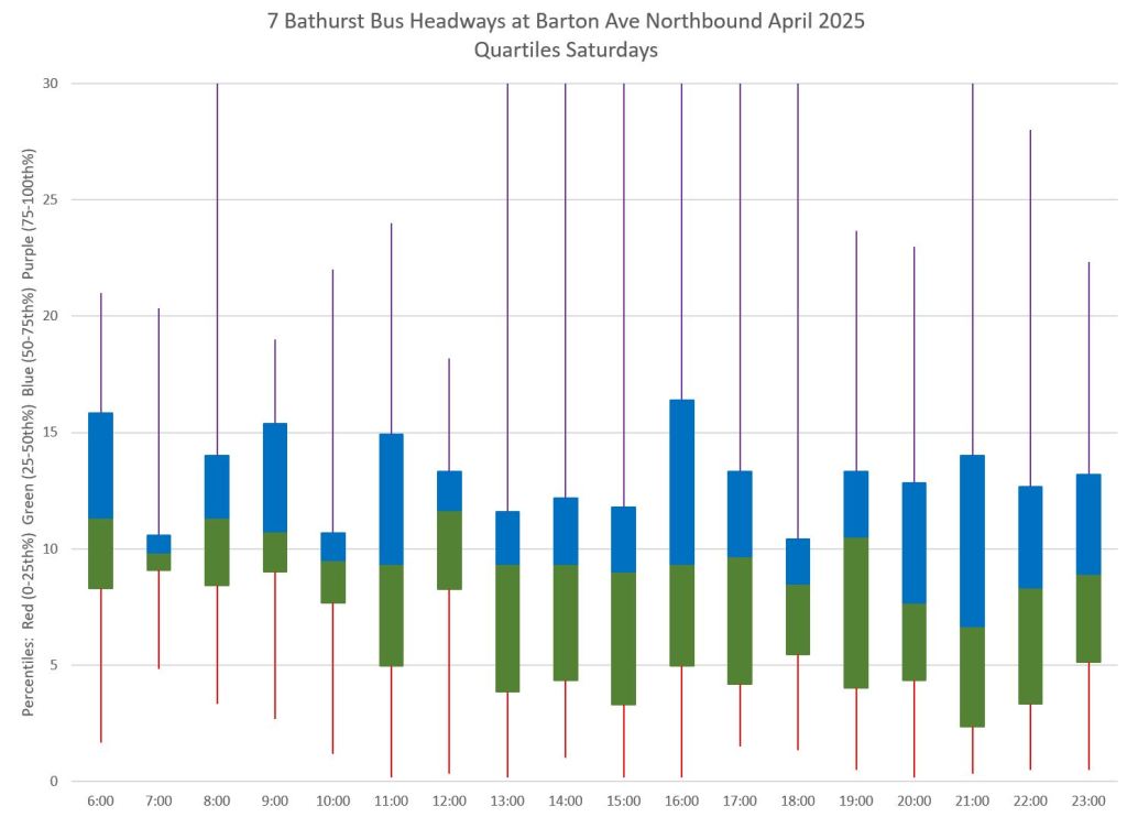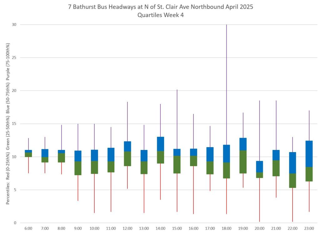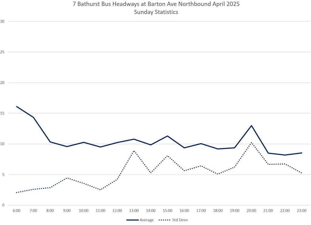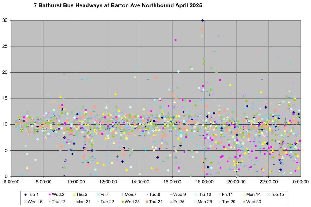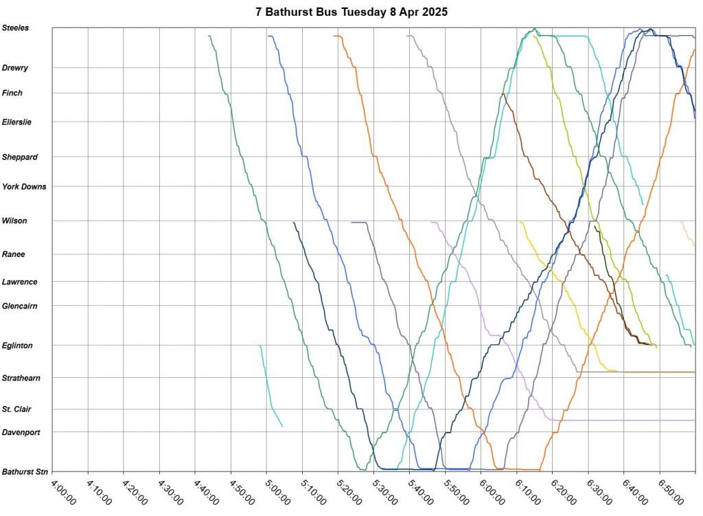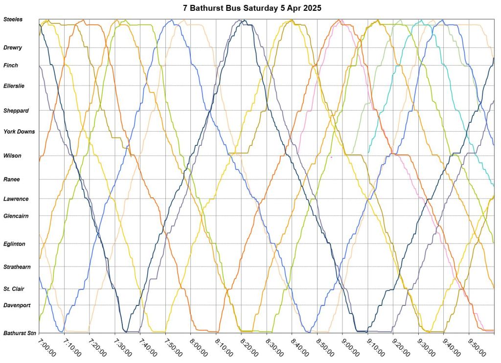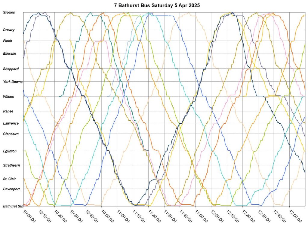 TTC measures service quality at terminals. The official Service Standards call for departures no earlier than 1 minute and no later than 5 minutes relative to the schedule. On 7 Bathurst with a 10-minute headway all day long, buses should appear on a pattern every 0-10-20-30-40-50 minutes past the hour, but could actually be at 5-9-25-29-45-49 and be “on time” for quality measurements.
