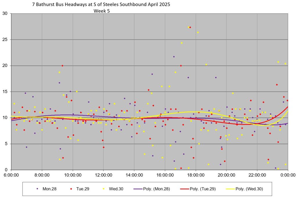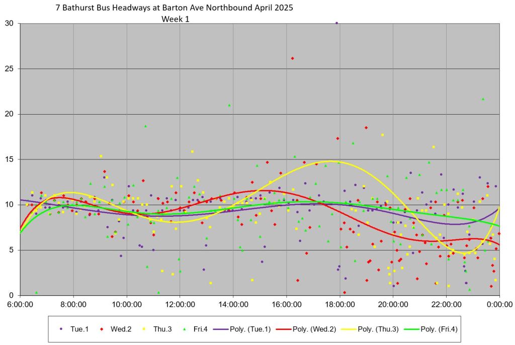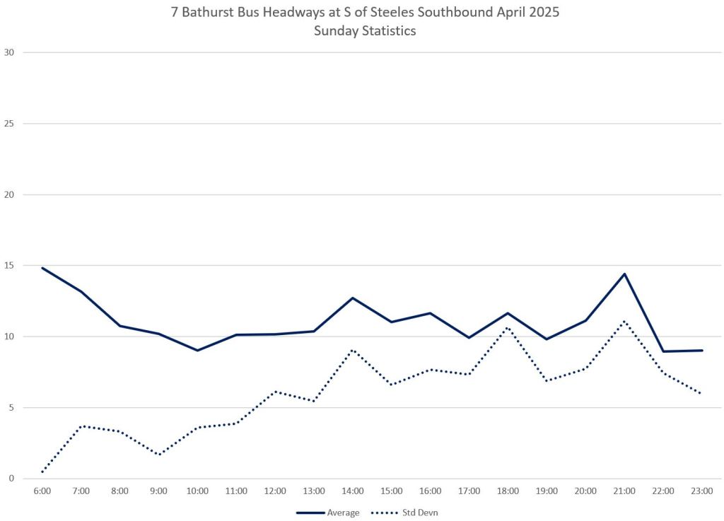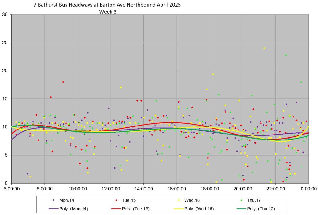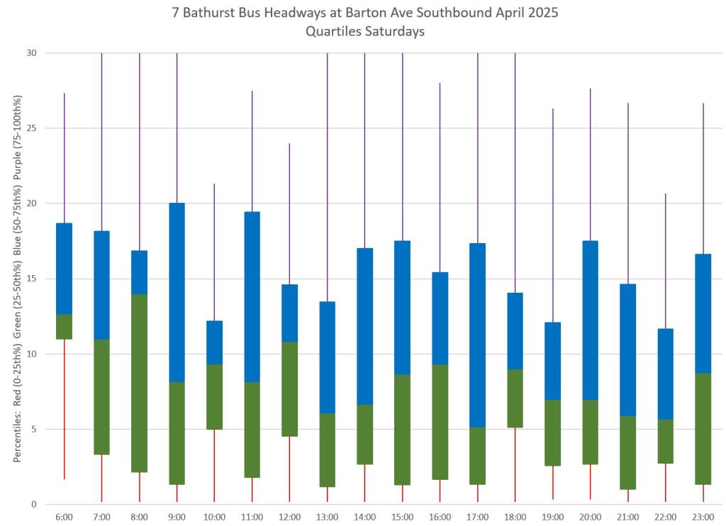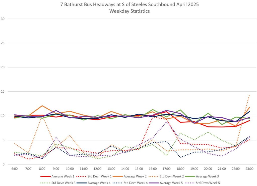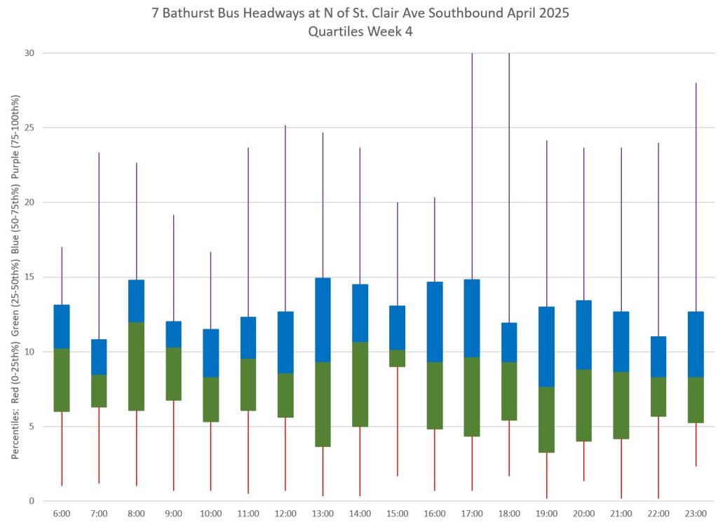 TTC measures service quality at terminals. The official Service Standards call for departures no earlier than 1 minute and no later than 5 minutes relative to the schedule. On 7 Bathurst with a 10-minute headway all day long, buses should appear on a pattern every 0-10-20-30-40-50 minutes past the hour, but could actually be at 5-9-25-29-45-49 and be “on time” for quality measurements.