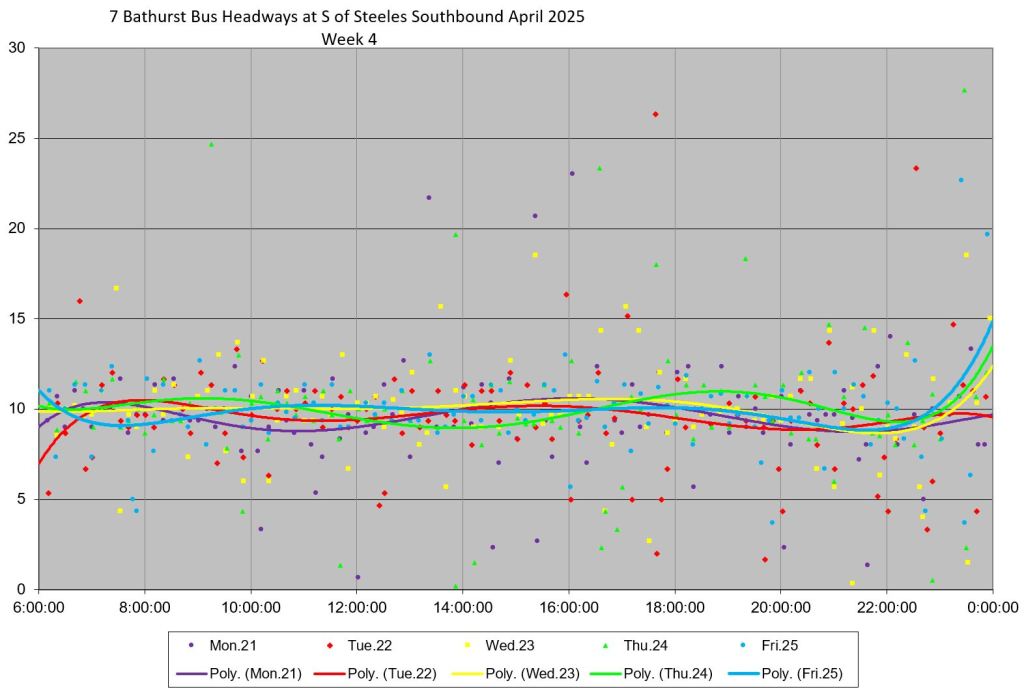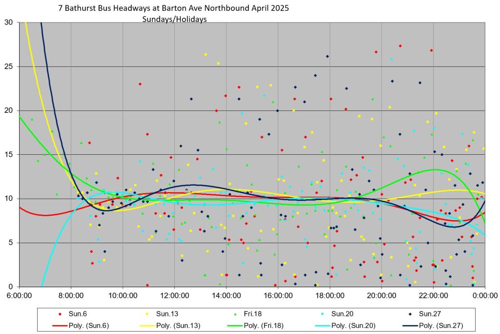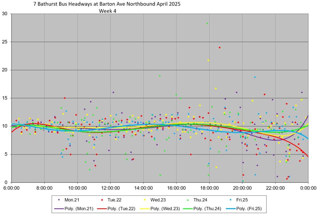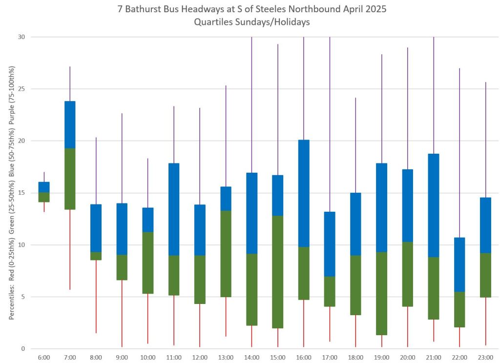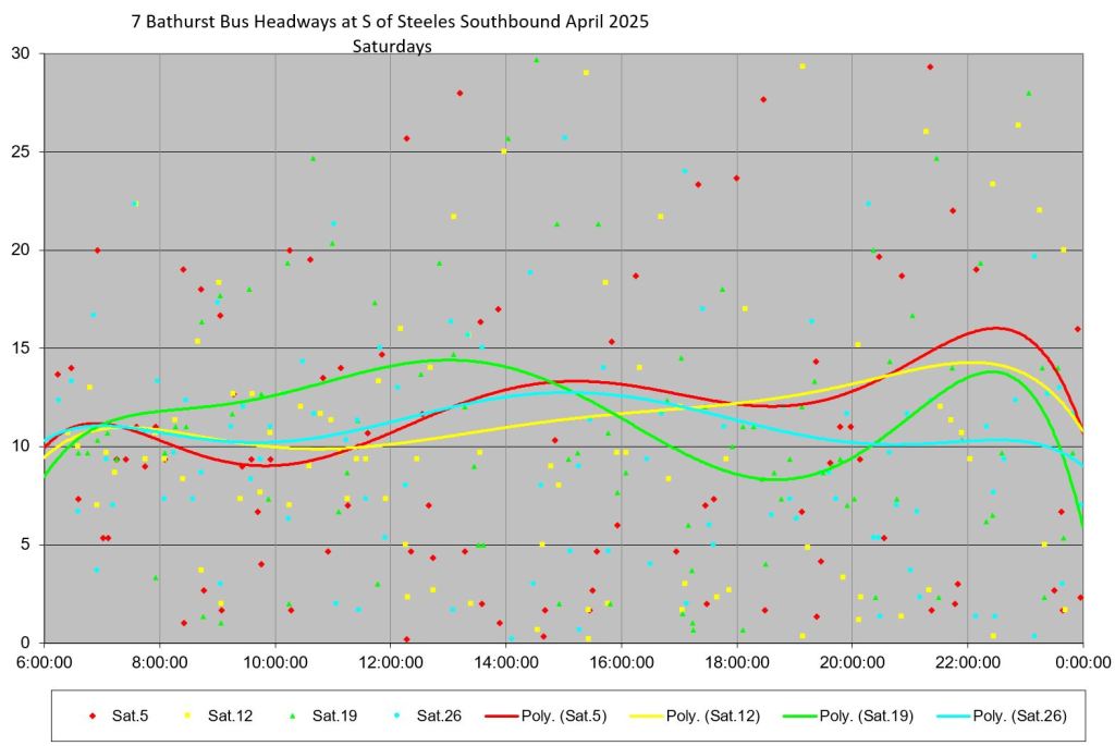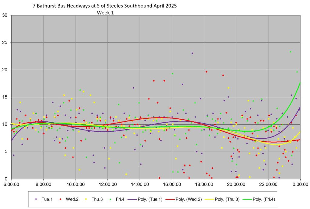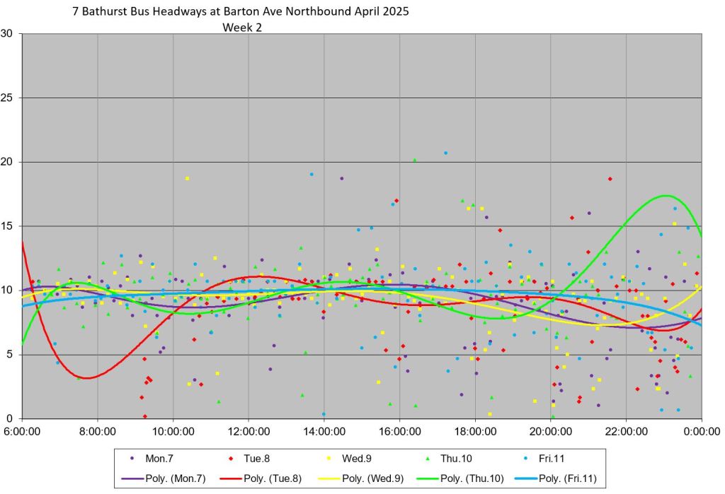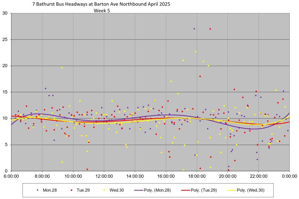 TTC measures service quality at terminals. The official Service Standards call for departures no earlier than 1 minute and no later than 5 minutes relative to the schedule. On 7 Bathurst with a 10-minute headway all day long, buses should appear on a pattern every 0-10-20-30-40-50 minutes past the hour, but could actually be at 5-9-25-29-45-49 and be “on time” for quality measurements.