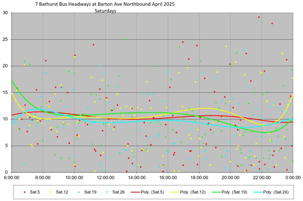 The values shown are the spacings between buses, and there is no attempt to reconcile the actual times with the schedule. This is a “rider’s eye” view of the service.