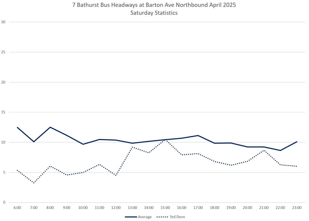 Weekends on Bathurst have far worse service than weekdays, although they have the same scheduled frequency. Average headways do not always sit at 10 minutes, and the standard deviation values are also higher ranging to and beyond ten minutes.