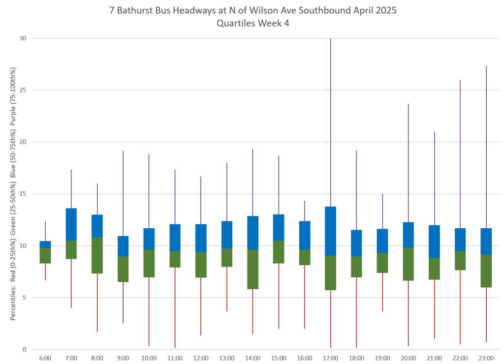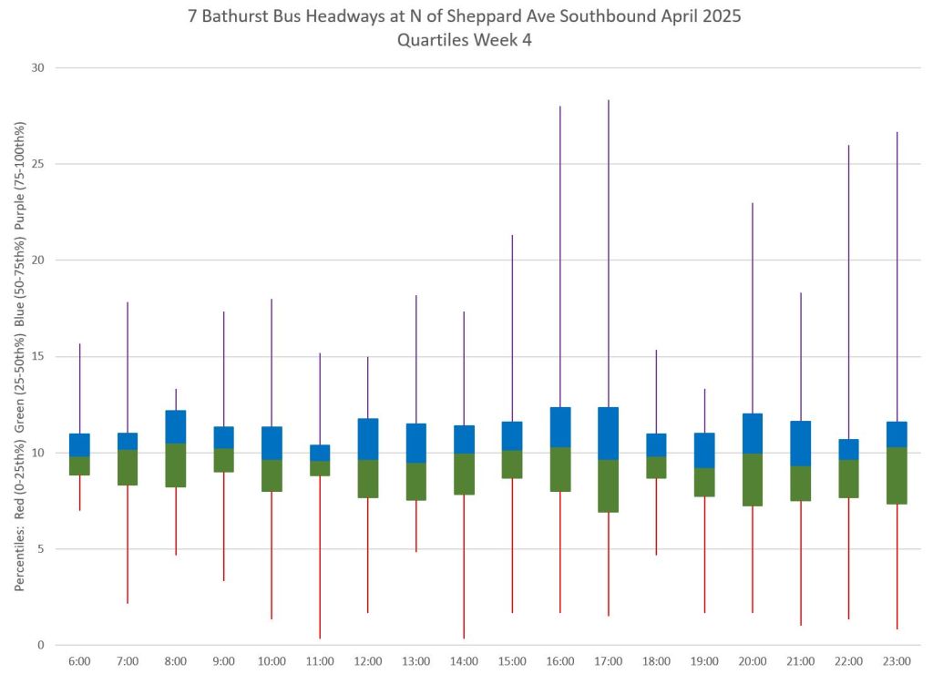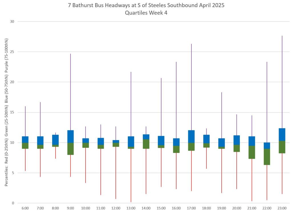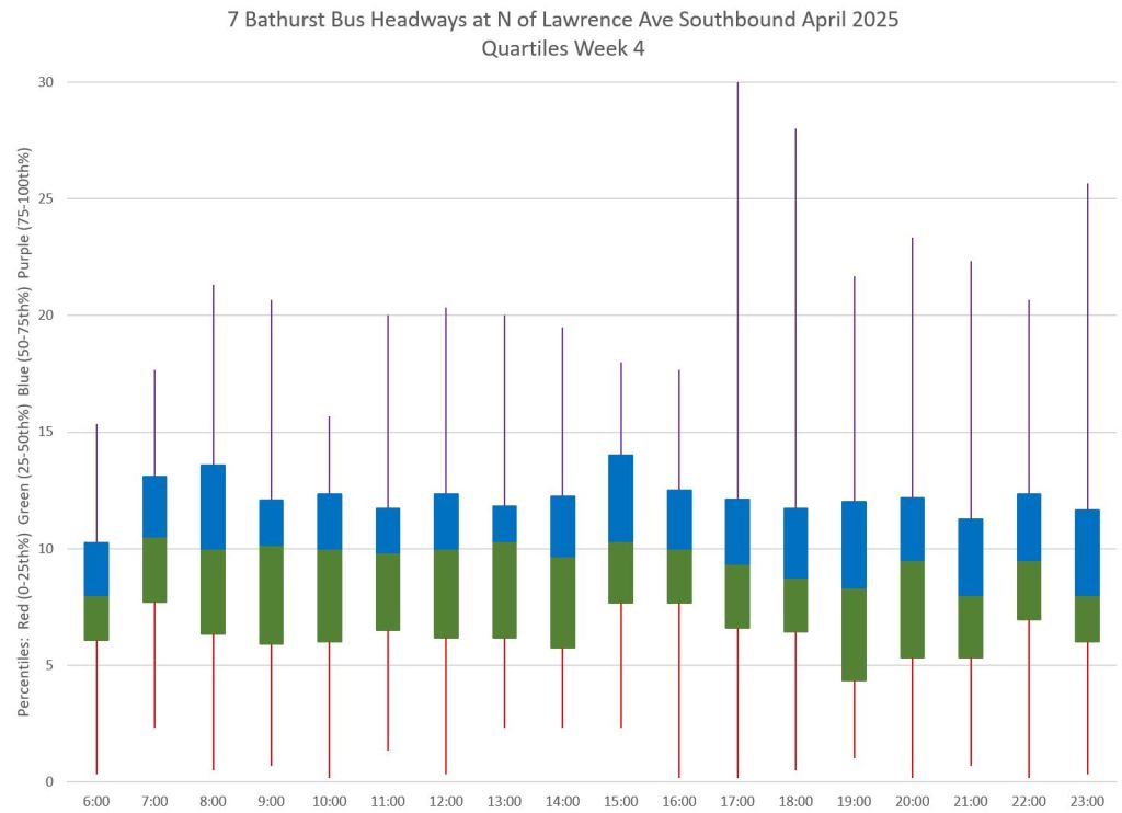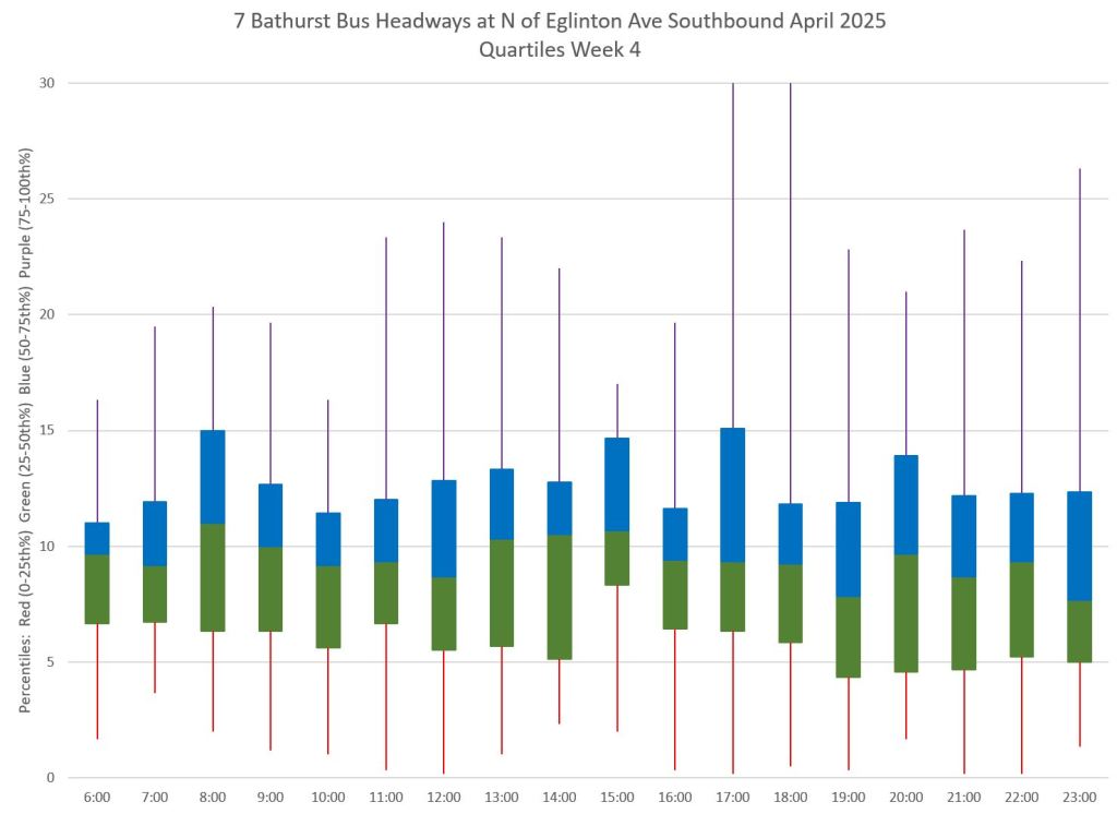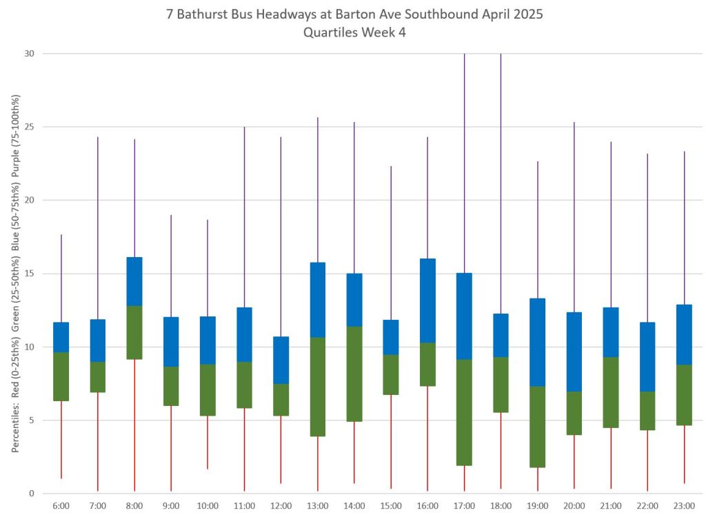 Each hour’s data is summarized by quartiles so that the segments represent one quarter of the headways within each hour. Ideally these should be as compact as possible indicating that most headways lie within a small distance of the median (which in turn tends to sit at 10 minutes, but can be skewed downward by a preponderance of short headways and comparatively few long ones).