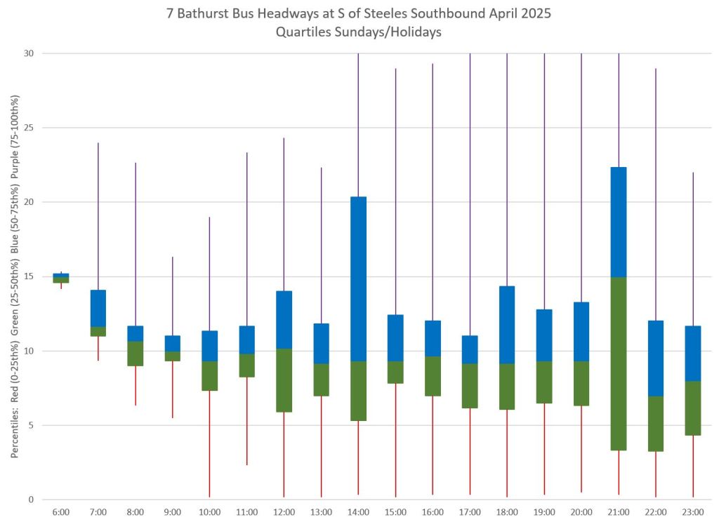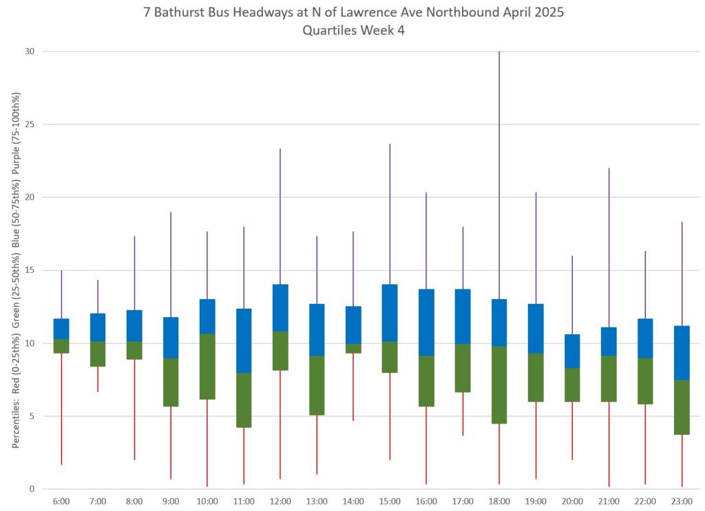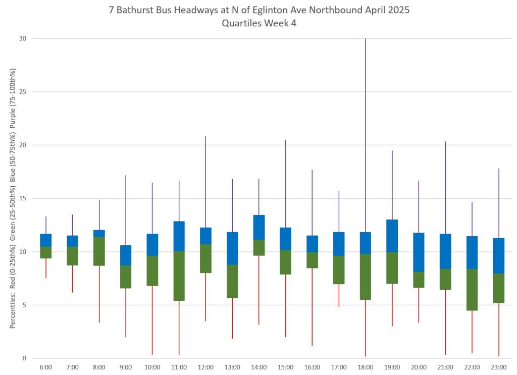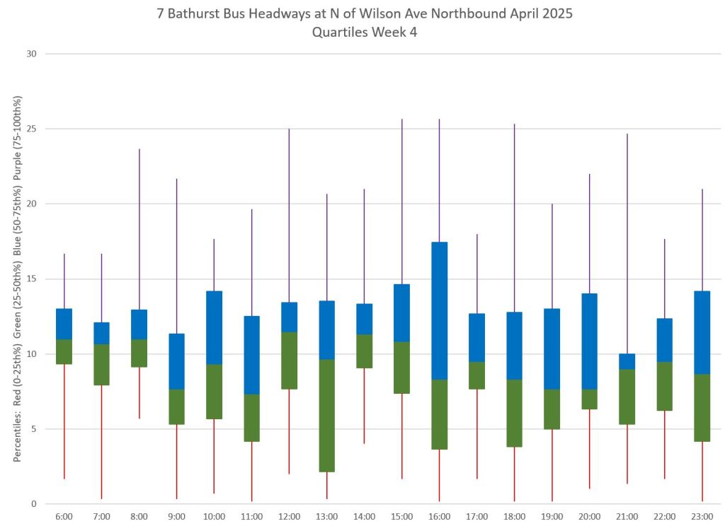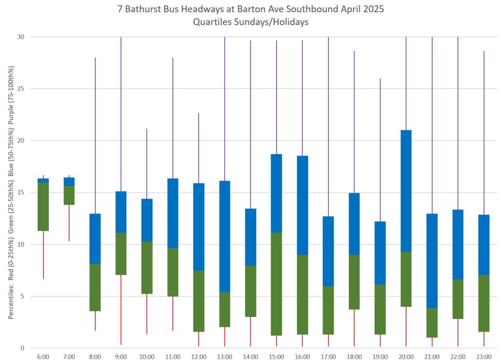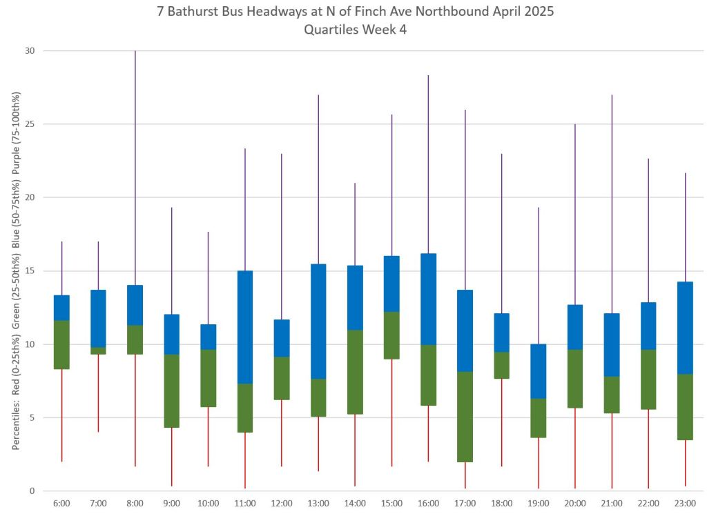 Each hour’s data is summarized by quartiles so that the segments represent one quarter of the headways within each hour. Ideally these should be as compact as possible indicating that most headways lie within a small distance of the median (which in turn tends to sit at 10 minutes, but can be skewed downward by a preponderance of short headways and comparatively few long ones).