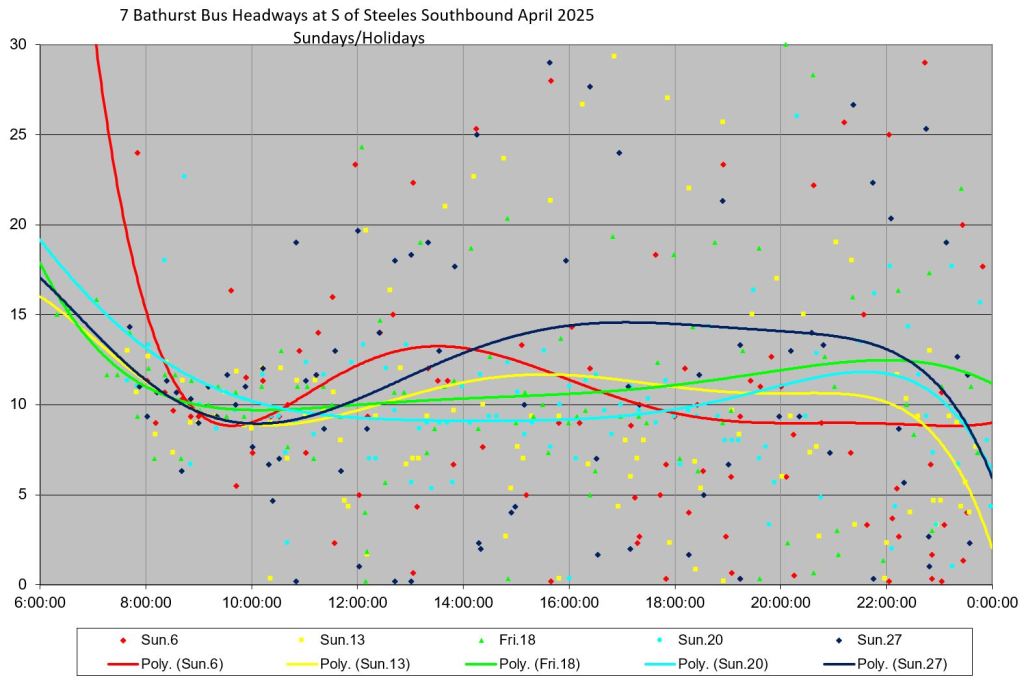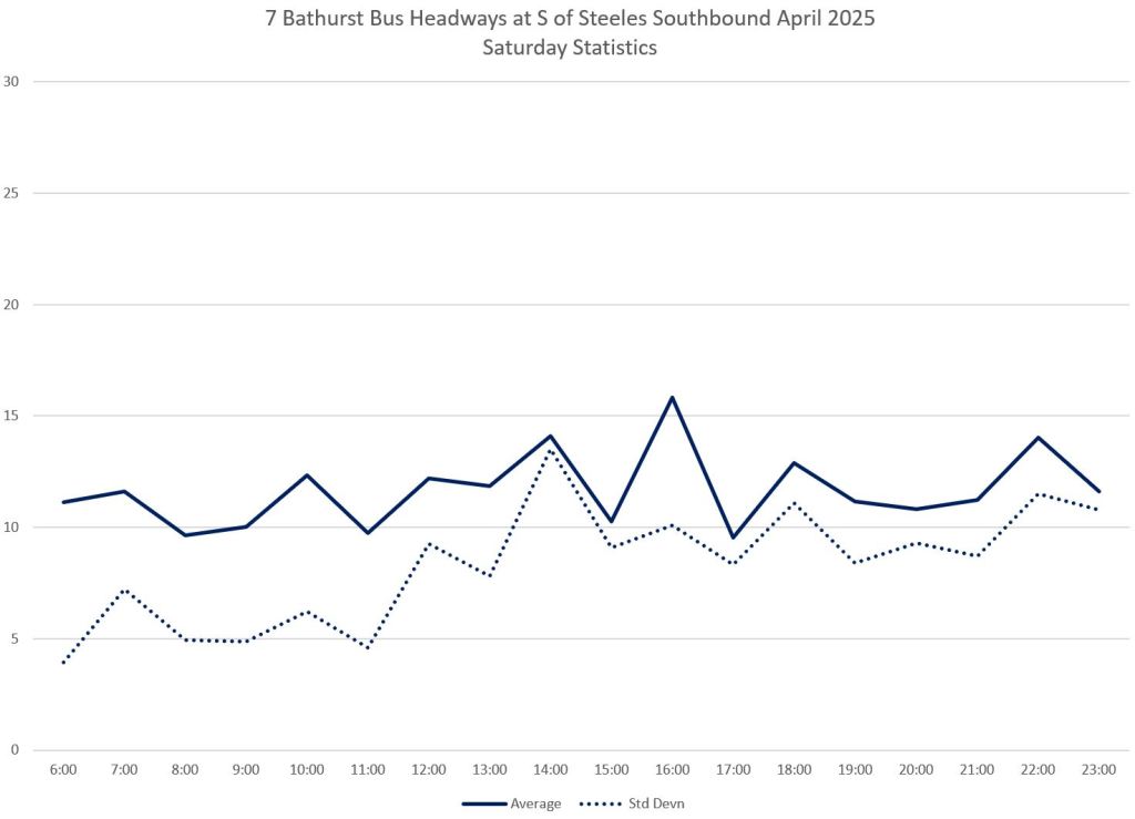 In the detailed review, it is clear that weekend service on 7 Bathurst is much less reliable than weekdays. In the tables below, note that scheduled travel times are considerably less on weekends than weekday midday and early evening. This is reflected in shorter terminal layovers and many more short turns on weekends.