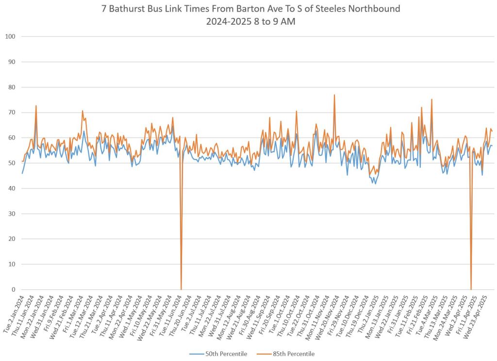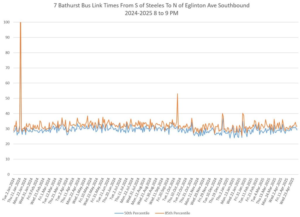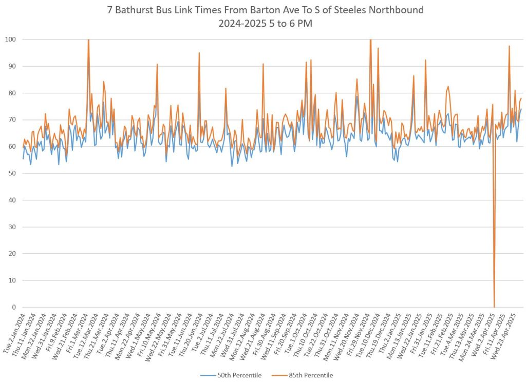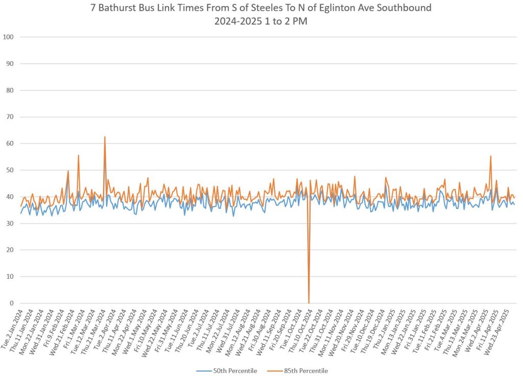 Steve: I am going to update Part II, the Travel Times article, with info about the length of time buses sit at Steeles and at Bathurst Station. Stay tuned.