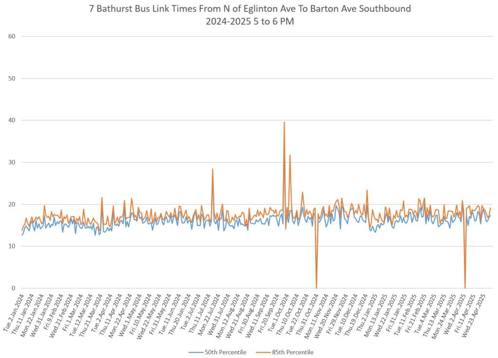 The 85th percentile values at Eglinton are higher than at Barton Street showing the effect of bunching and gaps evolving along the route, notably in the 5-6pm data. (This was shown in more detail in Part I.) This behaviour is consistent over the 16 months shown.