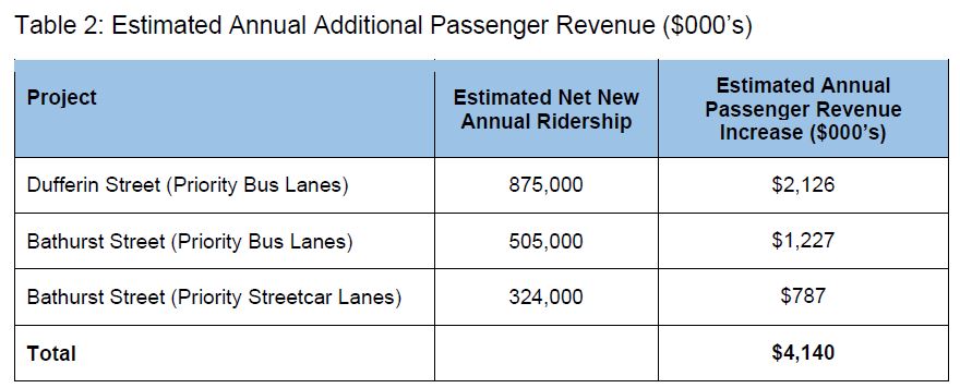 It is anticipated that any savings will be re-invested into Dufferin Street and Bathurst Street, to further enhance service in support of anticipated ridership increases. Any anticipated additional passenger revenue will be reflected in future Operating budgets accordingly. [p. 4]