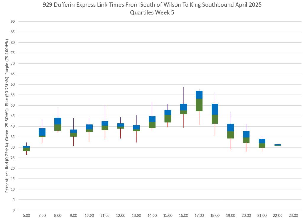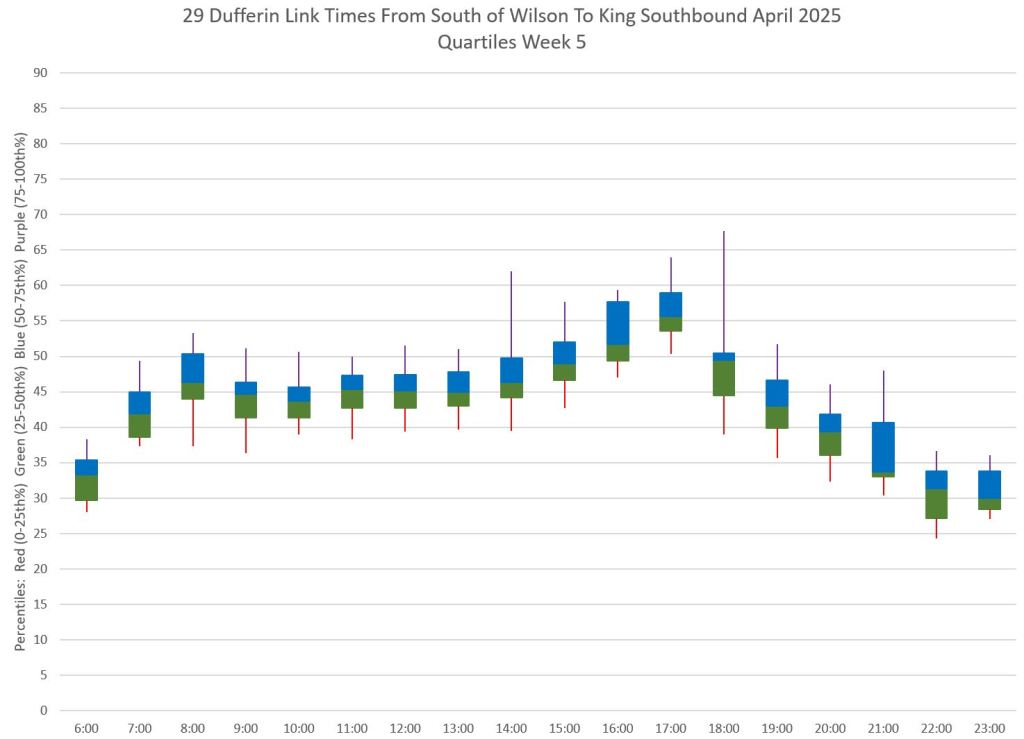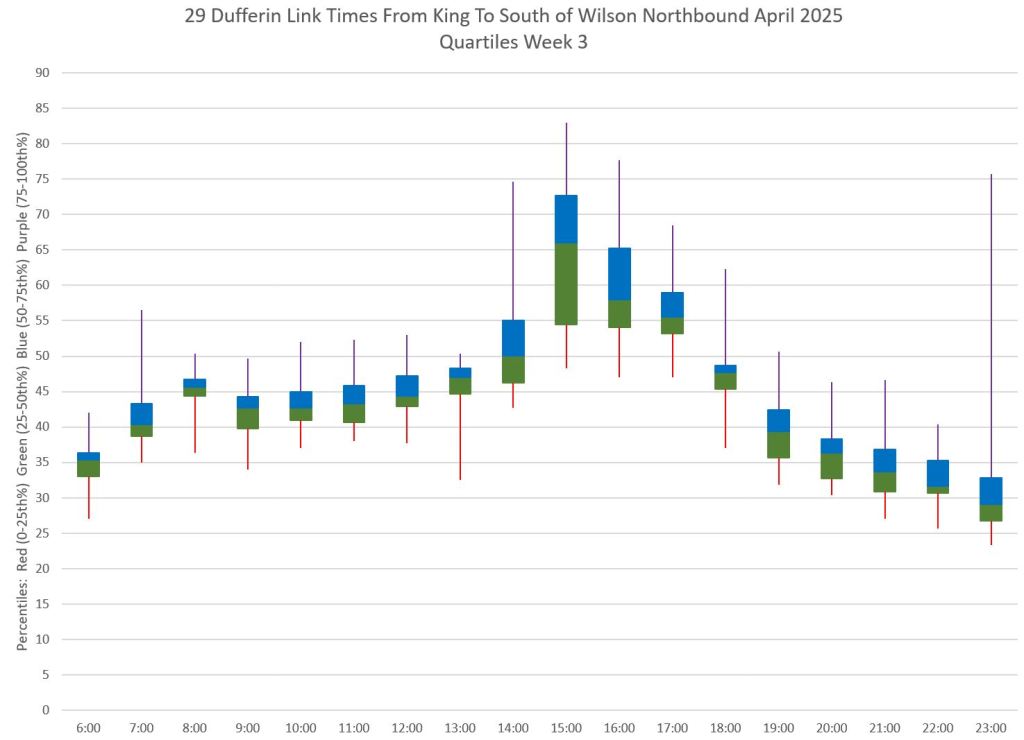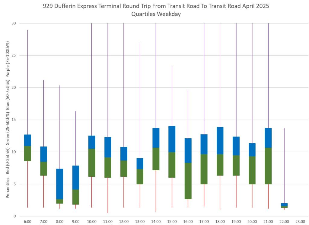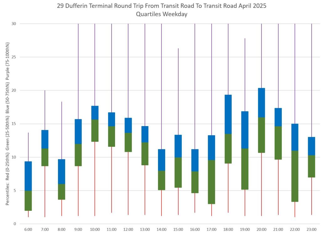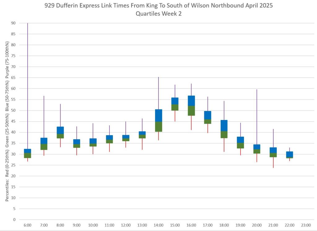 This article is Part II of my review of service quality on the 29/929 Dufferin routes in April 2025. Part I covered headways (the interval between buses) while this part looks at travel times. Part III will review historic data going back to January 2024.