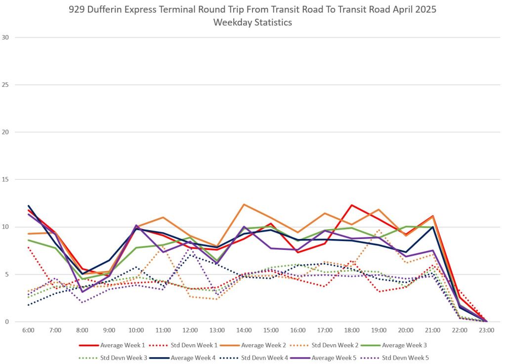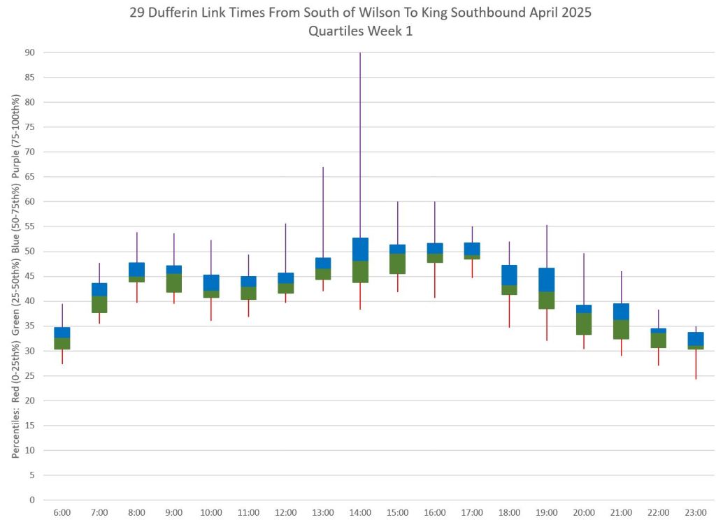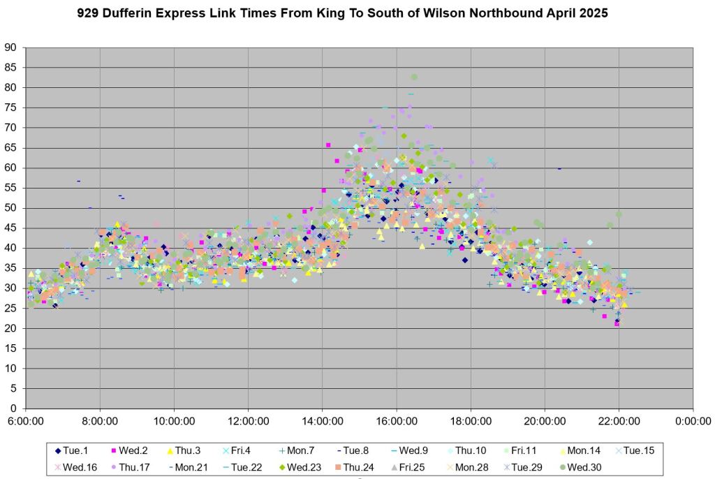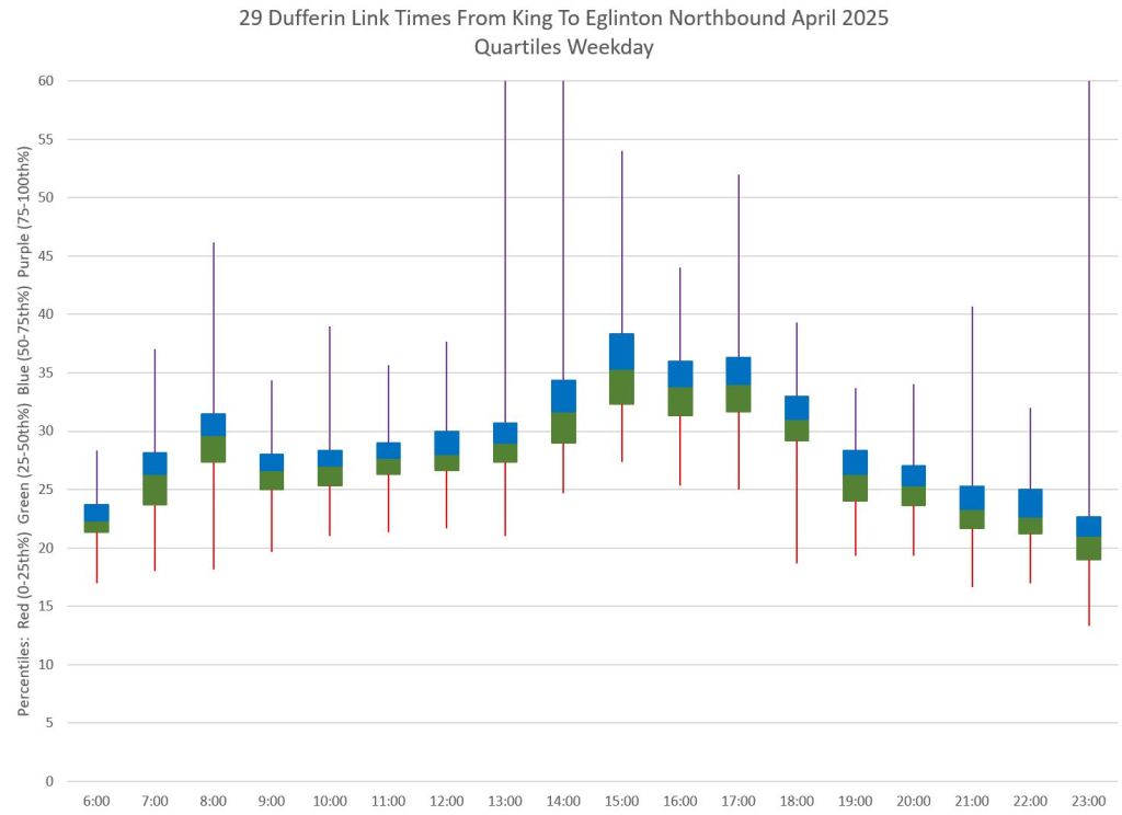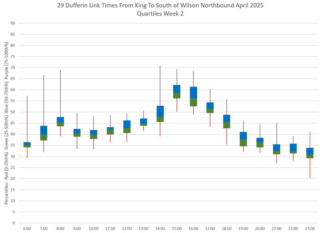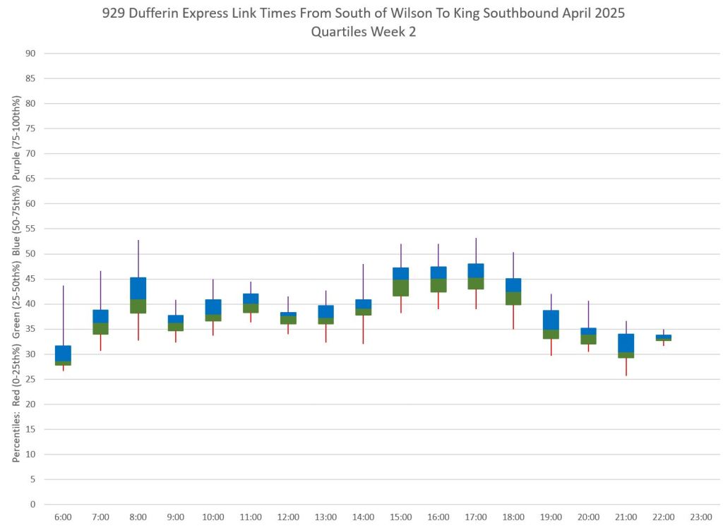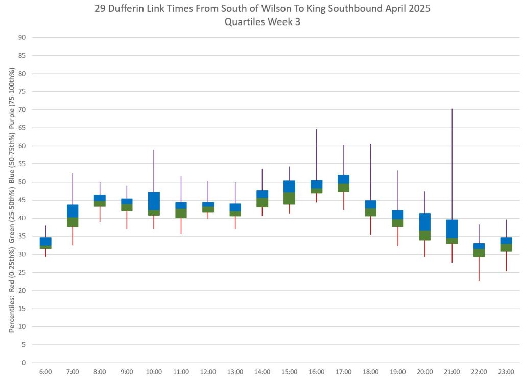 This article is Part II of my review of service quality on the 29/929 Dufferin routes in April 2025. Part I covered headways (the interval between buses) while this part looks at travel times. Part III will review historic data going back to January 2024.