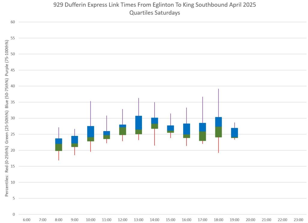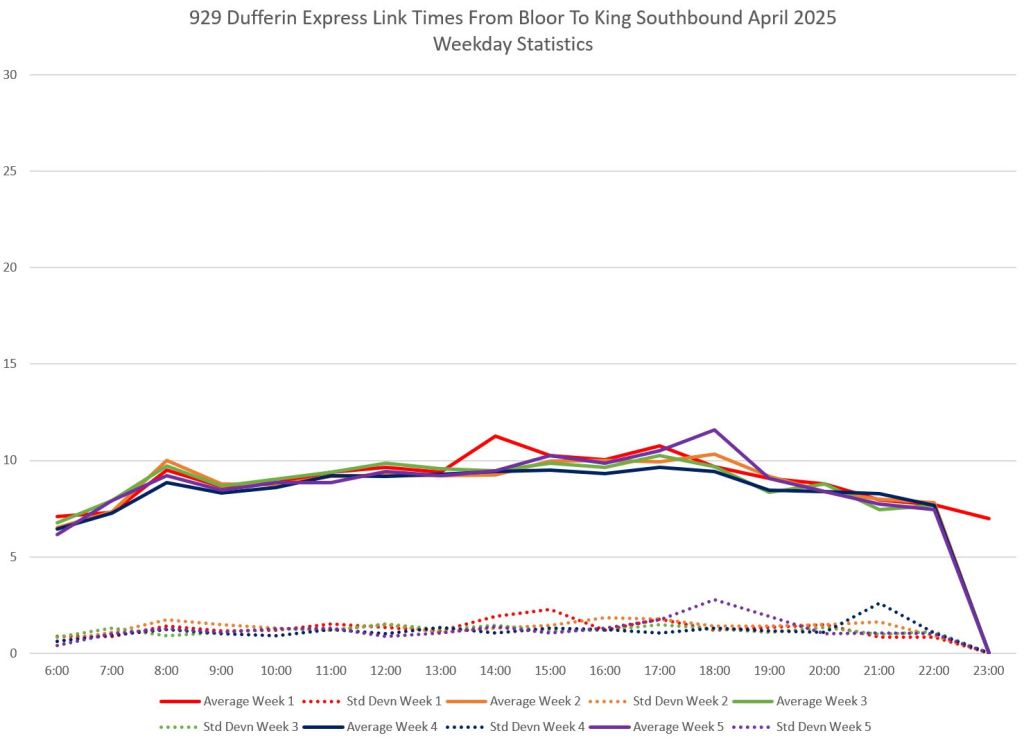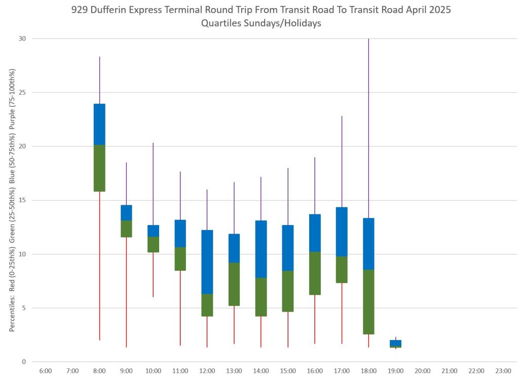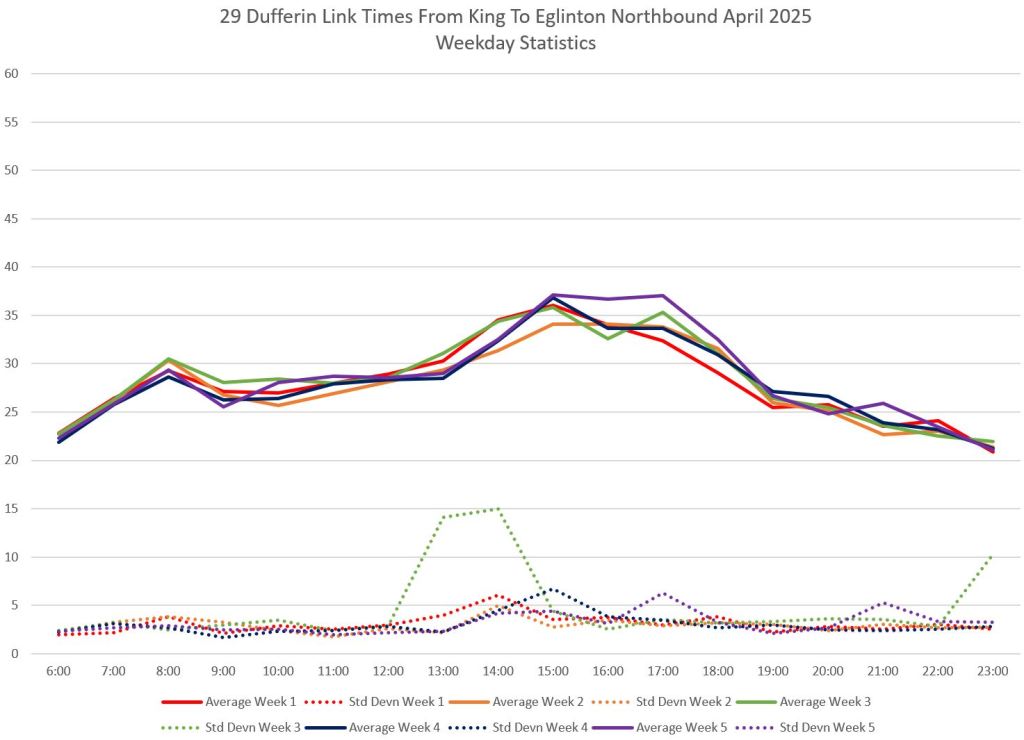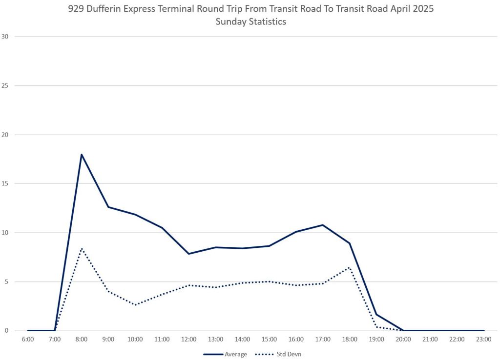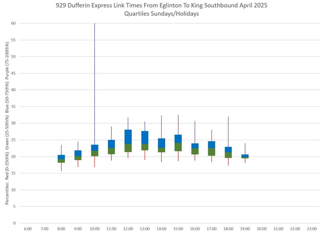 This article is Part II of my review of service quality on the 29/929 Dufferin routes in April 2025. Part I covered headways (the interval between buses) while this part looks at travel times. Part III will review historic data going back to January 2024.