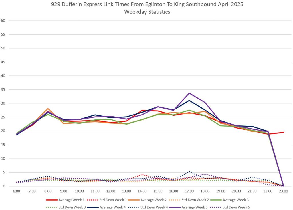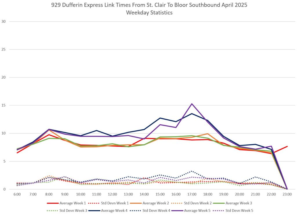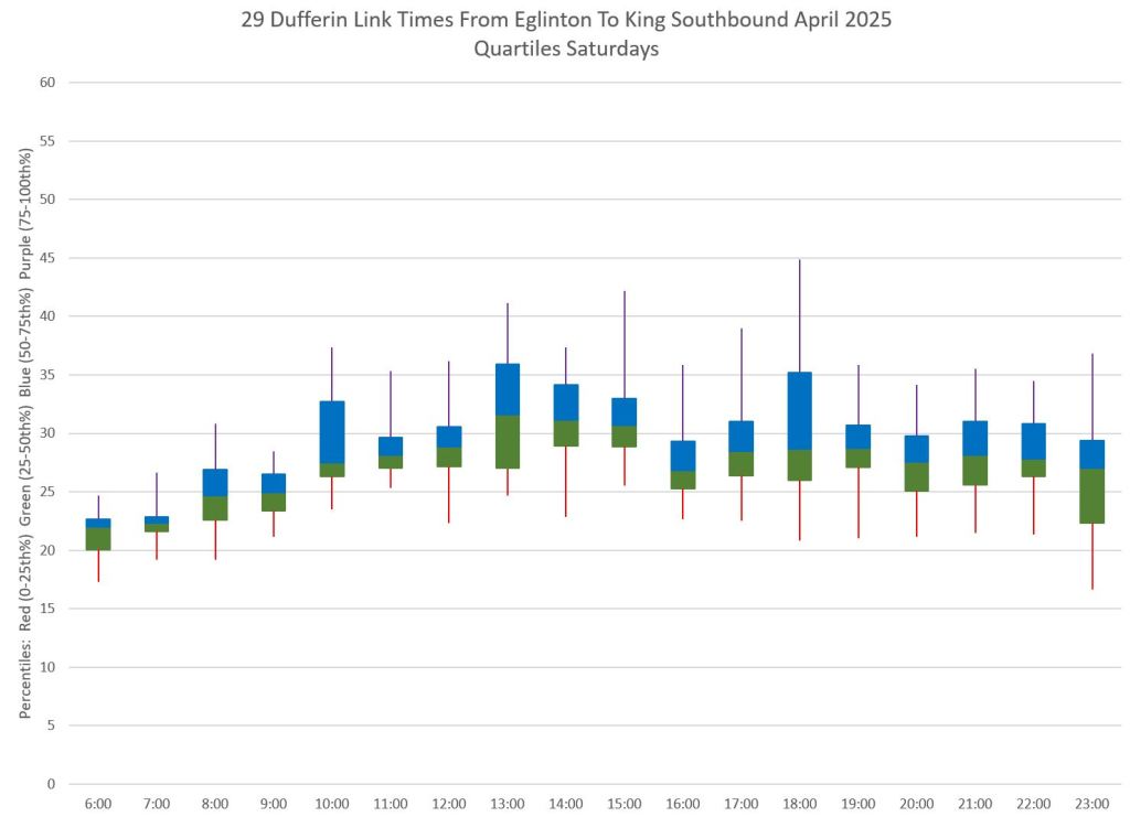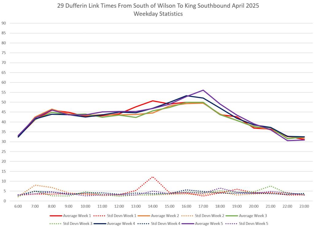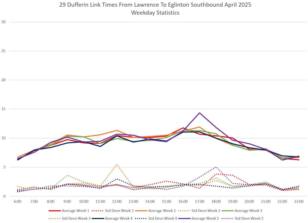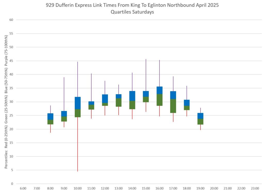 This article is Part II of my review of service quality on the 29/929 Dufferin routes in April 2025. Part I covered headways (the interval between buses) while this part looks at travel times. Part III will review historic data going back to January 2024.