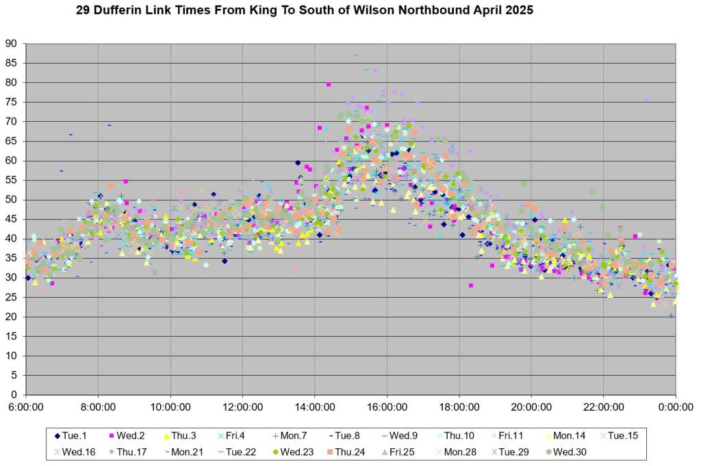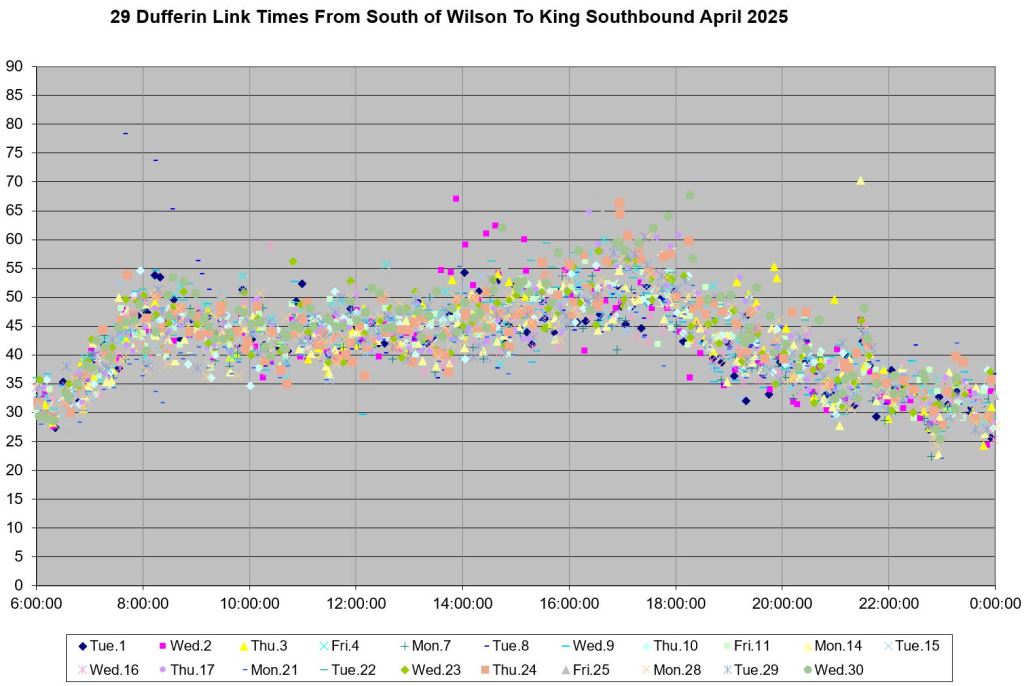 The situation on Dufferin is intriguing because both conditions are evident, and there is a wide range of values. This echoes the variation in travel time over the full route as conditions change from day to day.