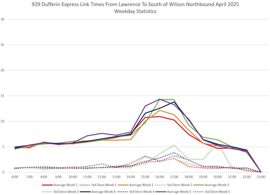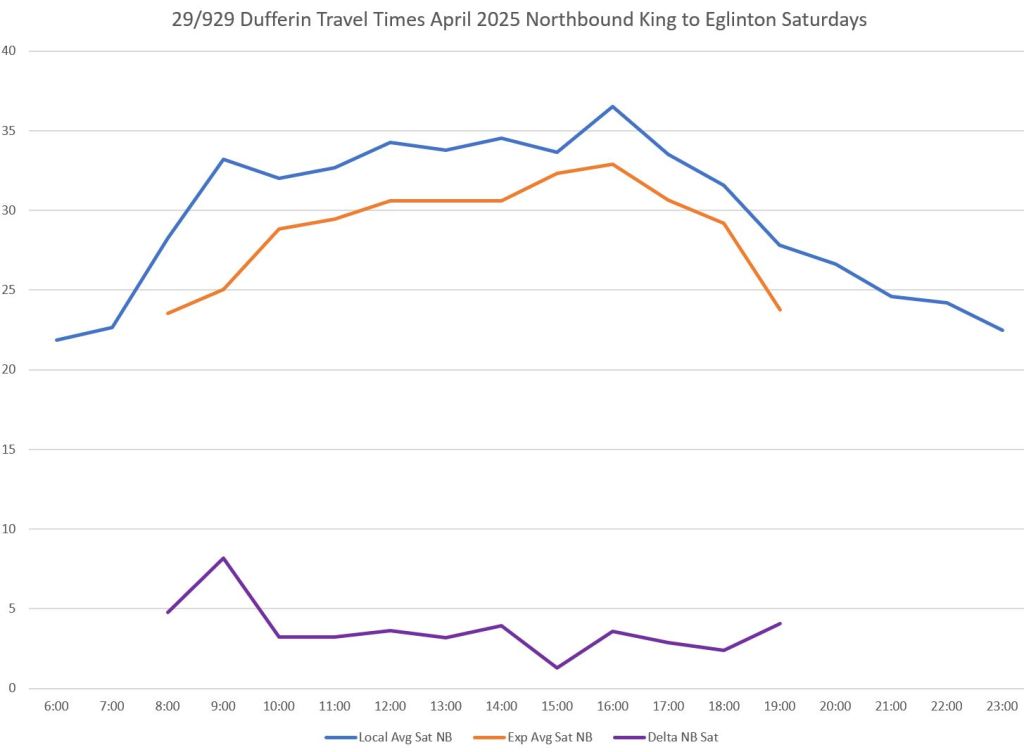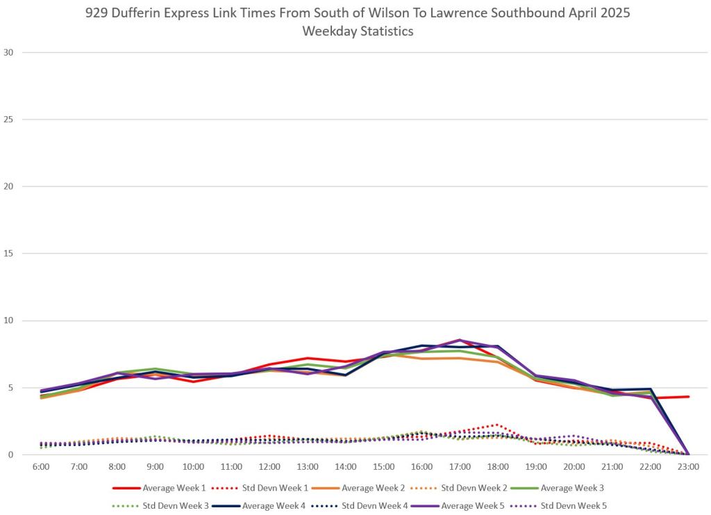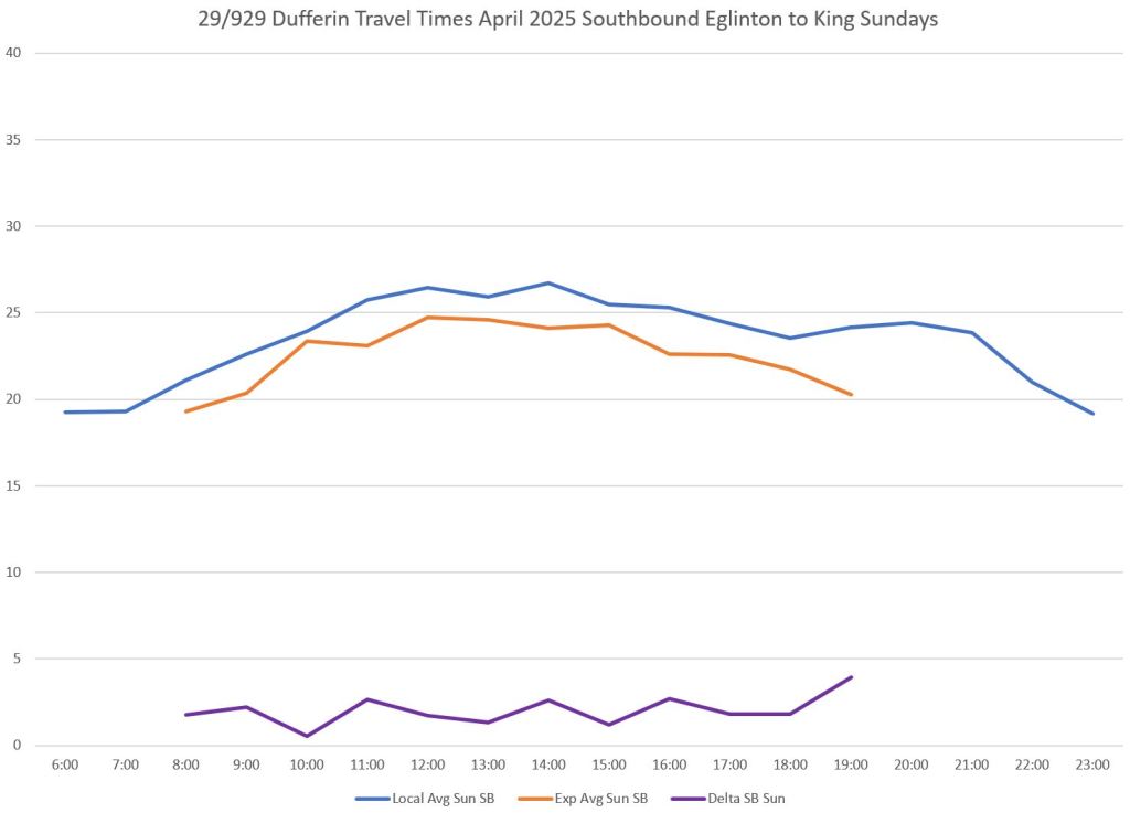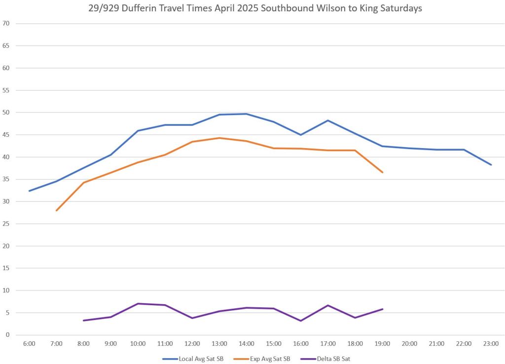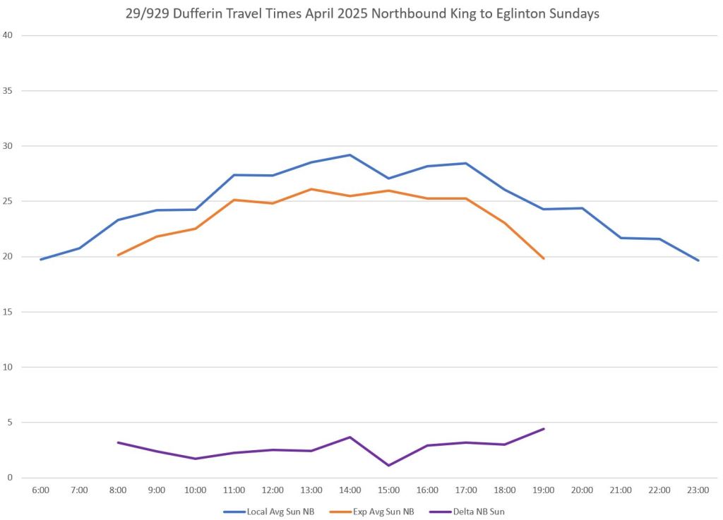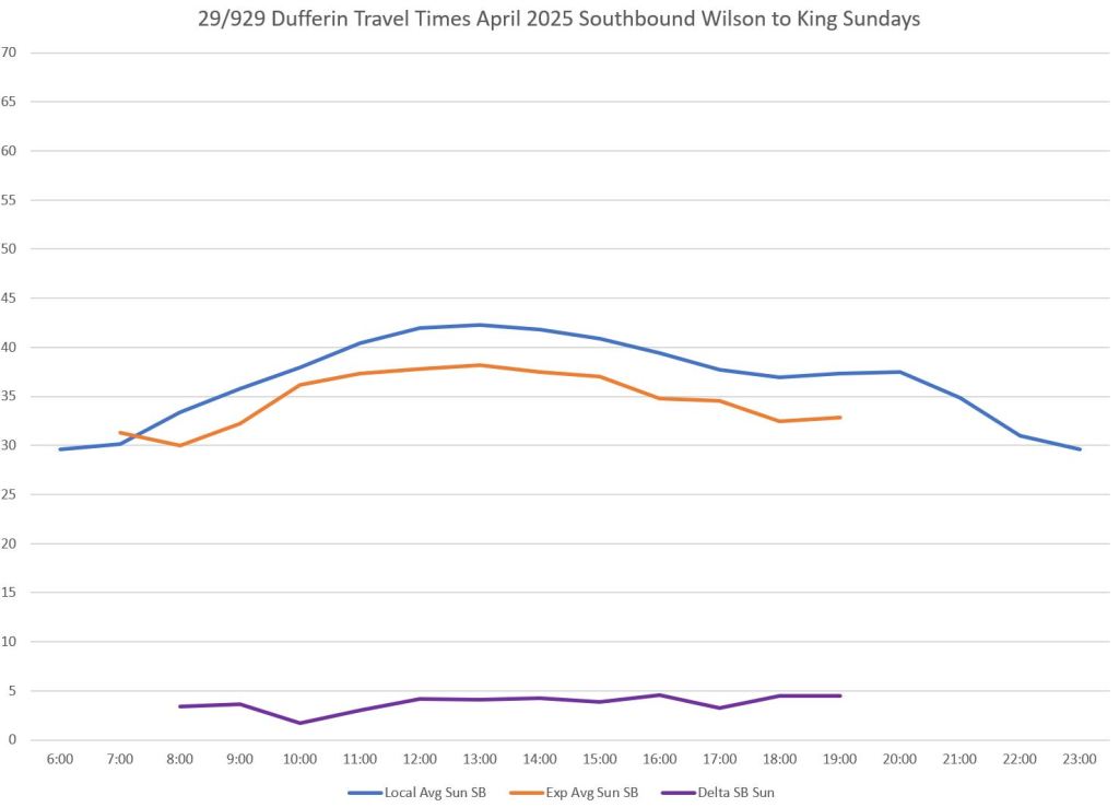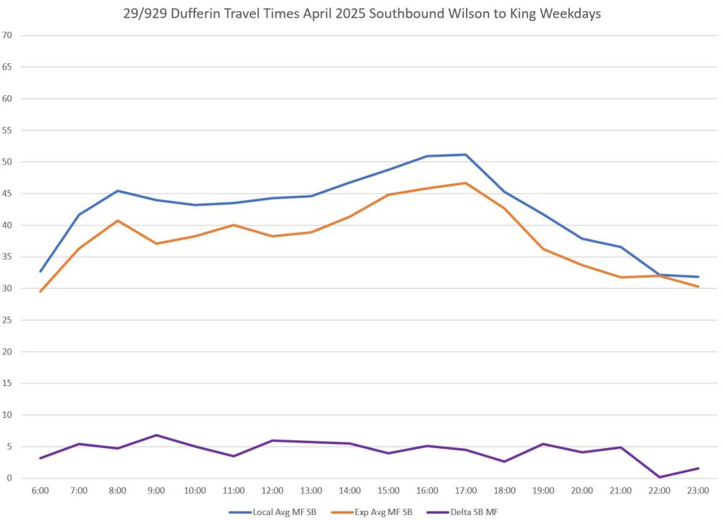 Over the distance between King and Wilson on Dufferin, the difference in average travel times is considerably less than the difference in scheduled times. This gives the 929 express service a tighter schedule with less room for recovery.