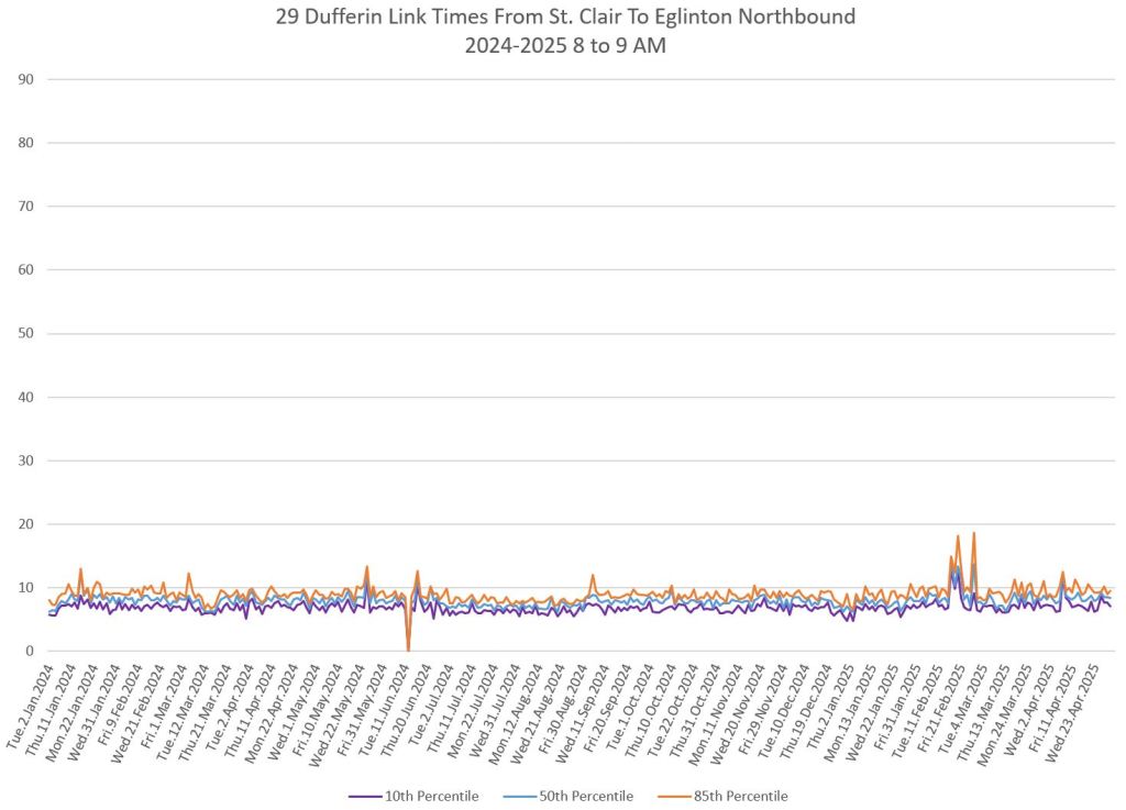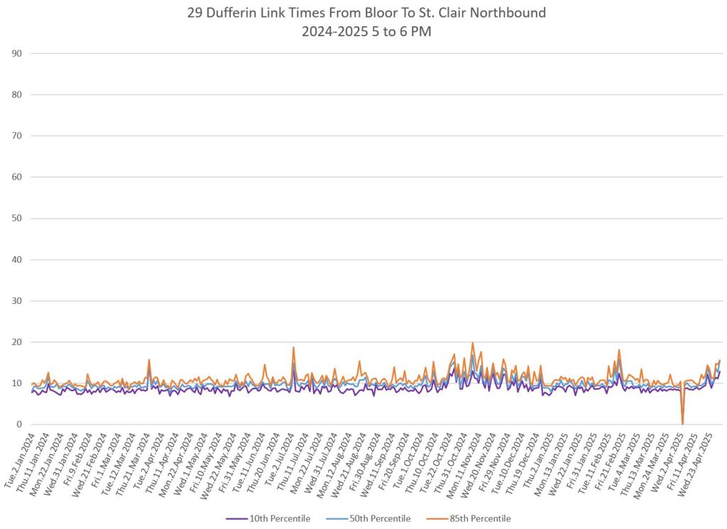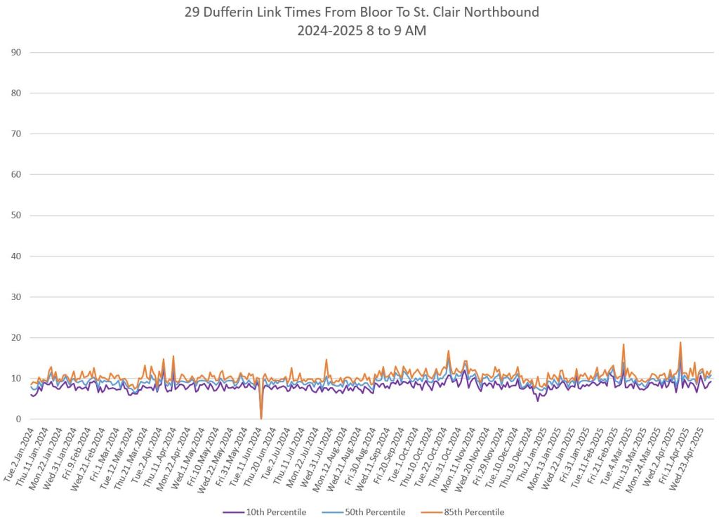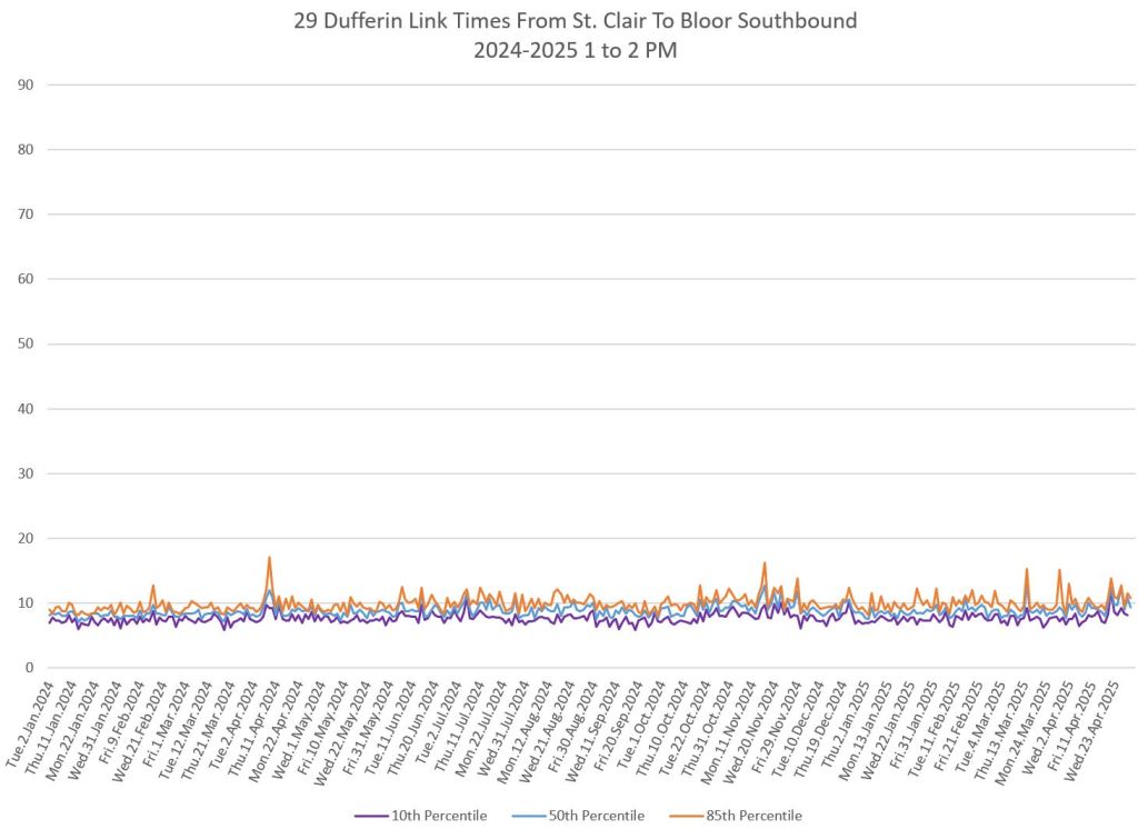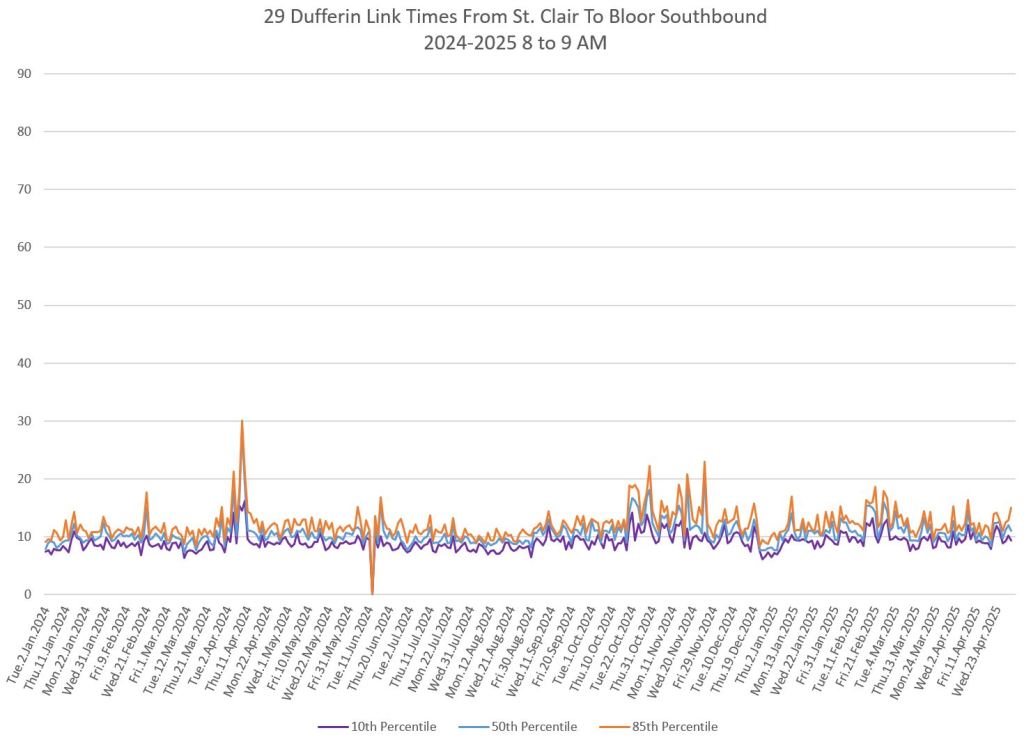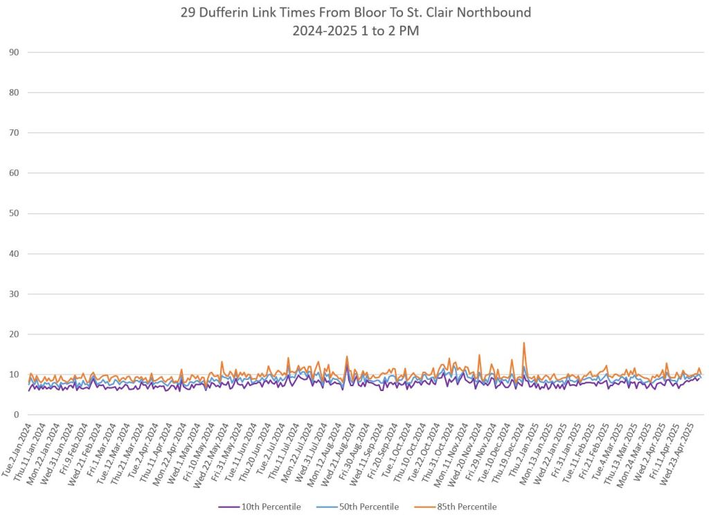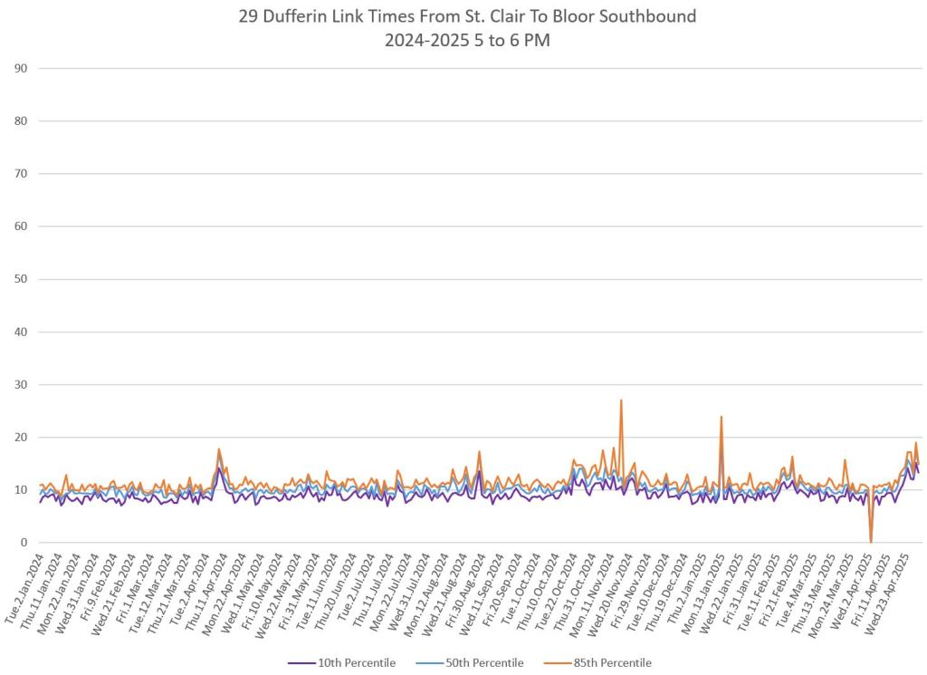 The segment from Bloor to St. Clair shows some variation in travel times during peak periods. Some effect is visible from snow accumulation in 2025. Note, however, that if service is completely blocked, there are no travel times to report.