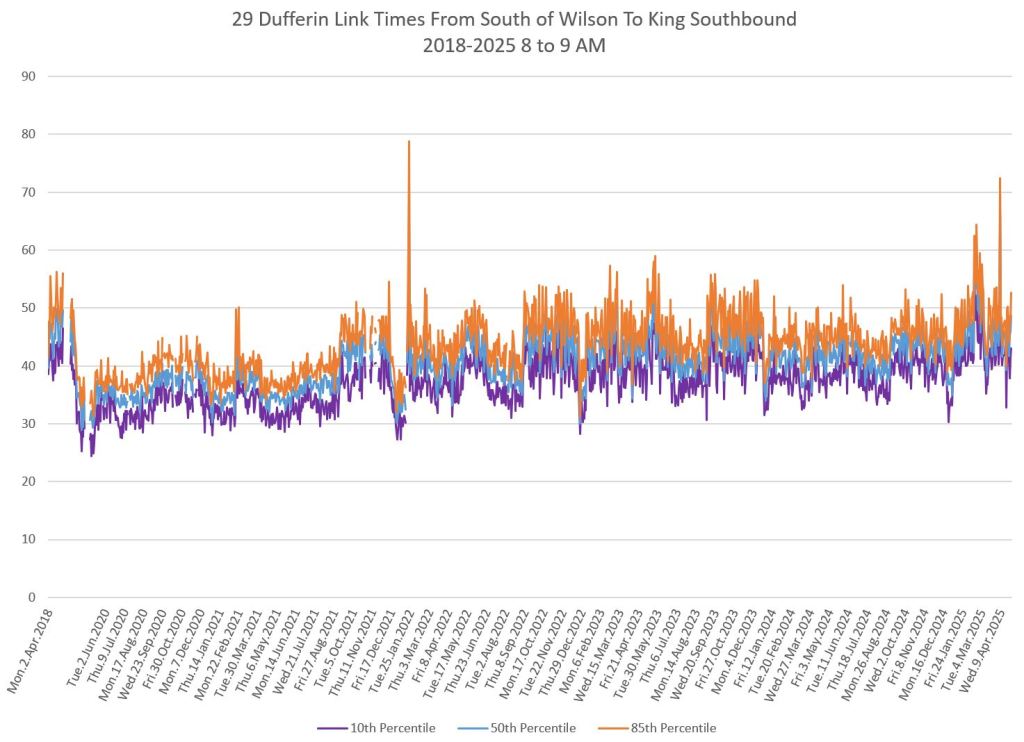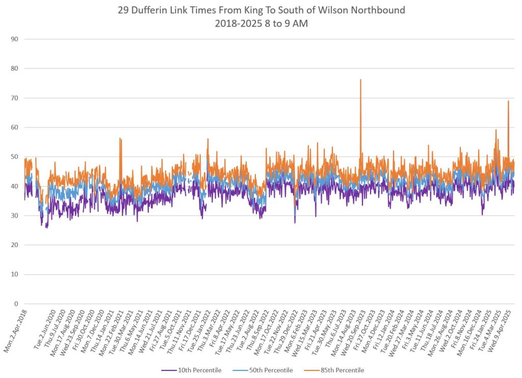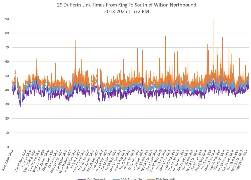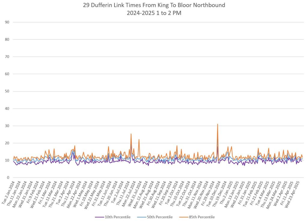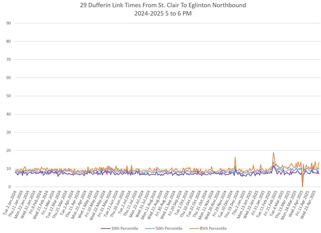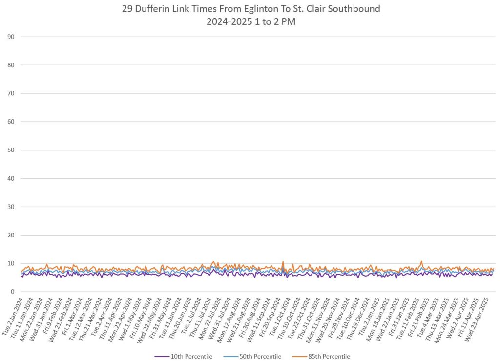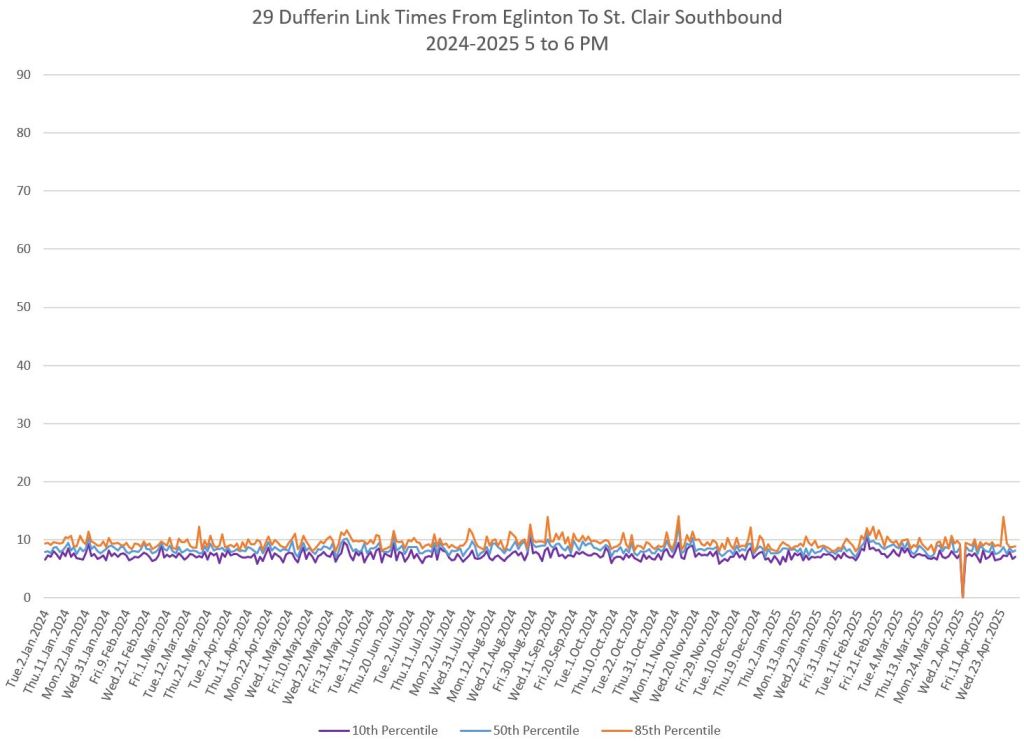 The segment from Bloor to St. Clair shows some variation in travel times during peak periods. Some effect is visible from snow accumulation in 2025. Note, however, that if service is completely blocked, there are no travel times to report.