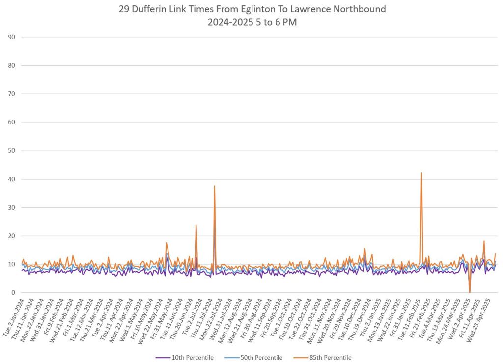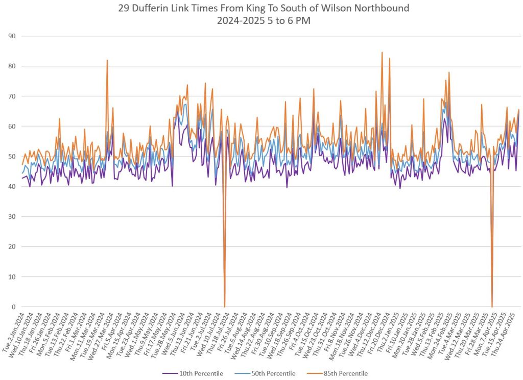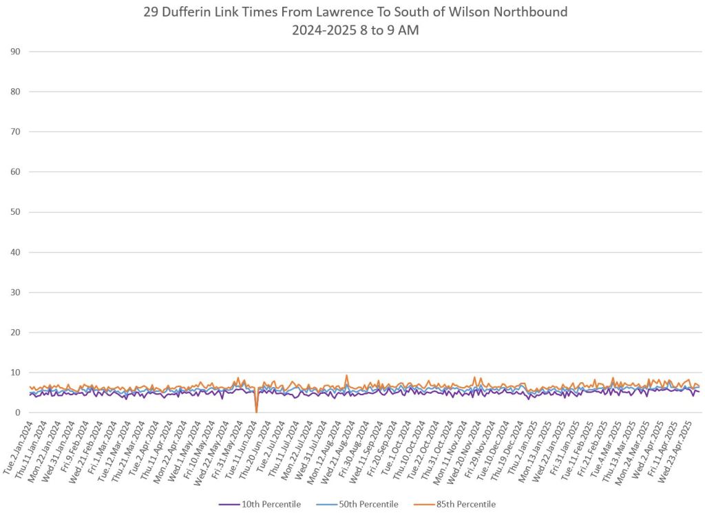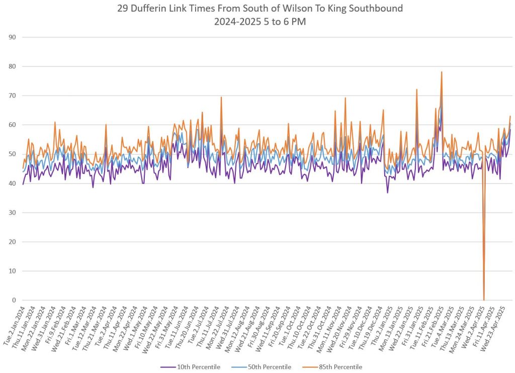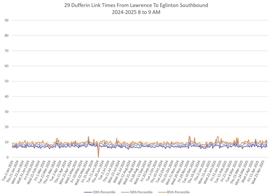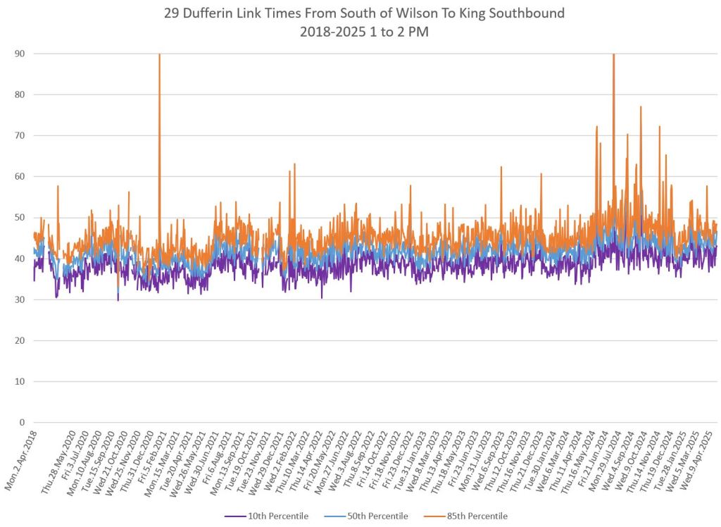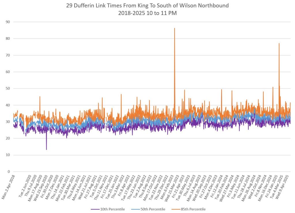 The segment from Bloor to St. Clair shows some variation in travel times during peak periods. Some effect is visible from snow accumulation in 2025. Note, however, that if service is completely blocked, there are no travel times to report.