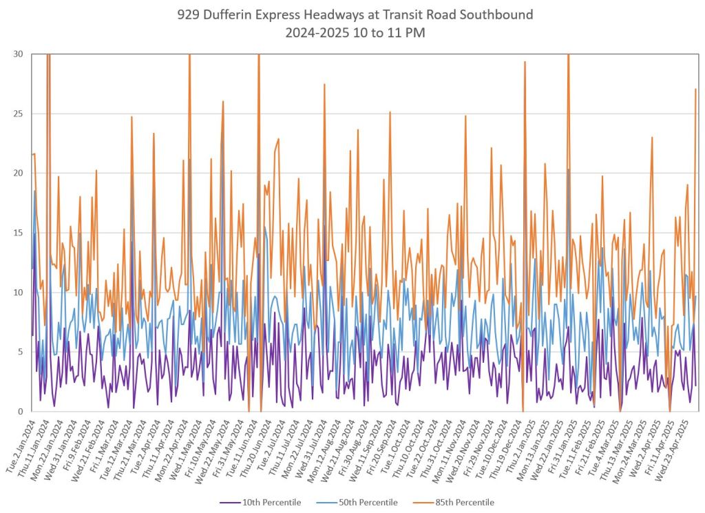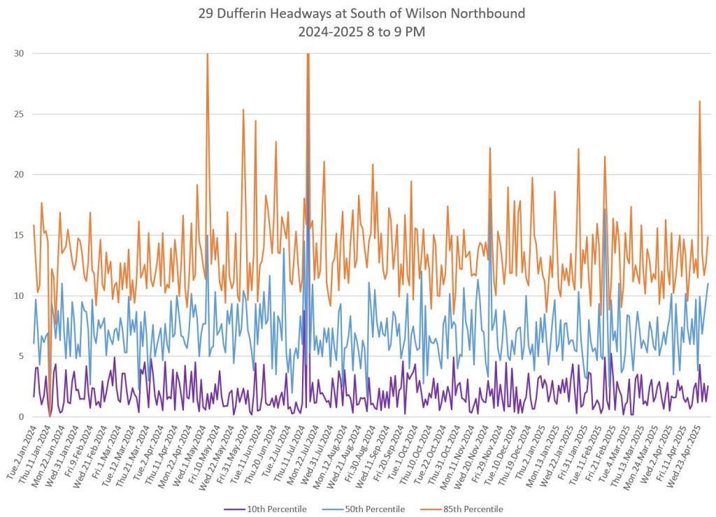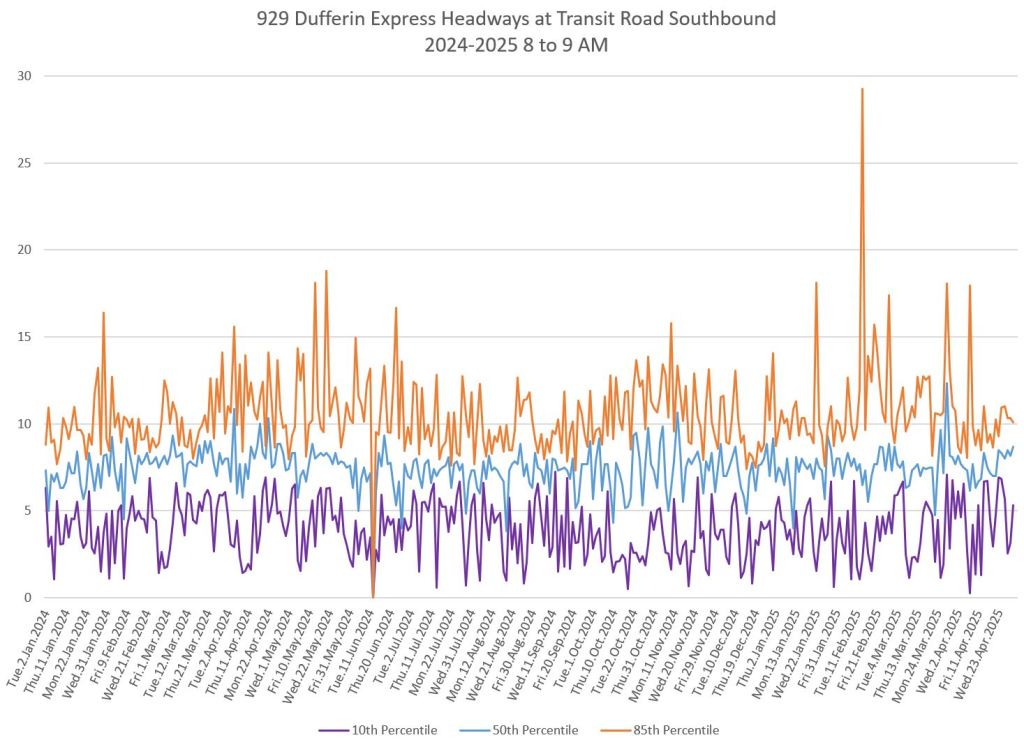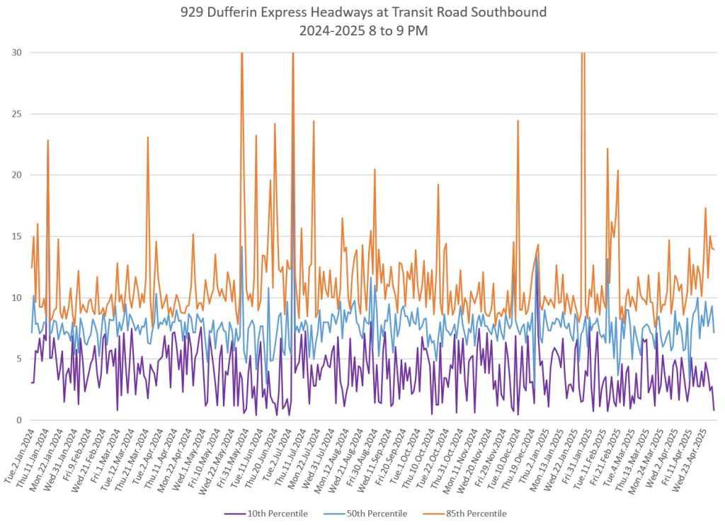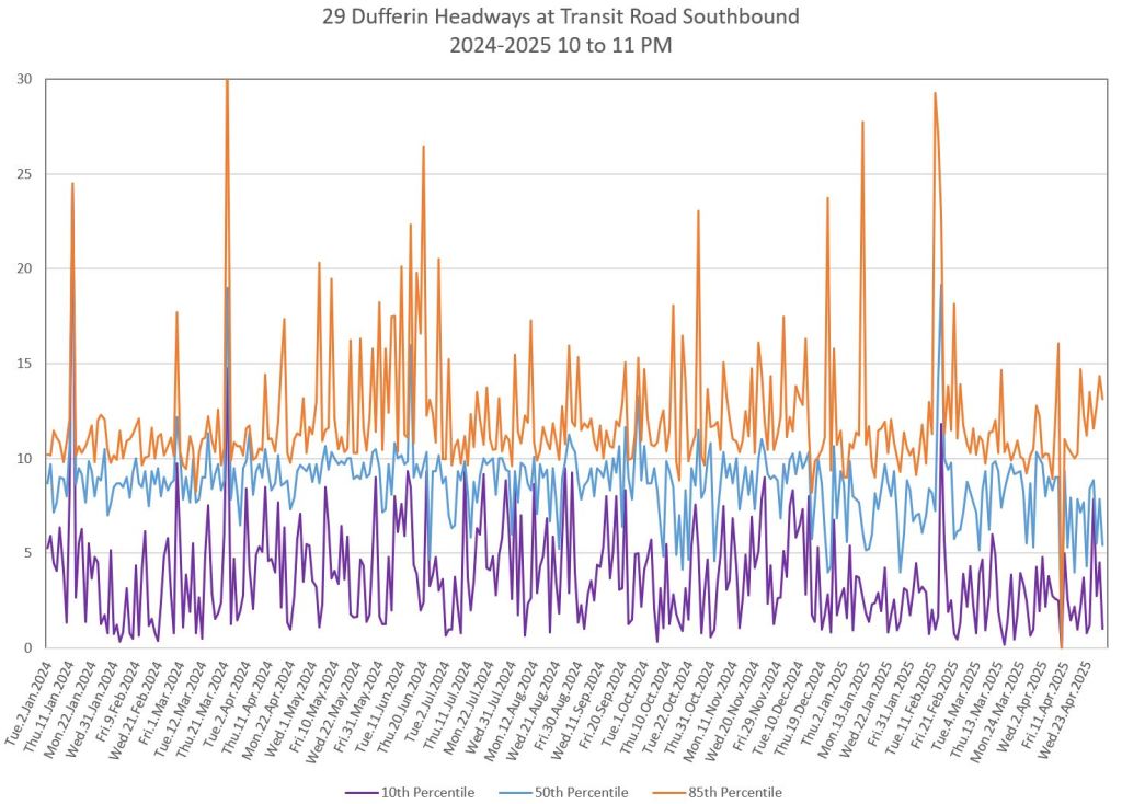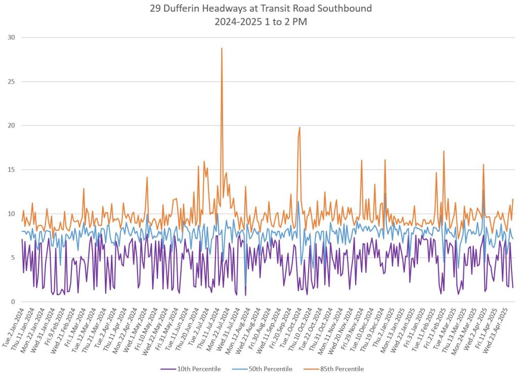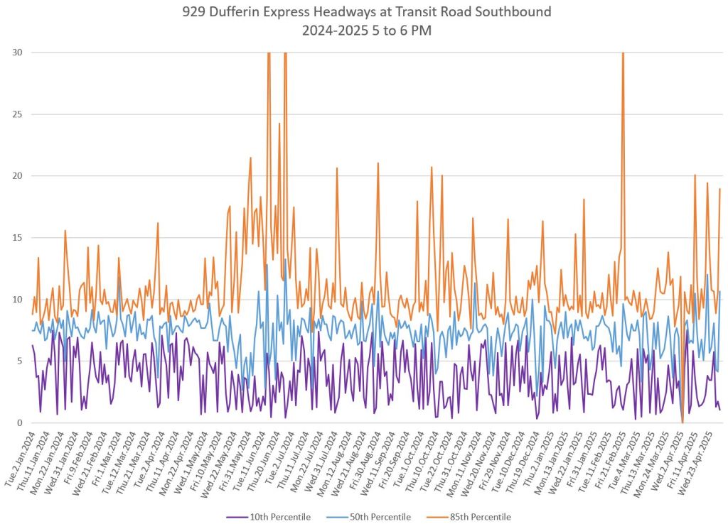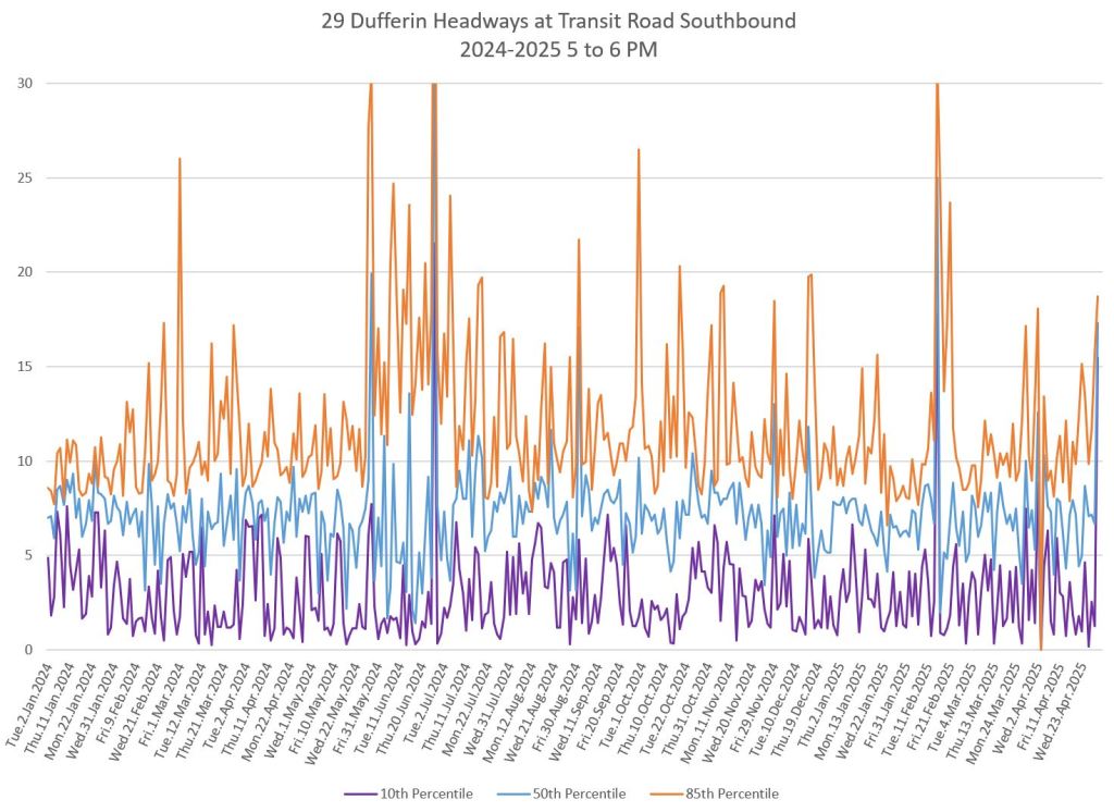 In the first two parts of this series, I reviewed headway and travel time data for the 29/929 Dufferin bus during April 2025.