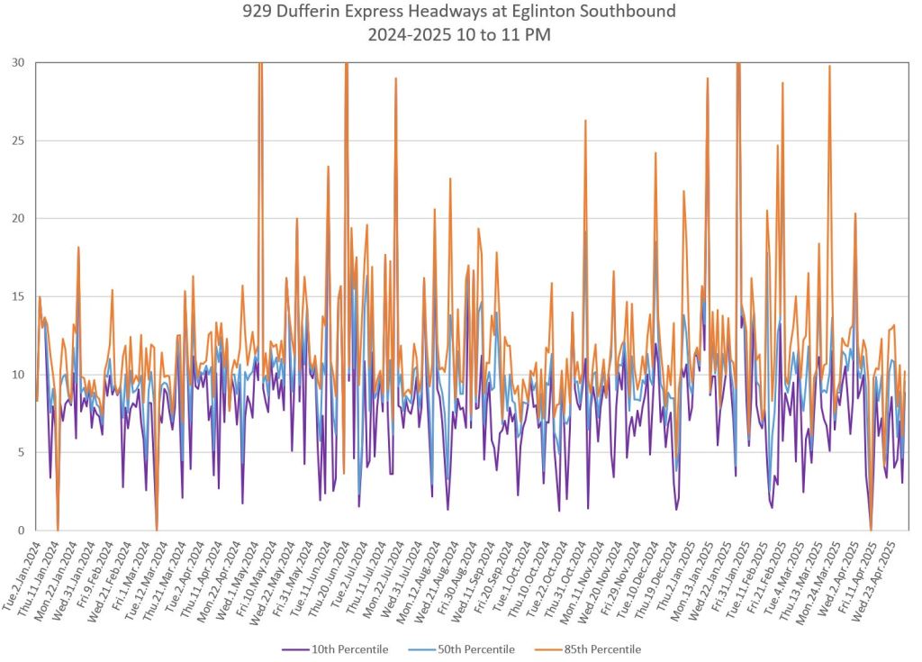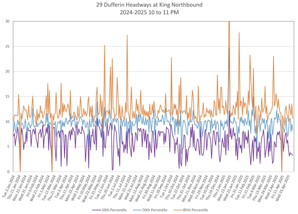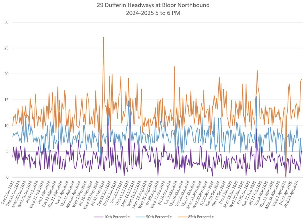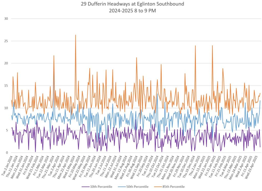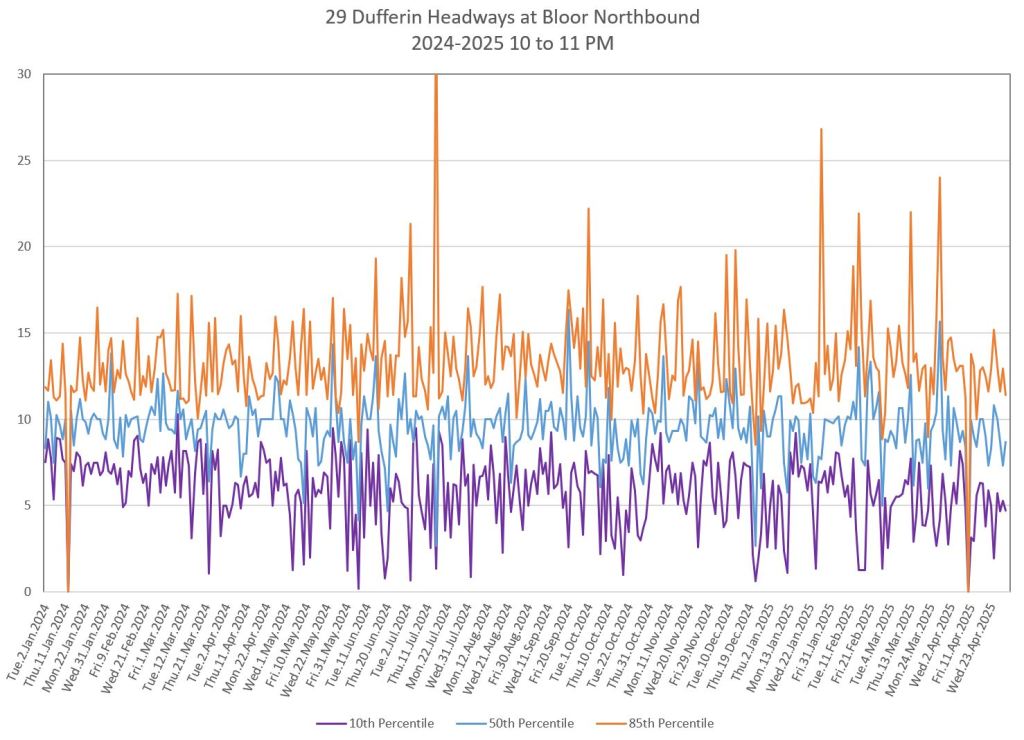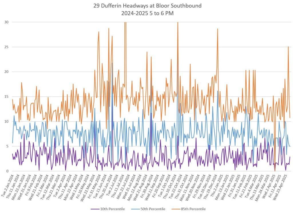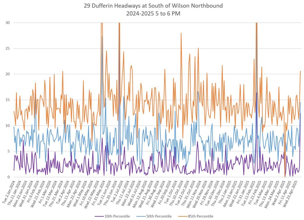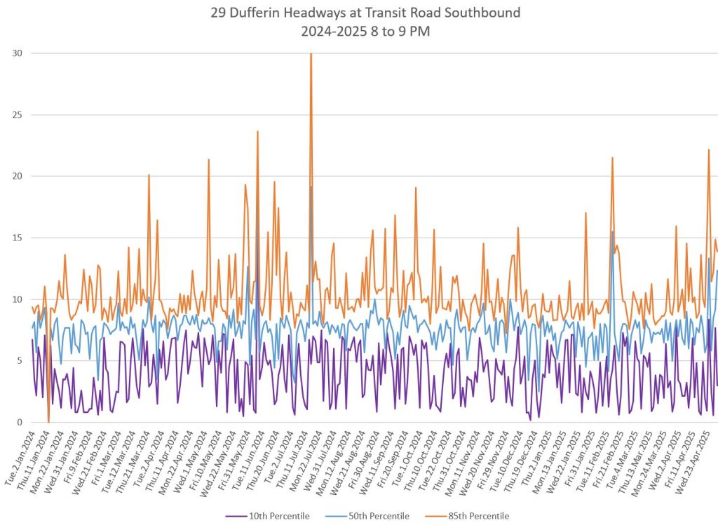 In the first two parts of this series, I reviewed headway and travel time data for the 29/929 Dufferin bus during April 2025.