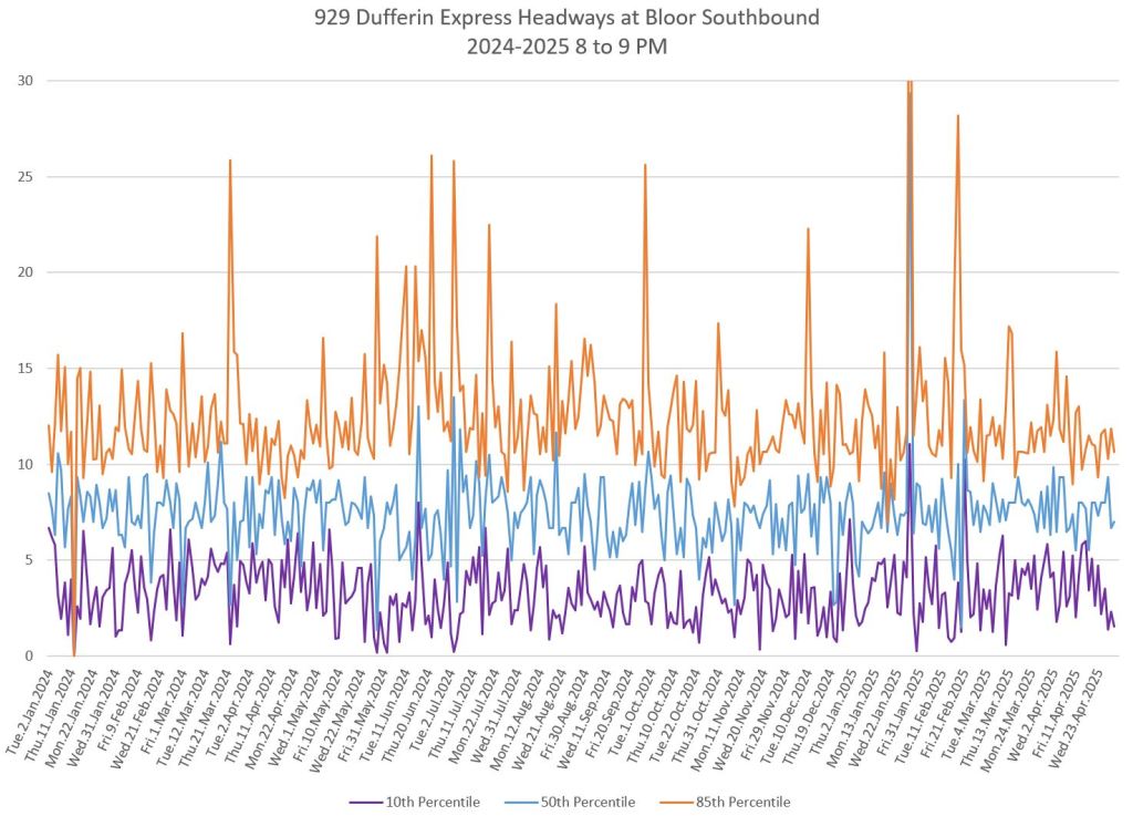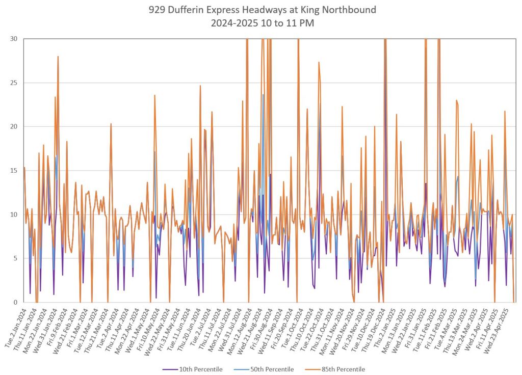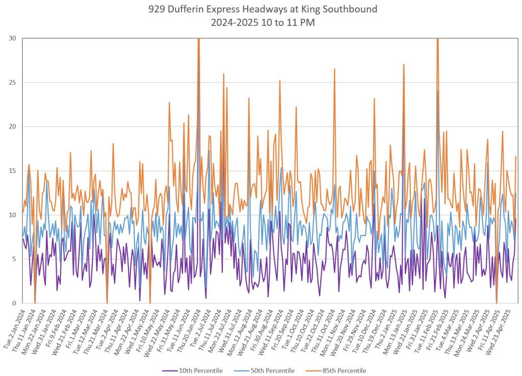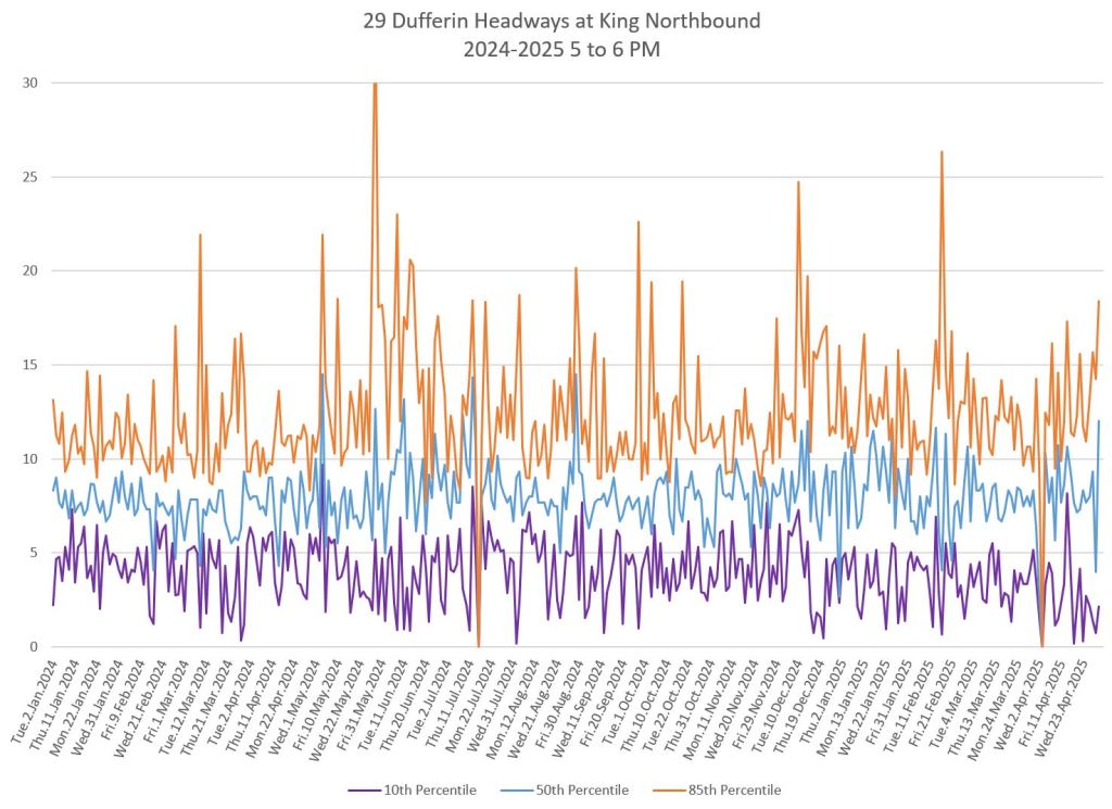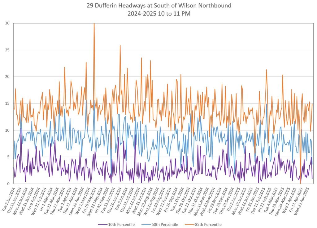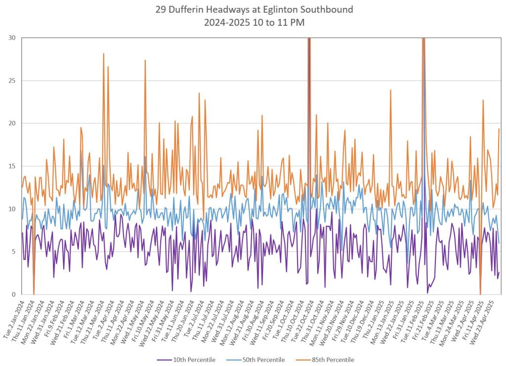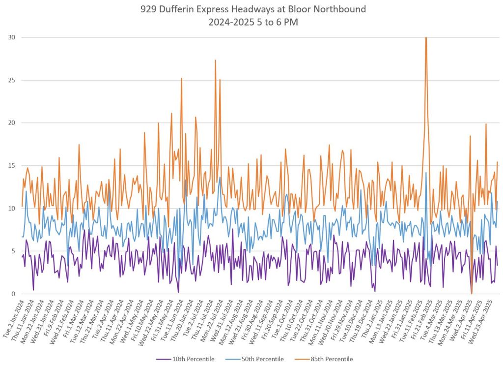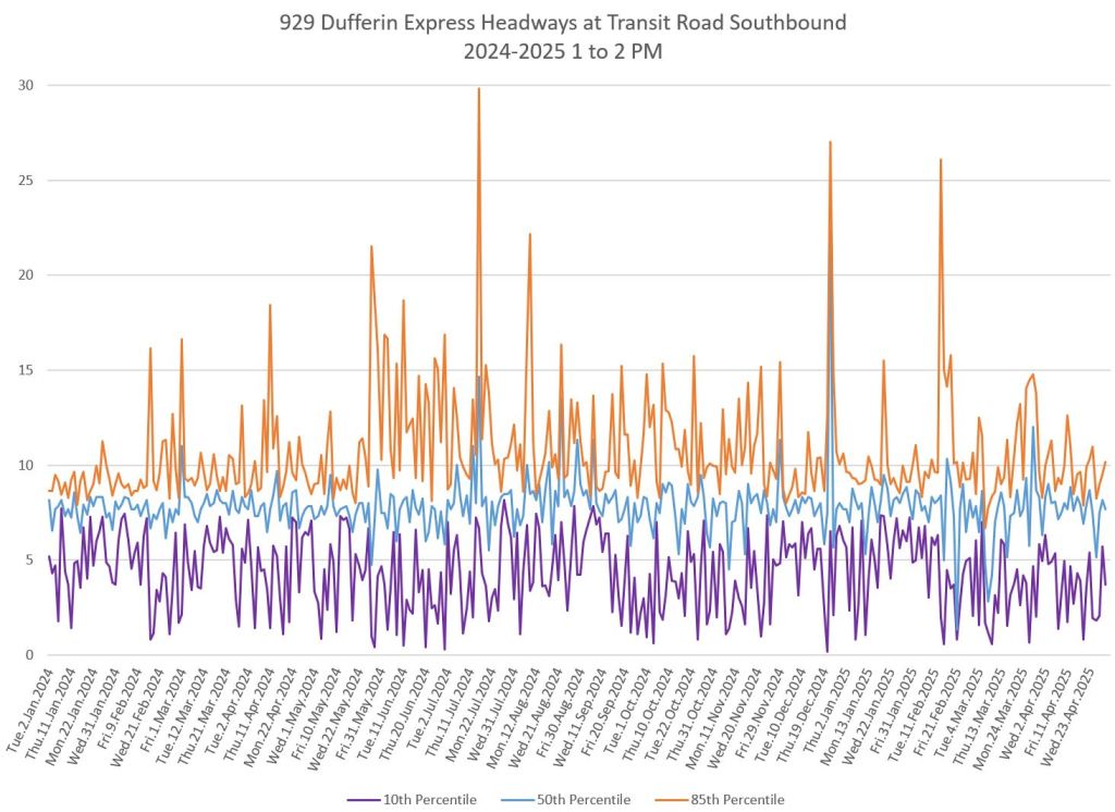 In the first two parts of this series, I reviewed headway and travel time data for the 29/929 Dufferin bus during April 2025.