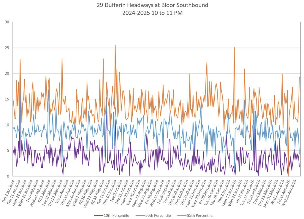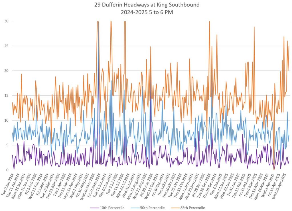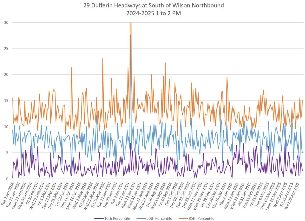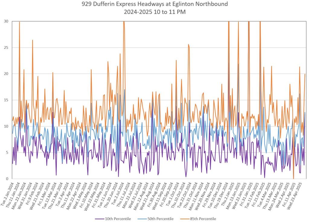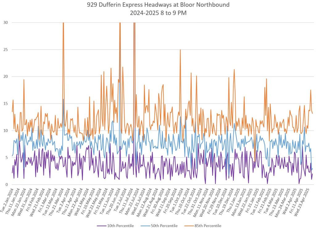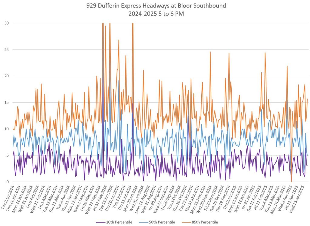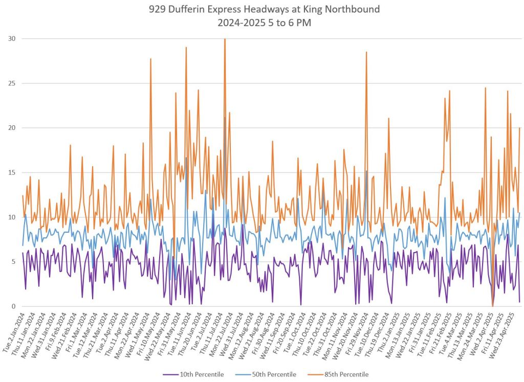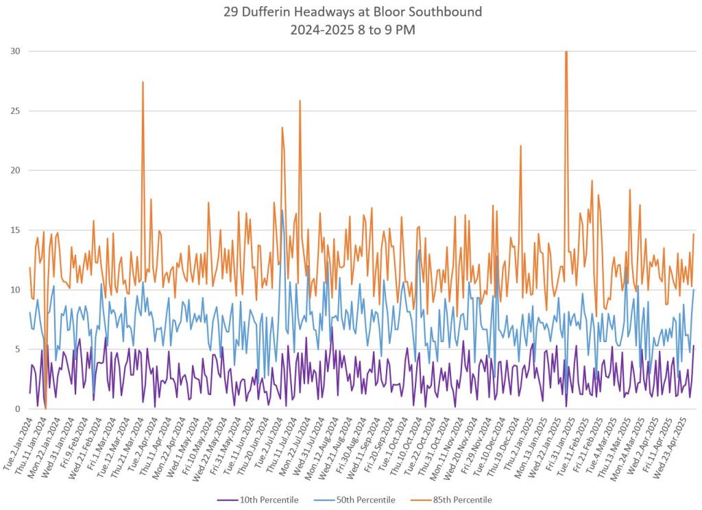 In the first two parts of this series, I reviewed headway and travel time data for the 29/929 Dufferin bus during April 2025.