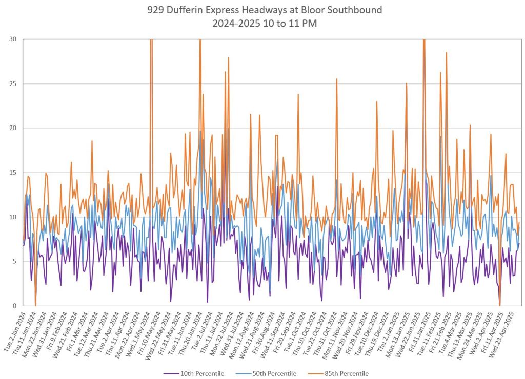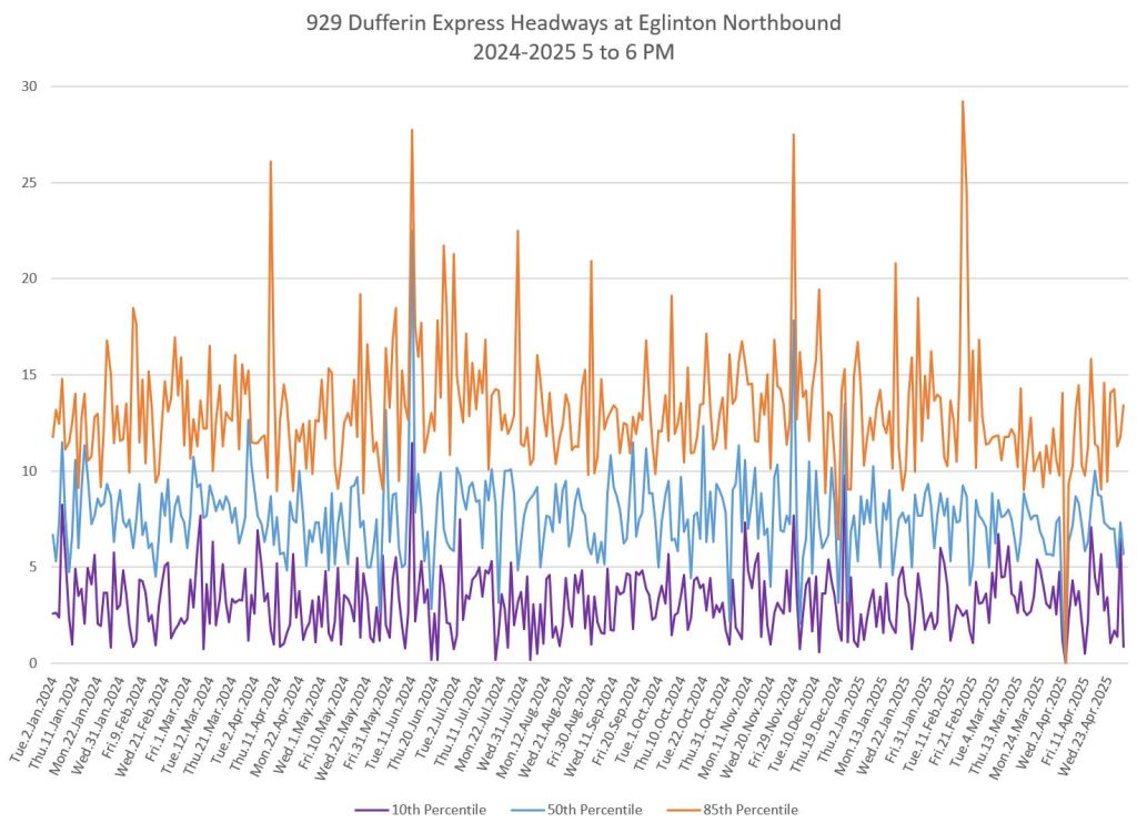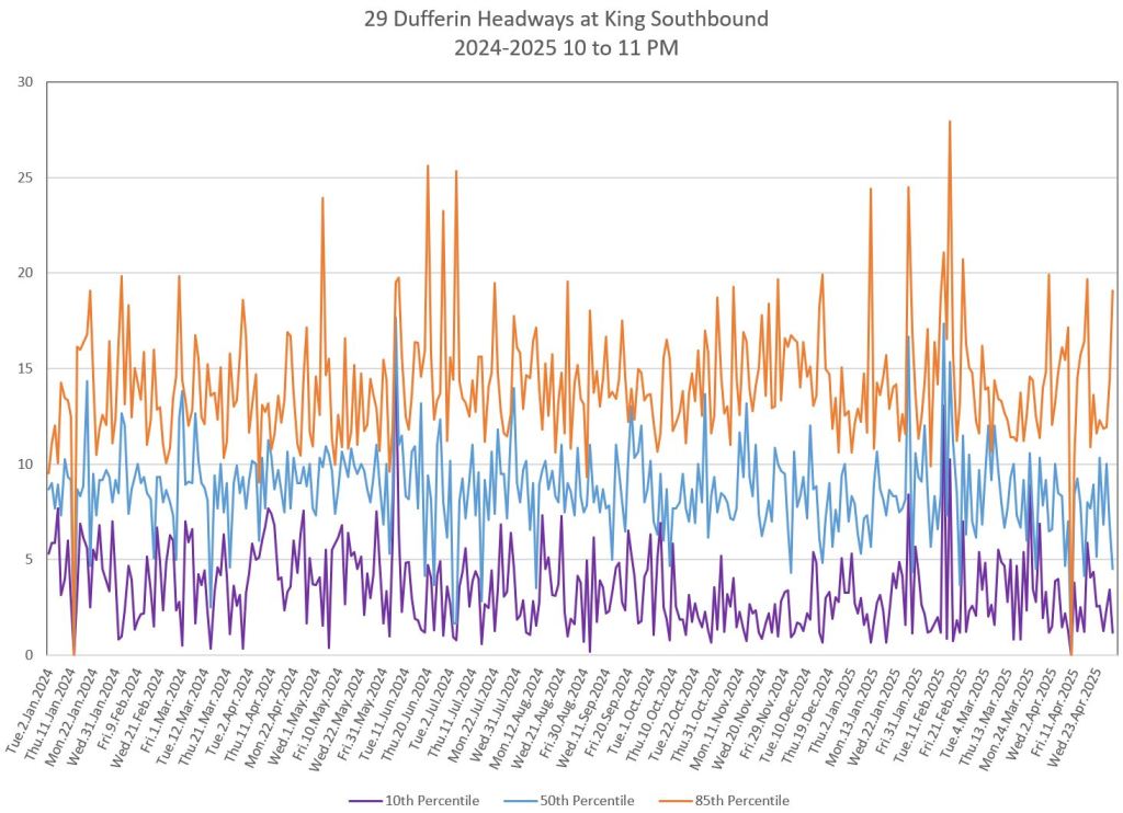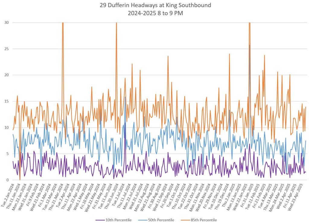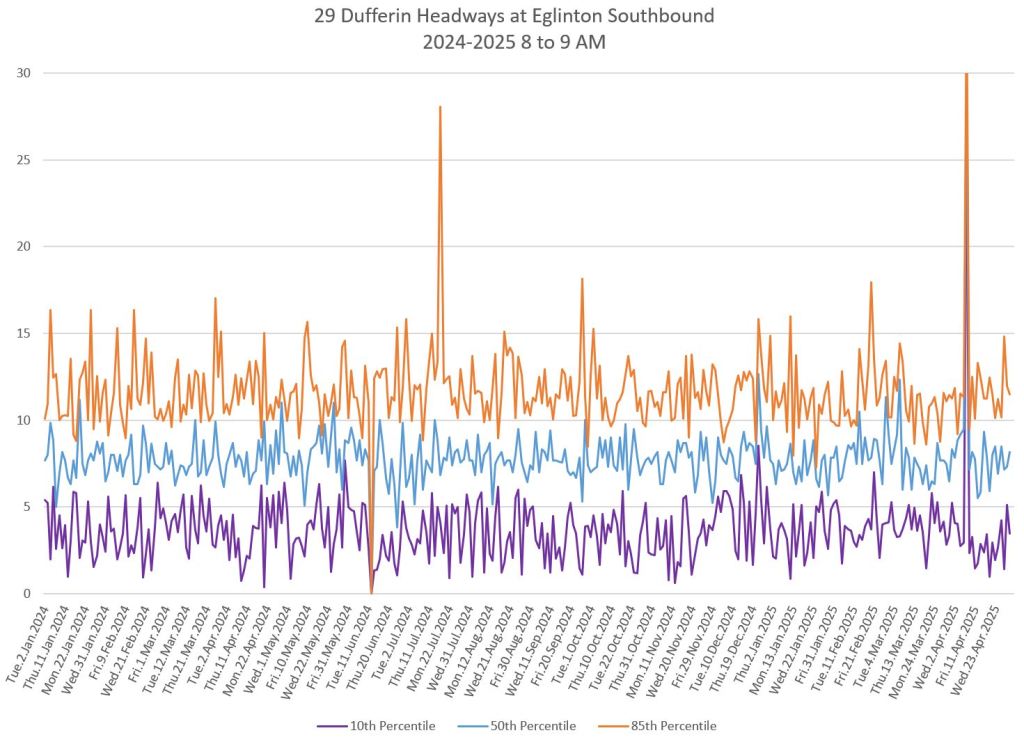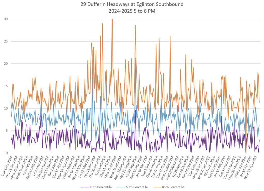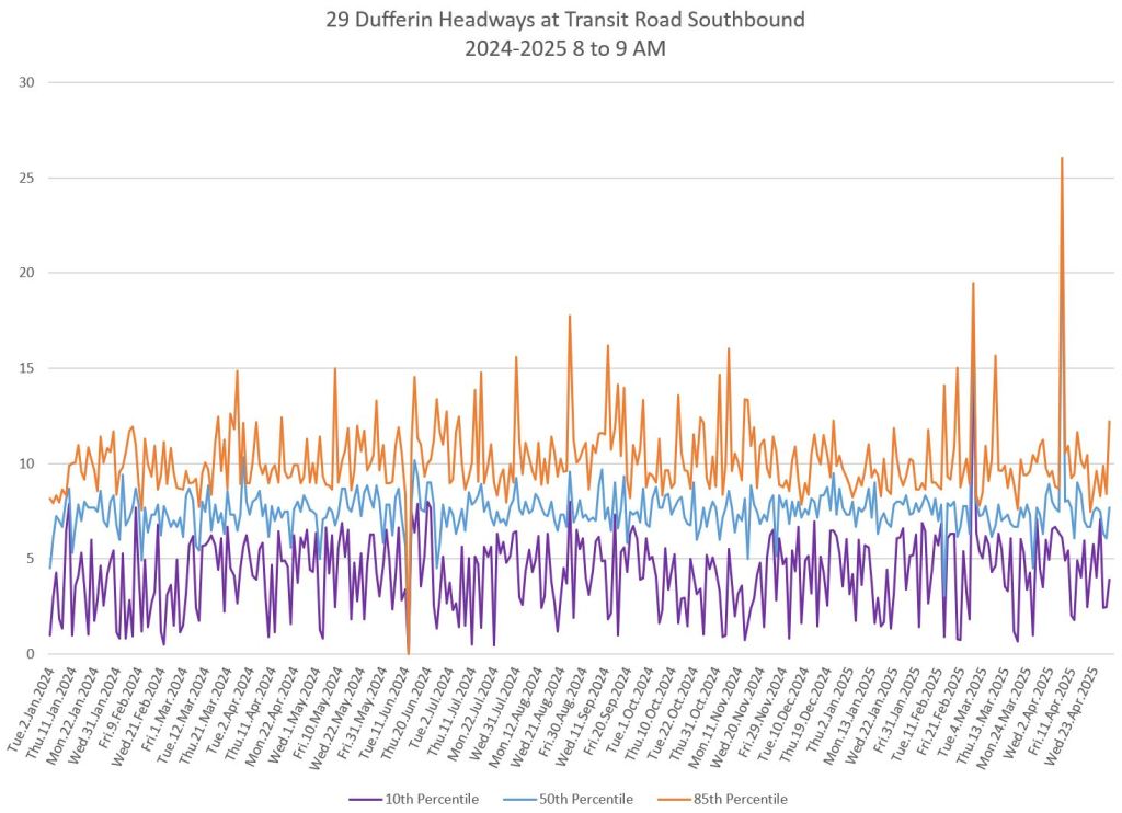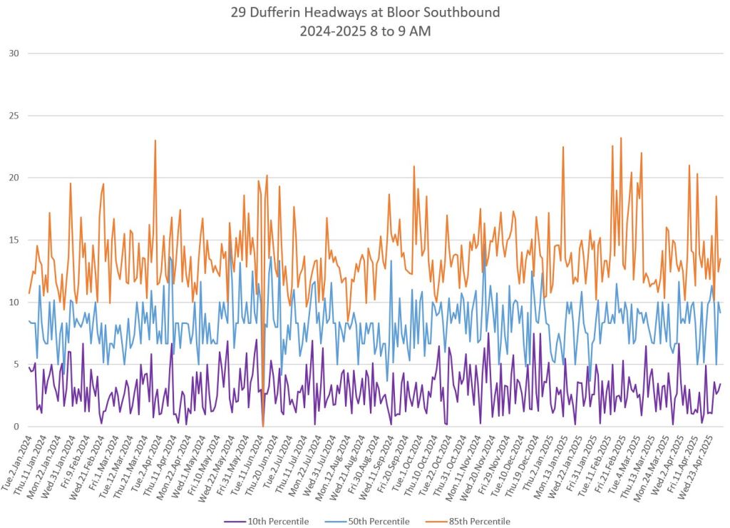 In the first two parts of this series, I reviewed headway and travel time data for the 29/929 Dufferin bus during April 2025.