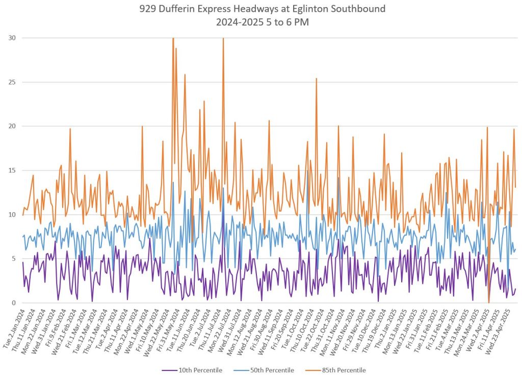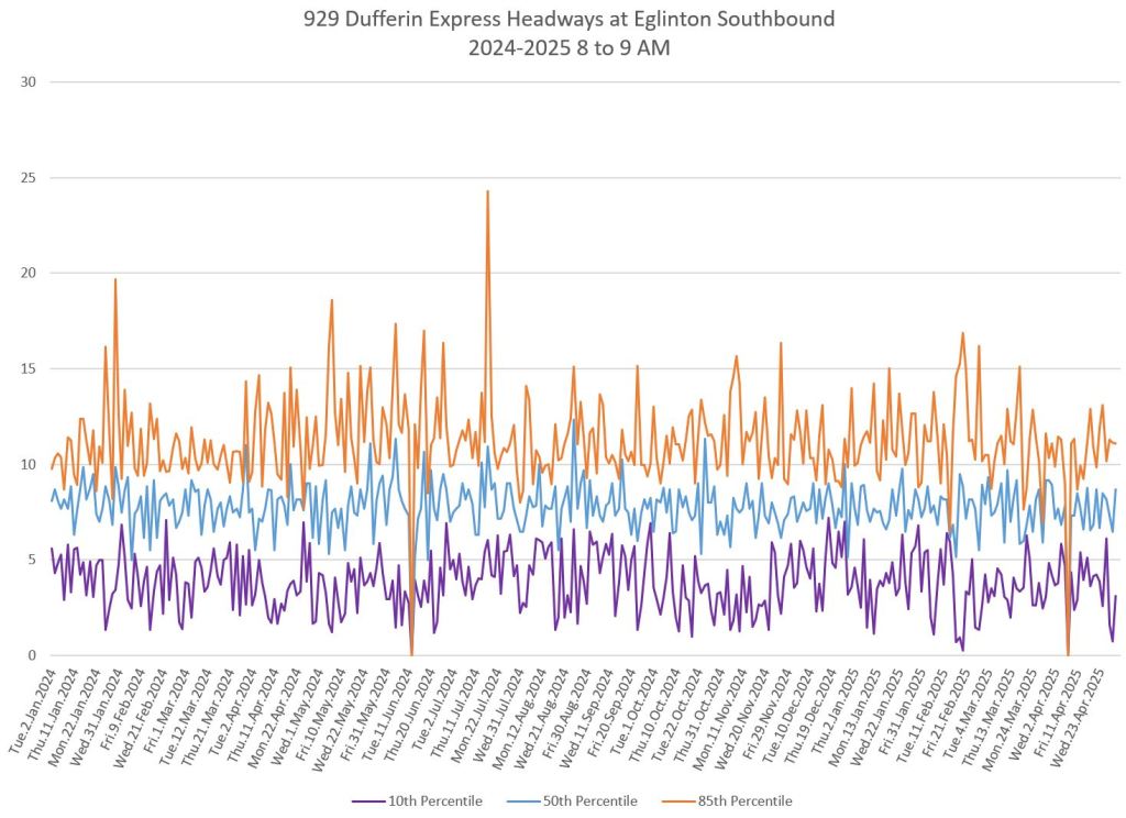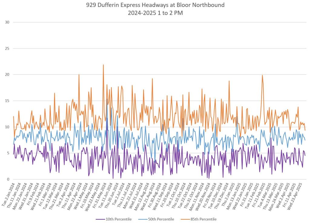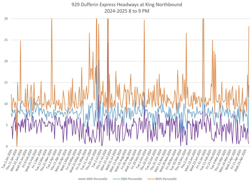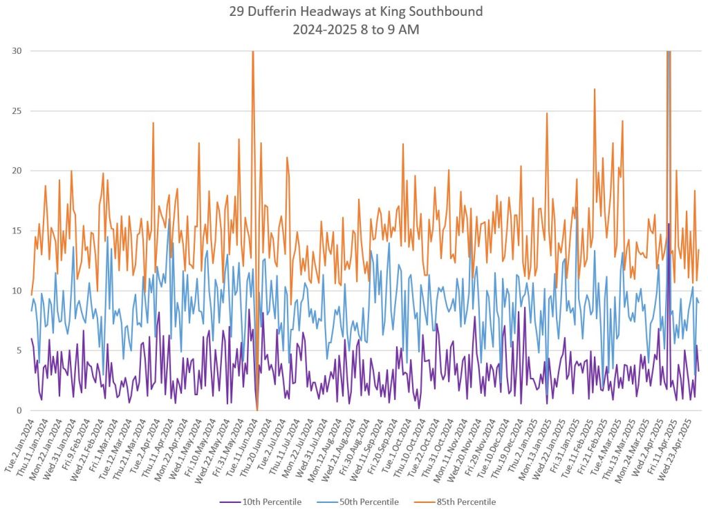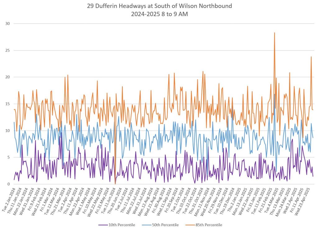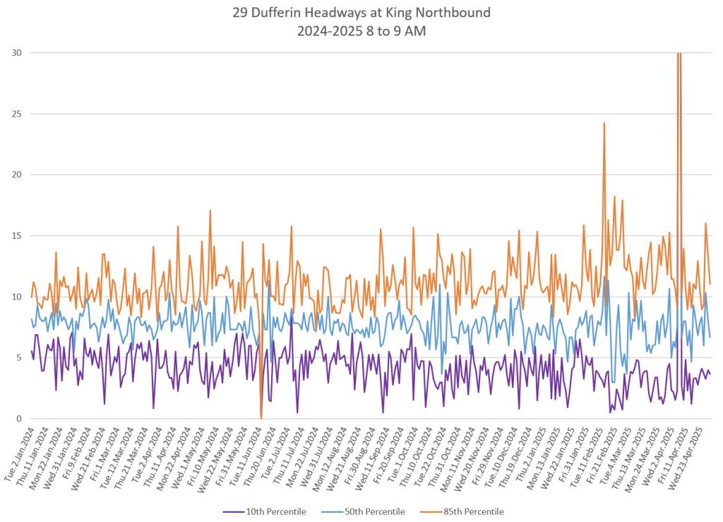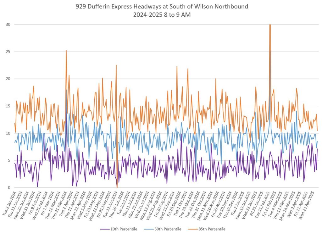 In the first two parts of this series, I reviewed headway and travel time data for the 29/929 Dufferin bus during April 2025.