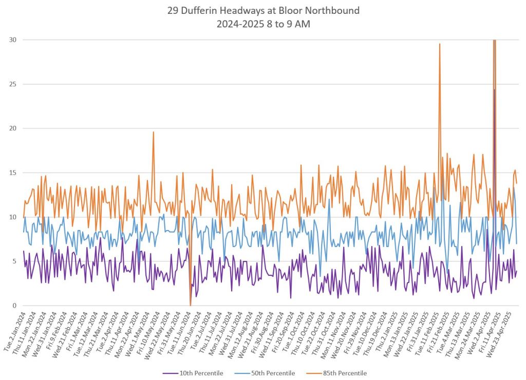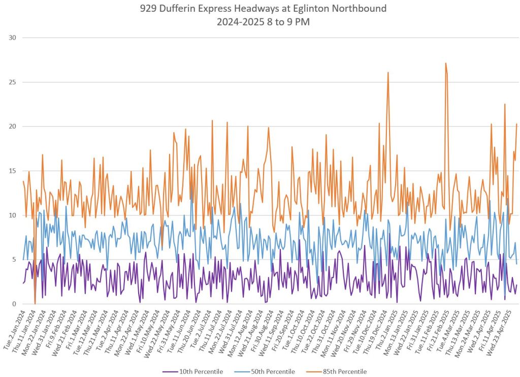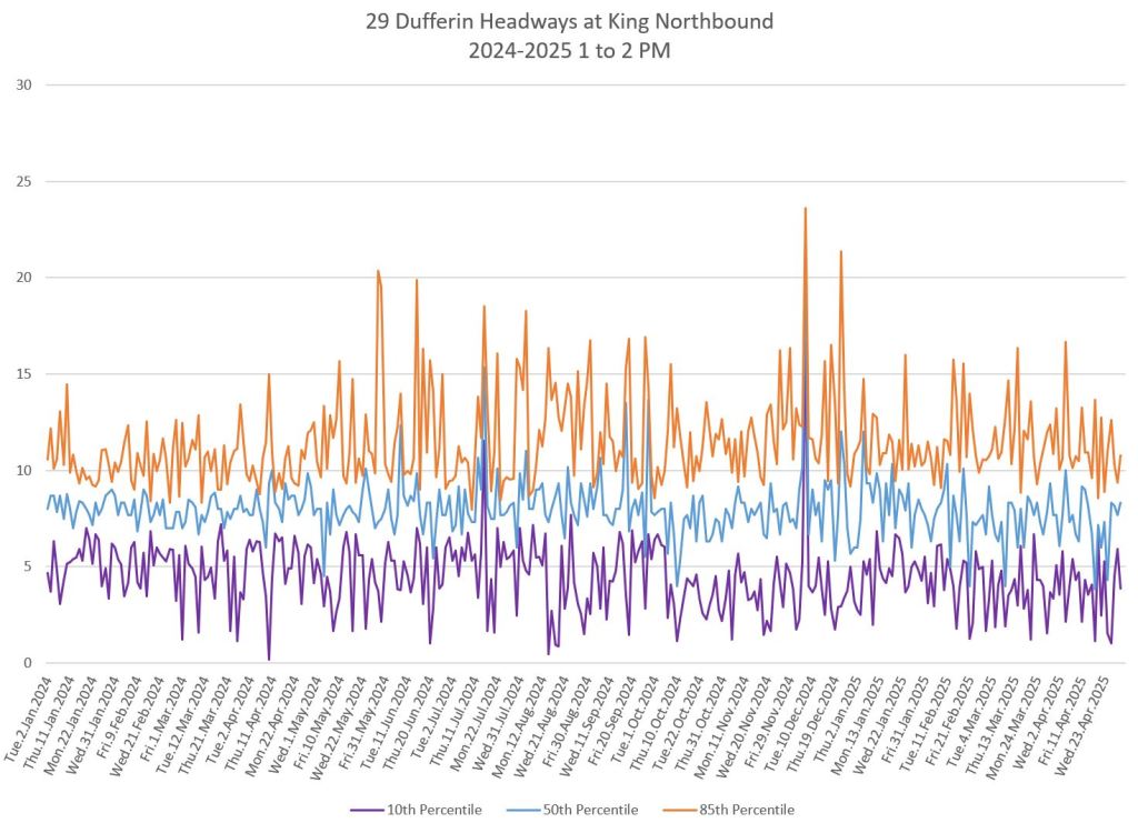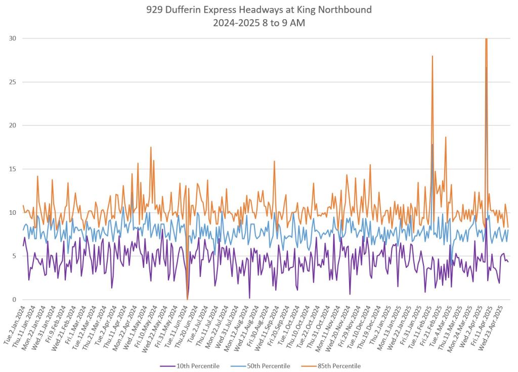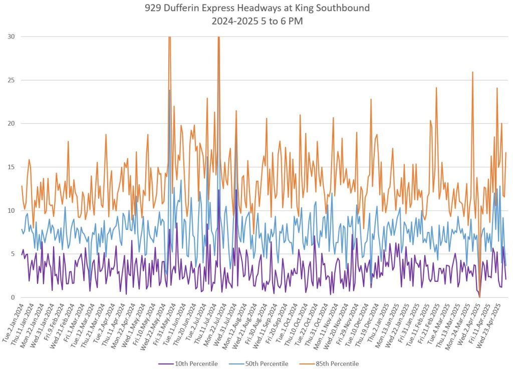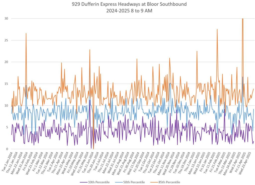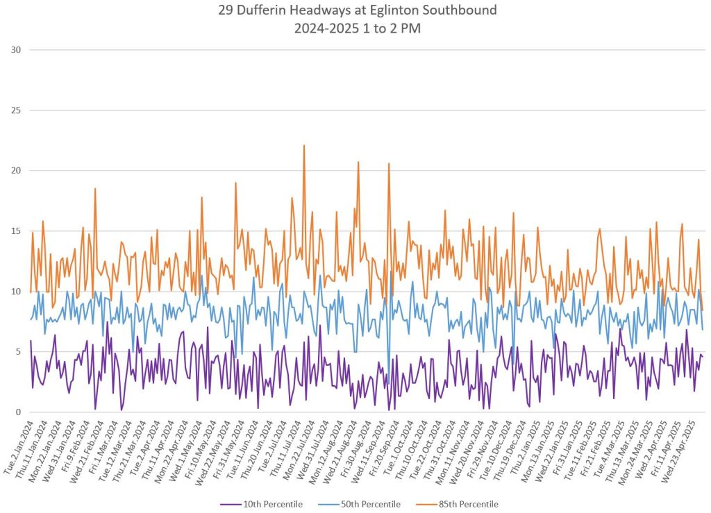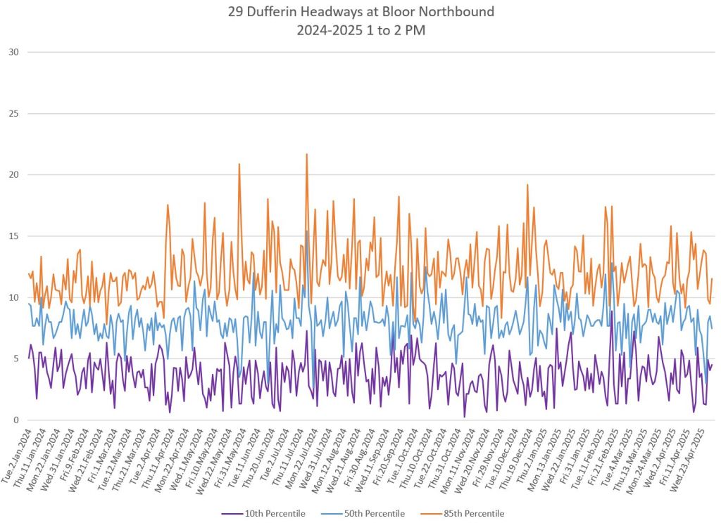 In the first two parts of this series, I reviewed headway and travel time data for the 29/929 Dufferin bus during April 2025.