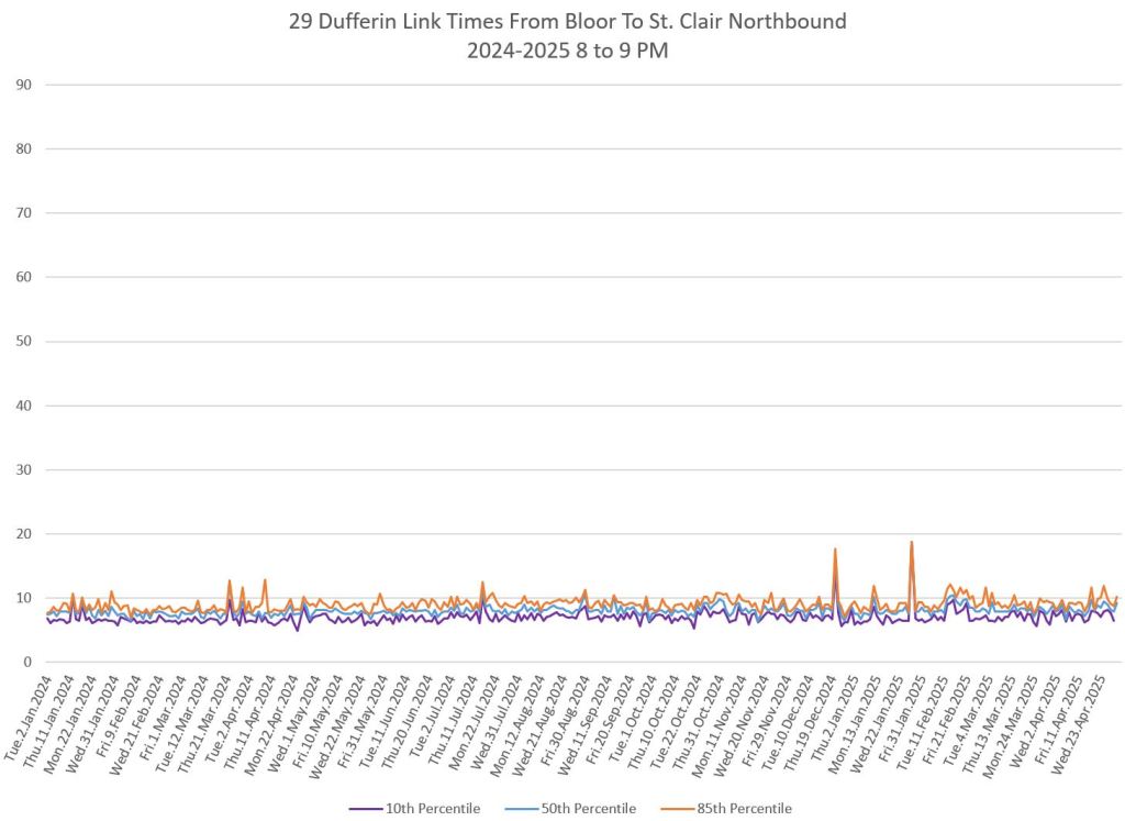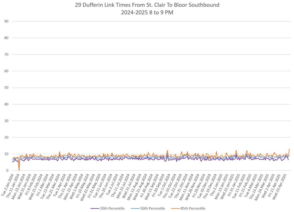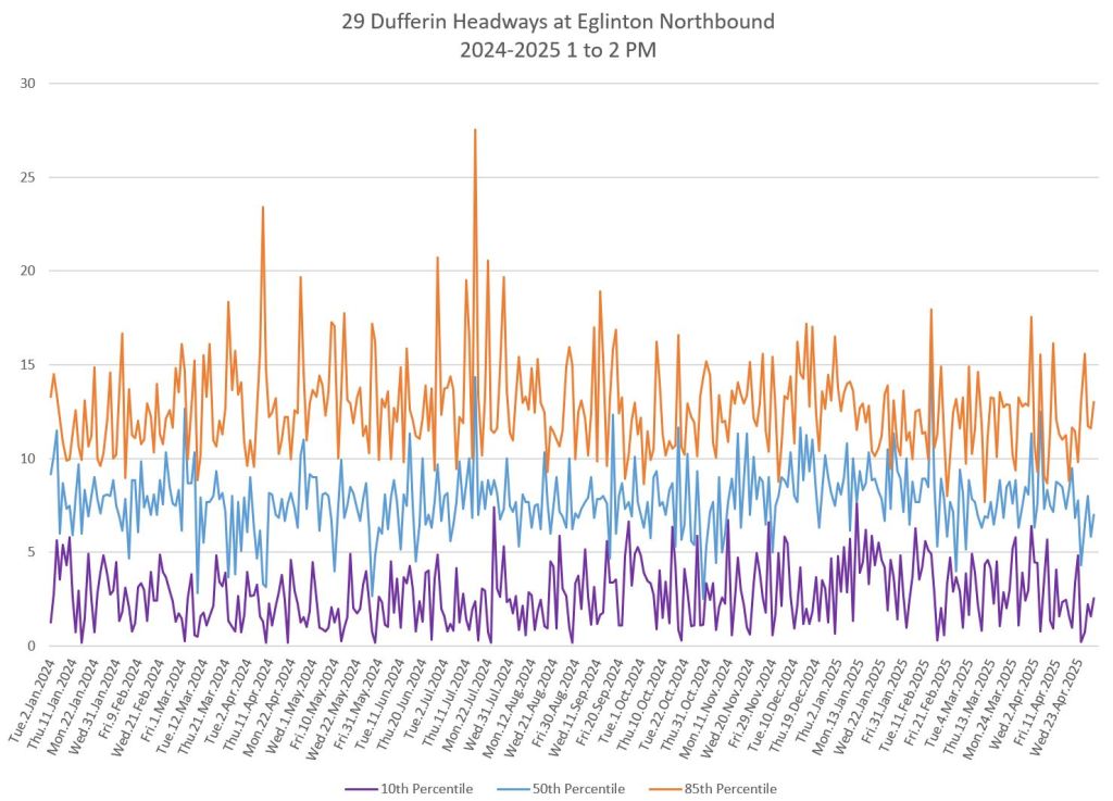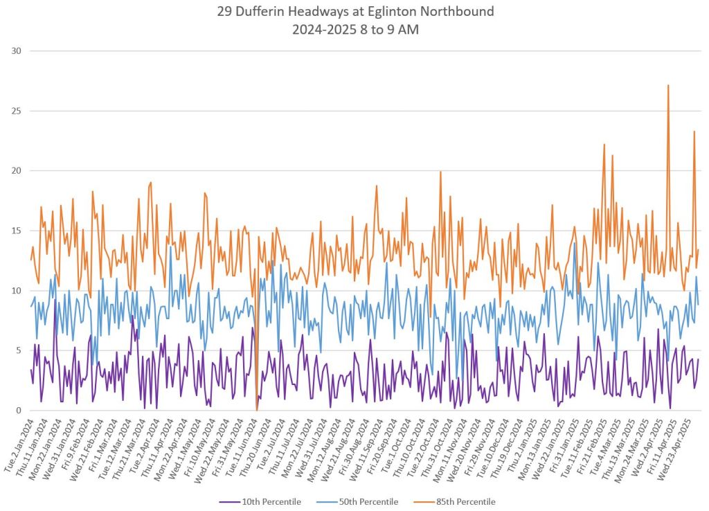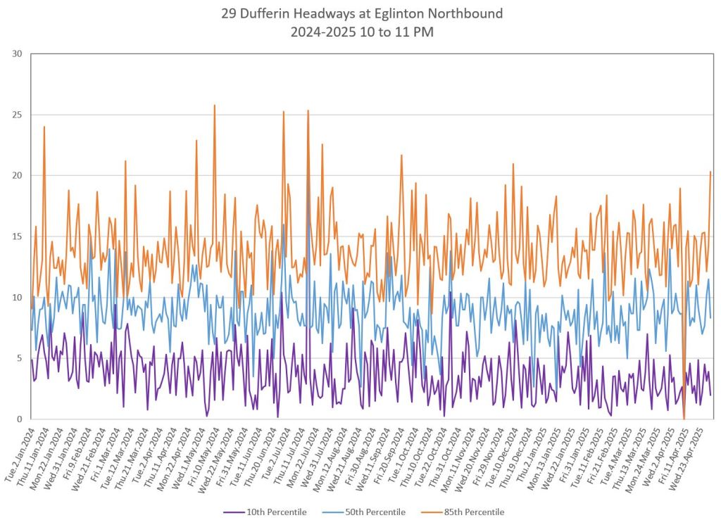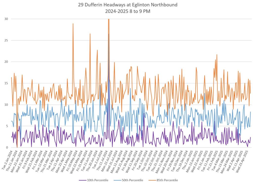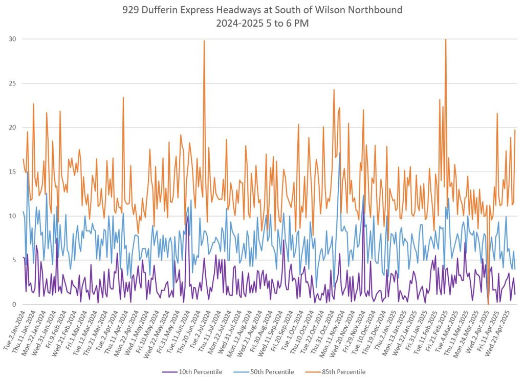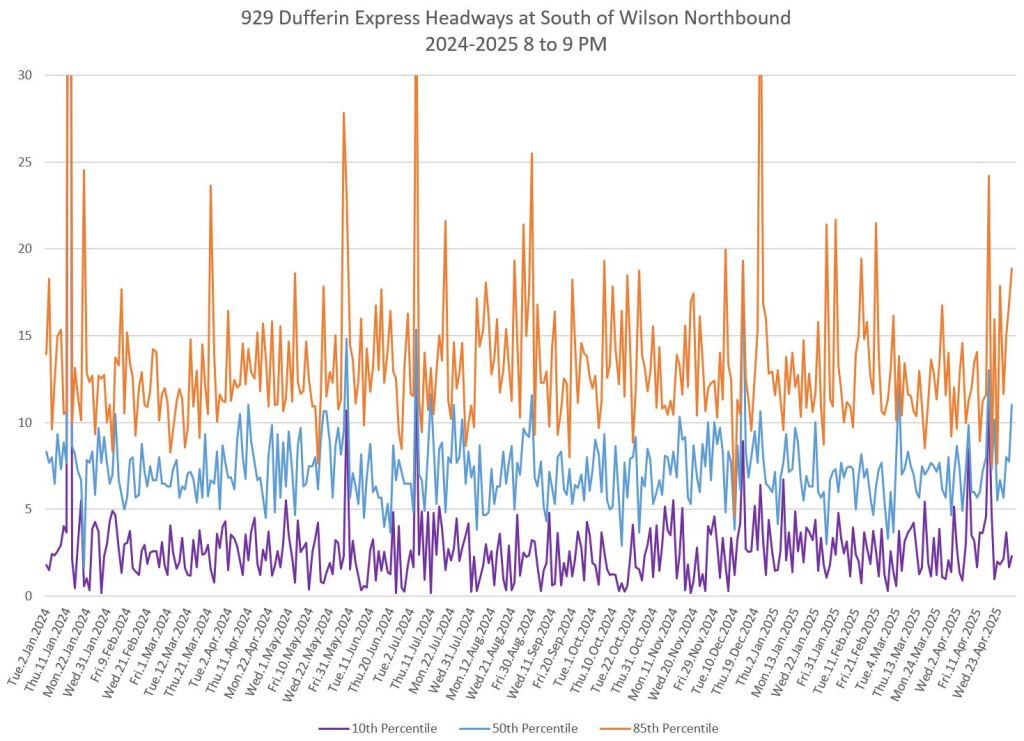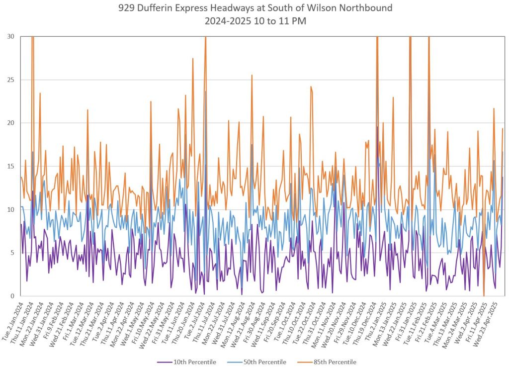 In the first two parts of this series, I reviewed headway and travel time data for the 29/929 Dufferin bus during April 2025.