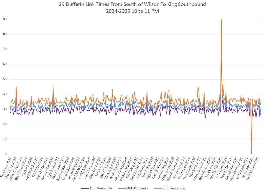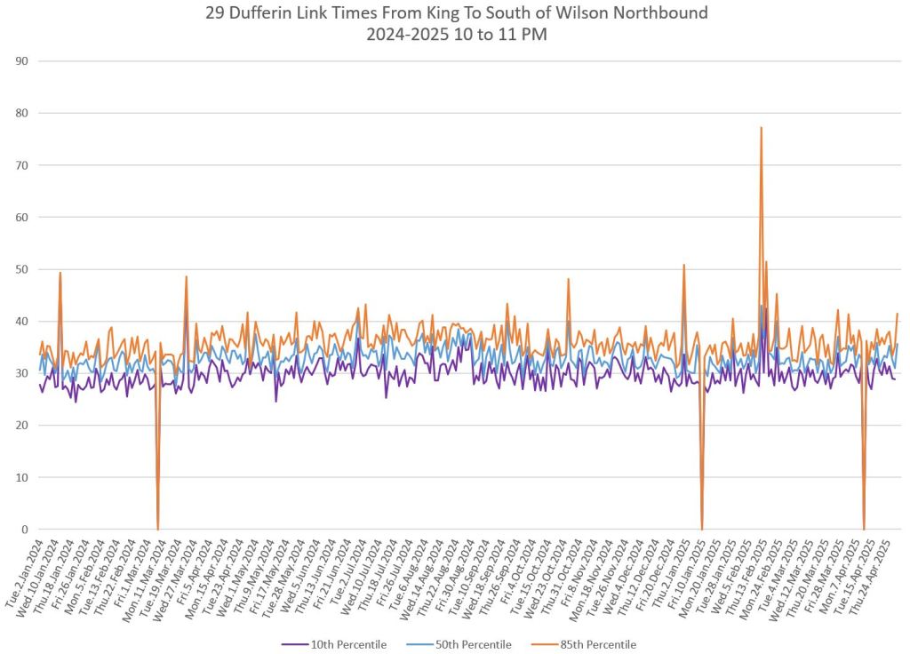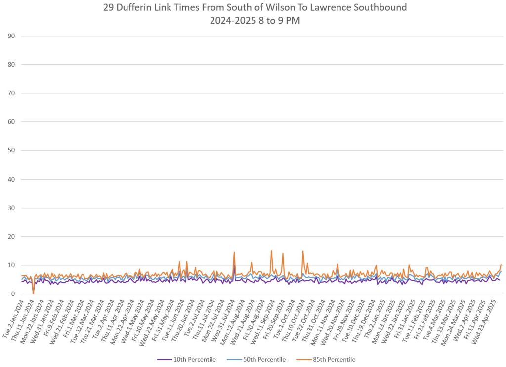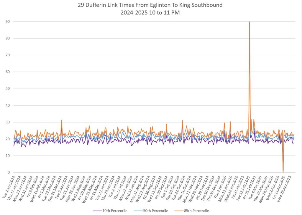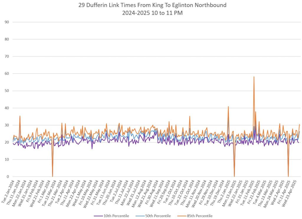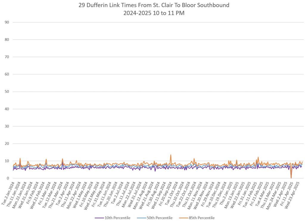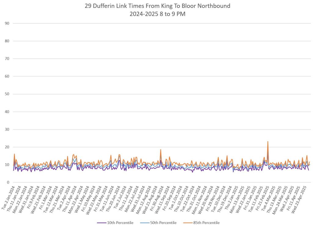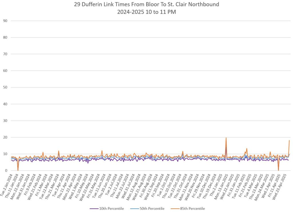 In the first two parts of this series, I reviewed headway and travel time data for the 29/929 Dufferin bus during April 2025.