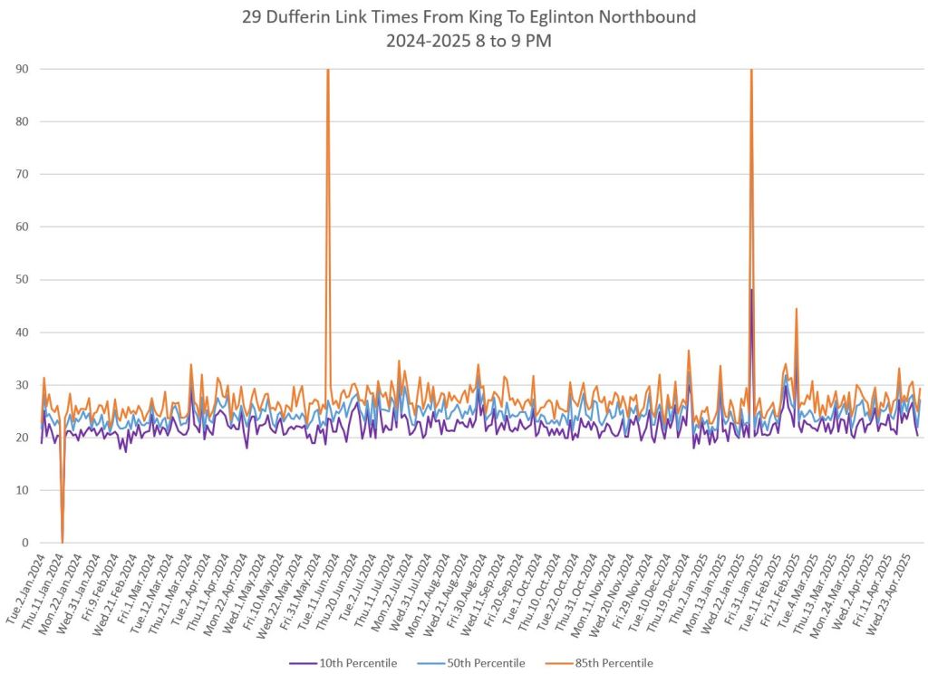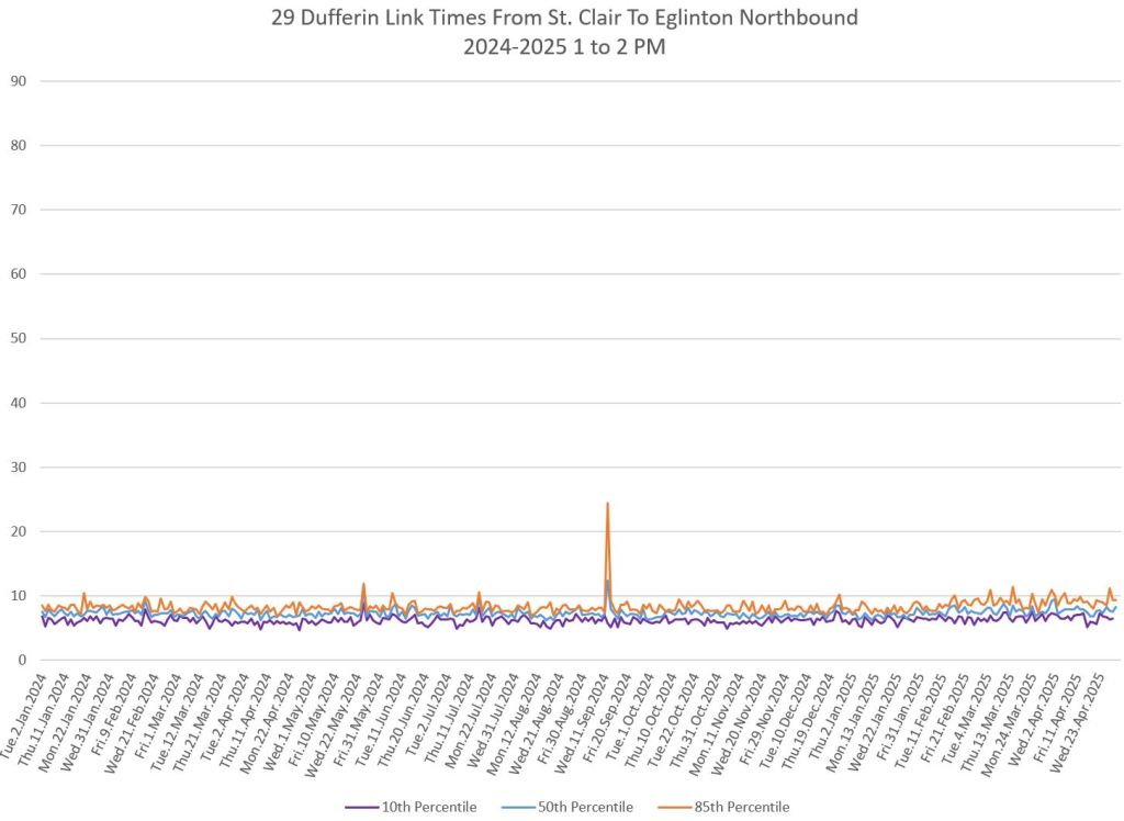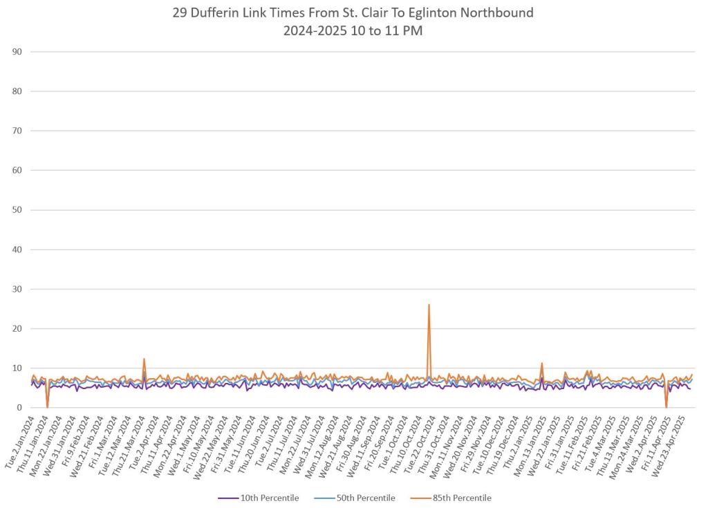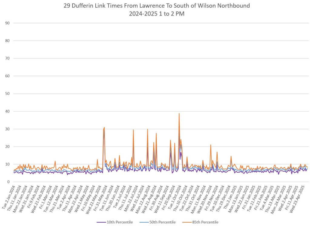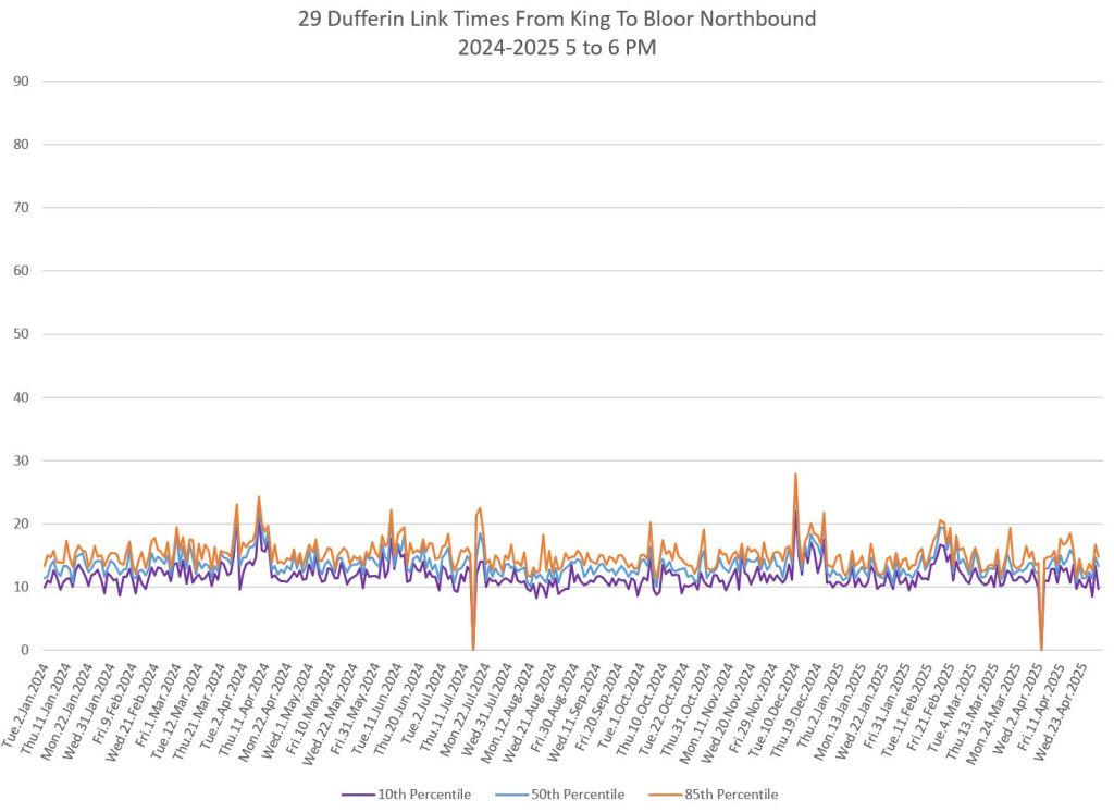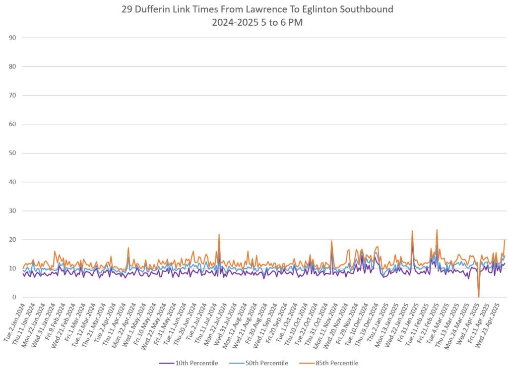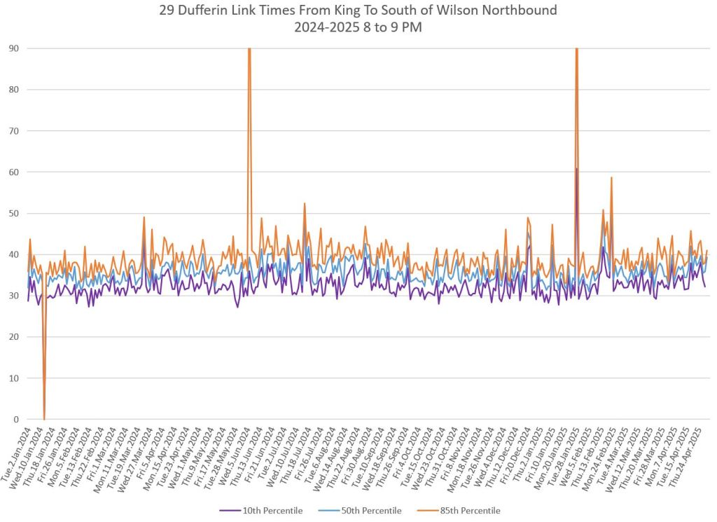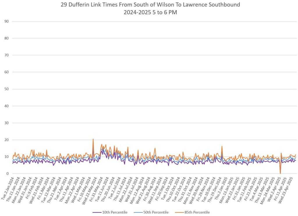 In the first two parts of this series, I reviewed headway and travel time data for the 29/929 Dufferin bus during April 2025.