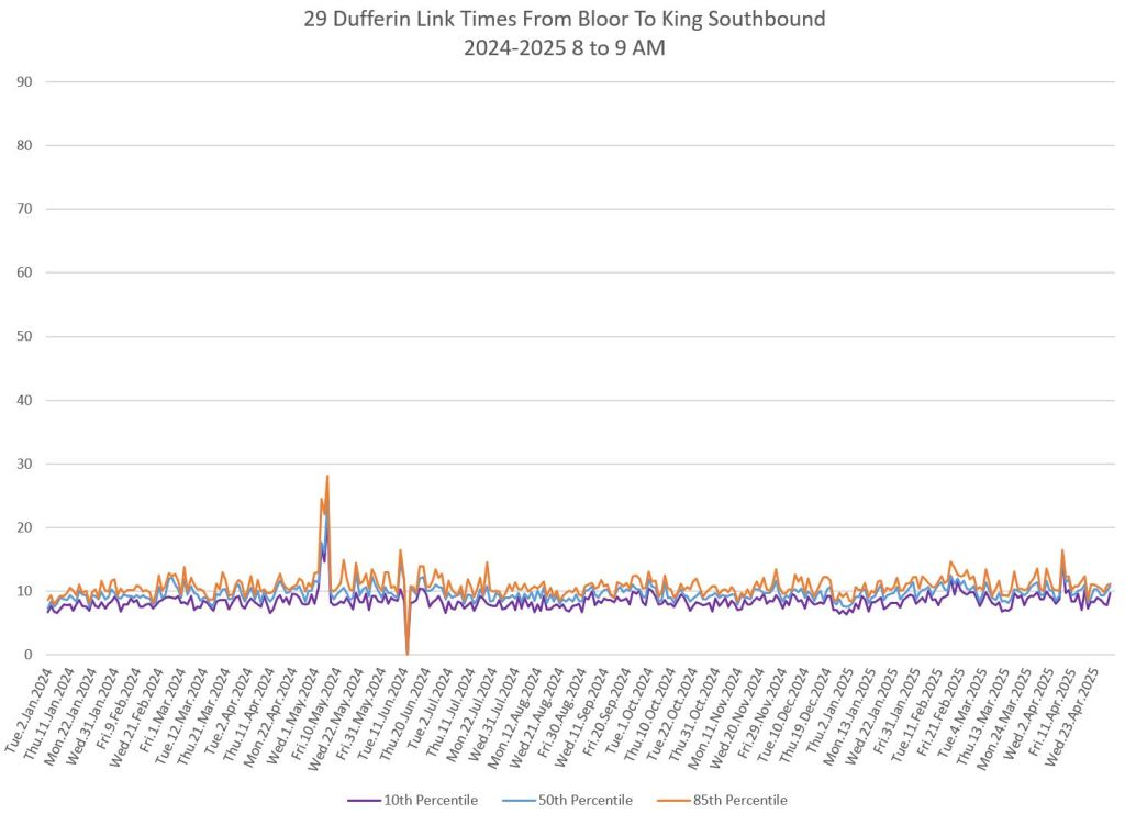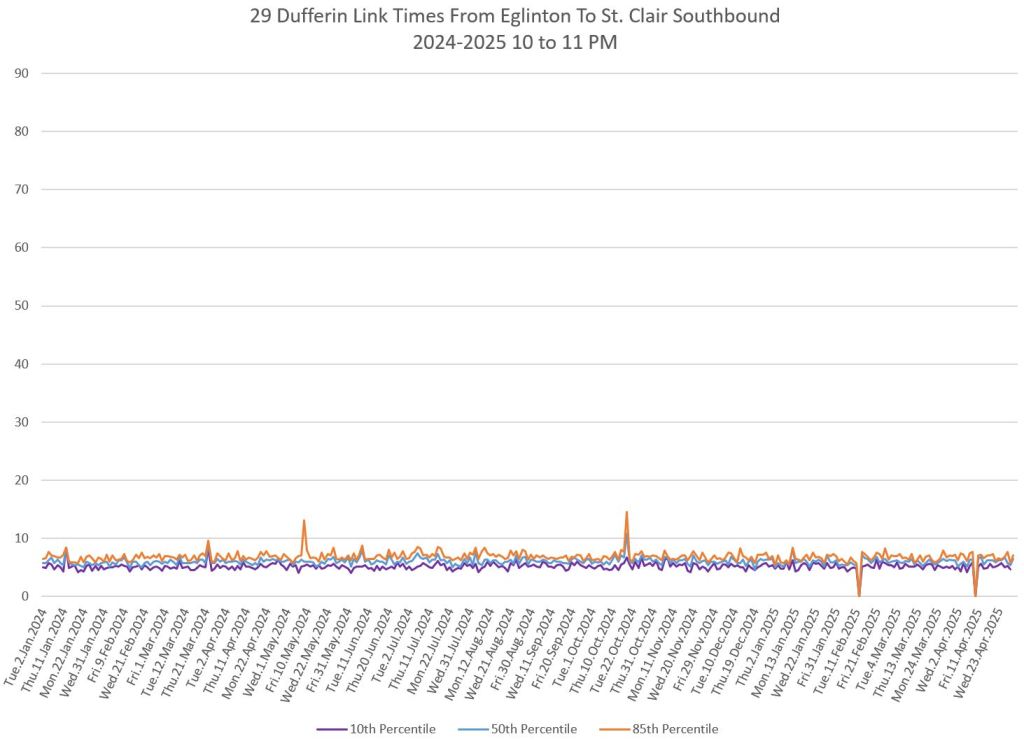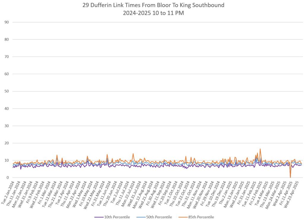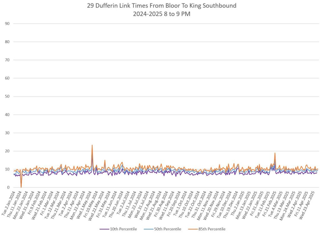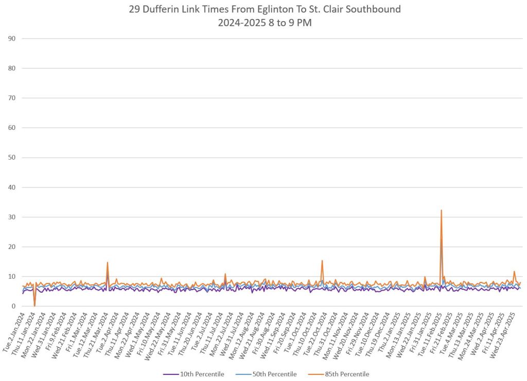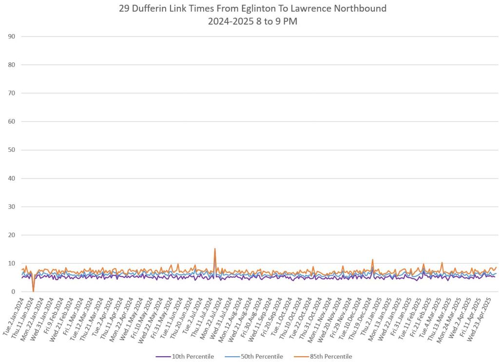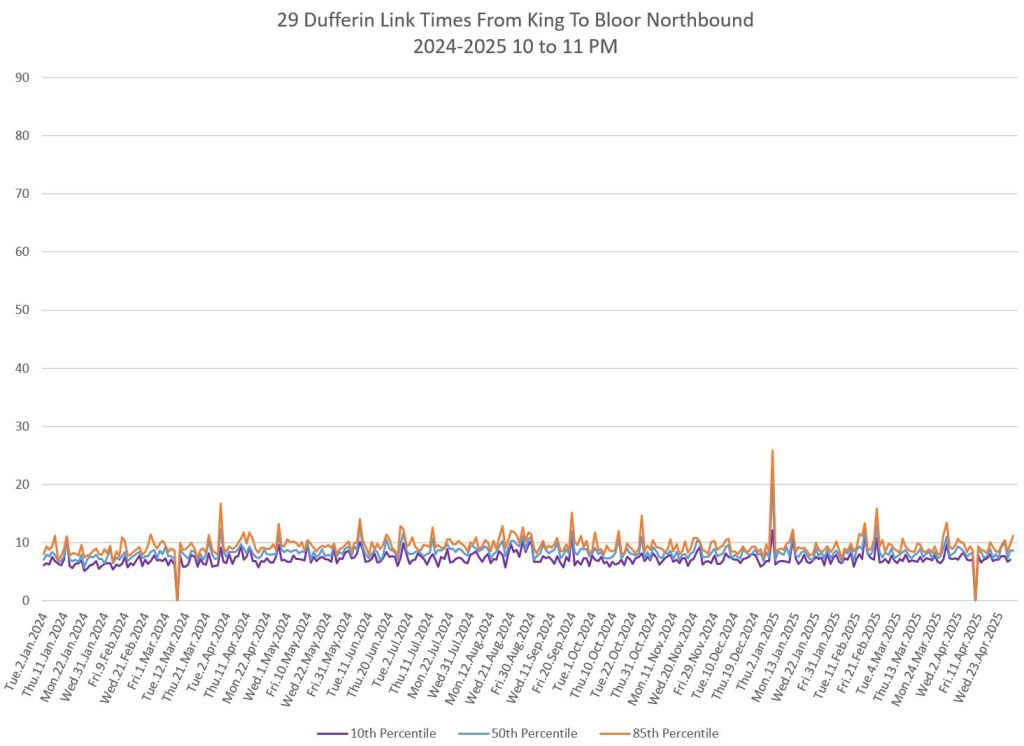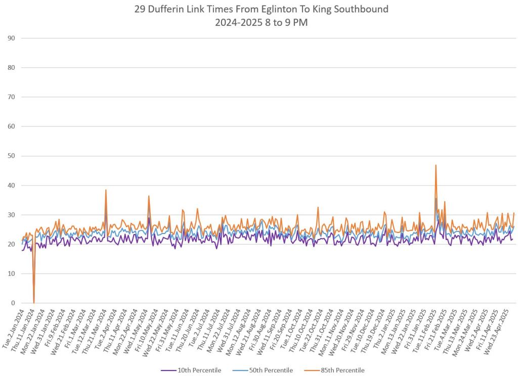 In the first two parts of this series, I reviewed headway and travel time data for the 29/929 Dufferin bus during April 2025.
