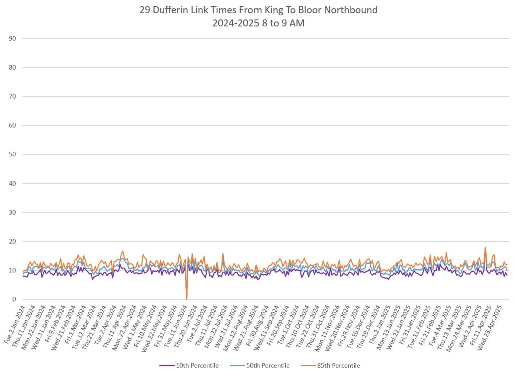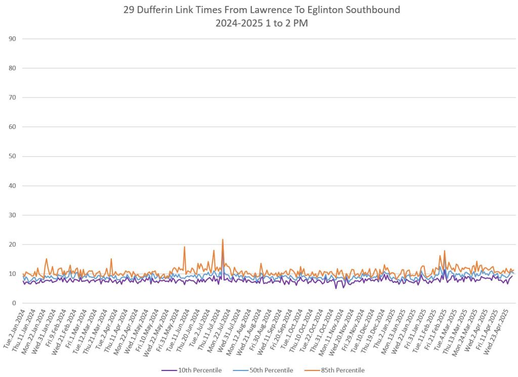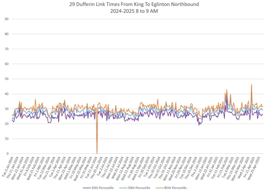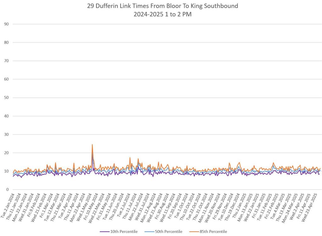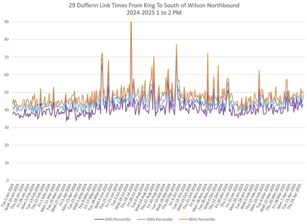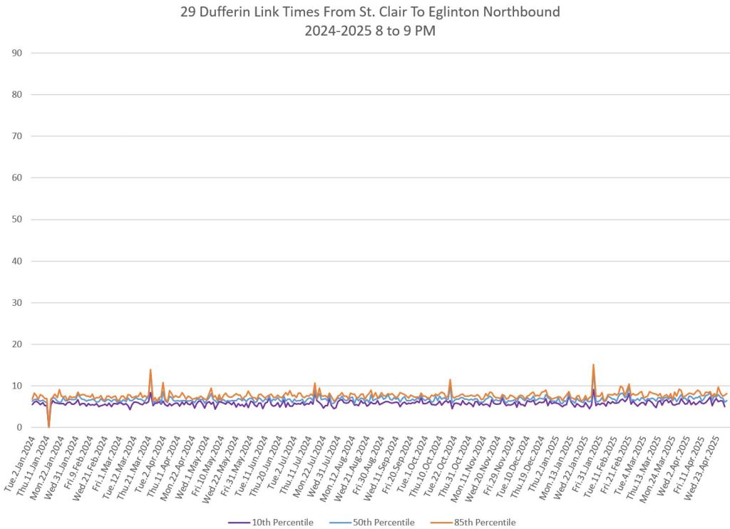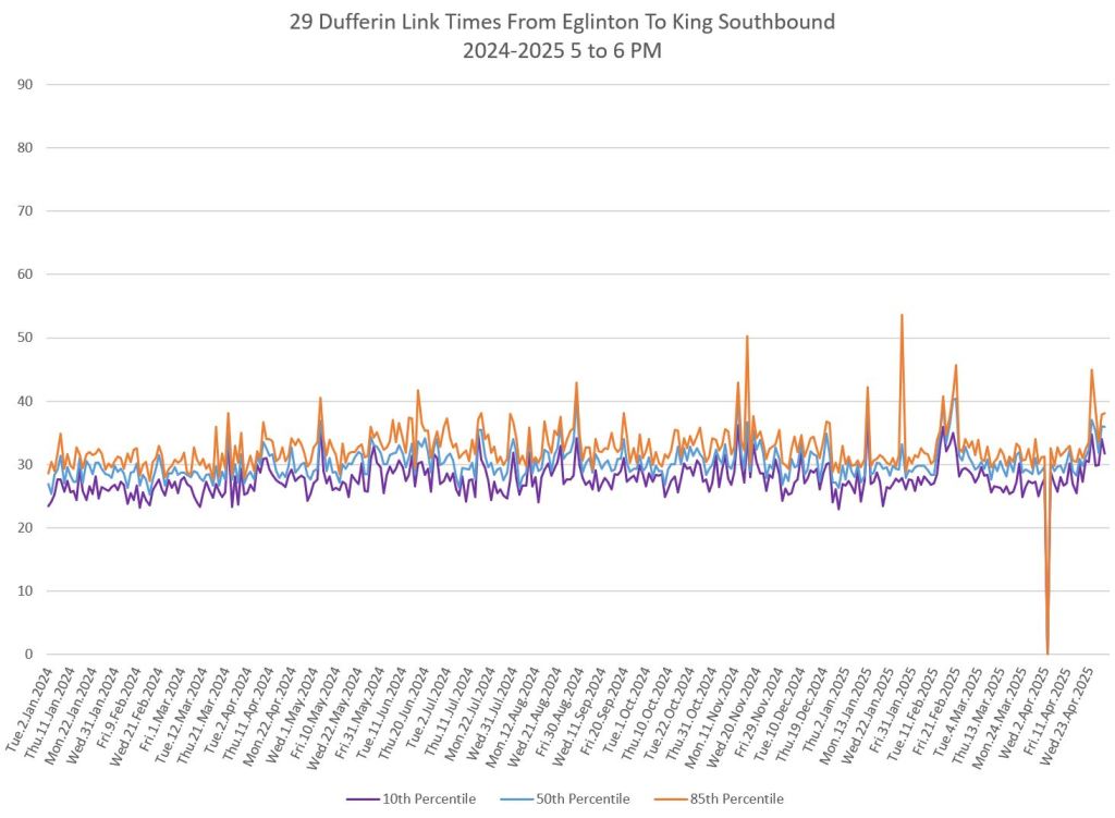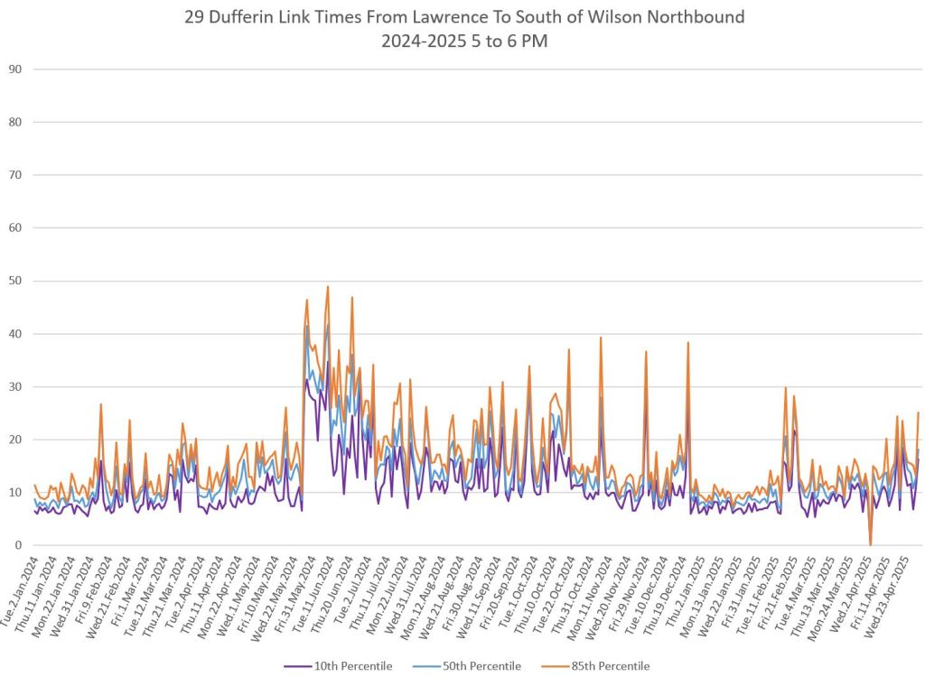 In the first two parts of this series, I reviewed headway and travel time data for the 29/929 Dufferin bus during April 2025.