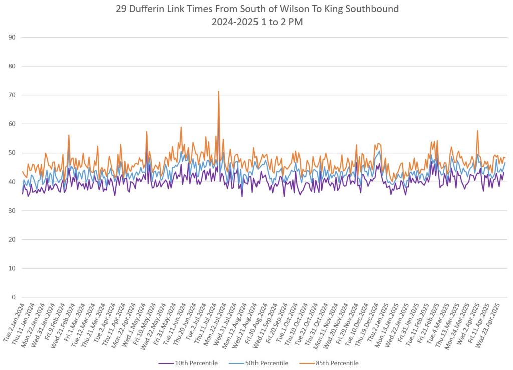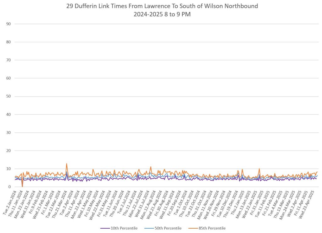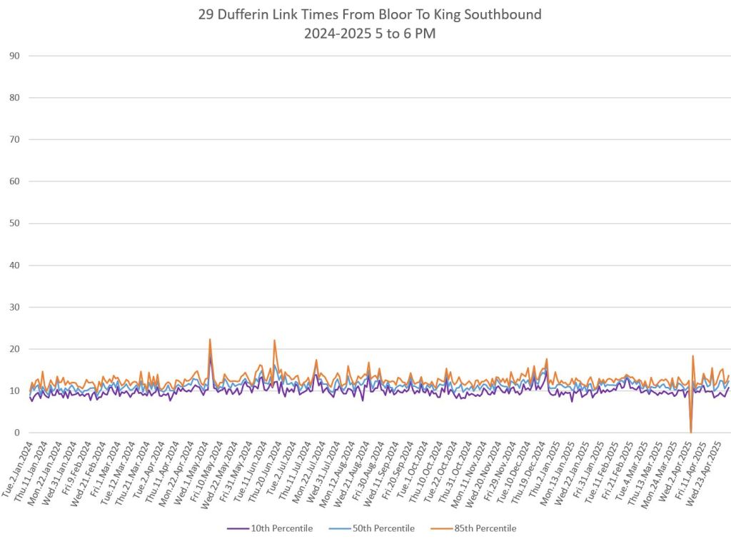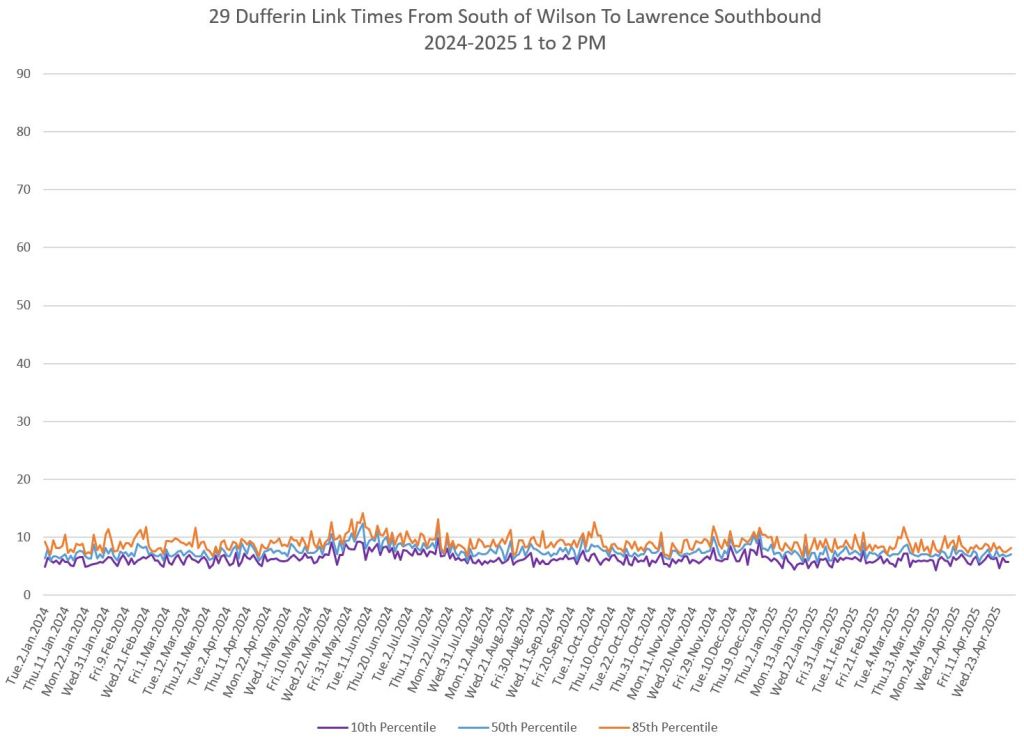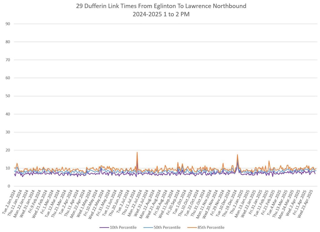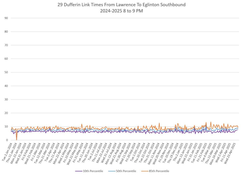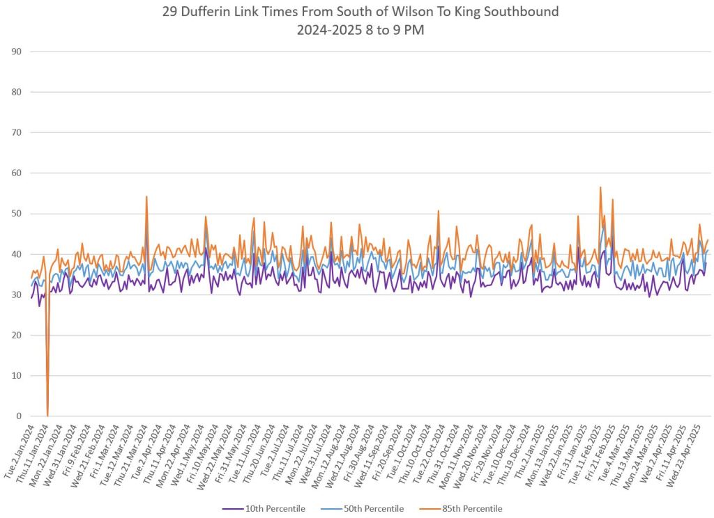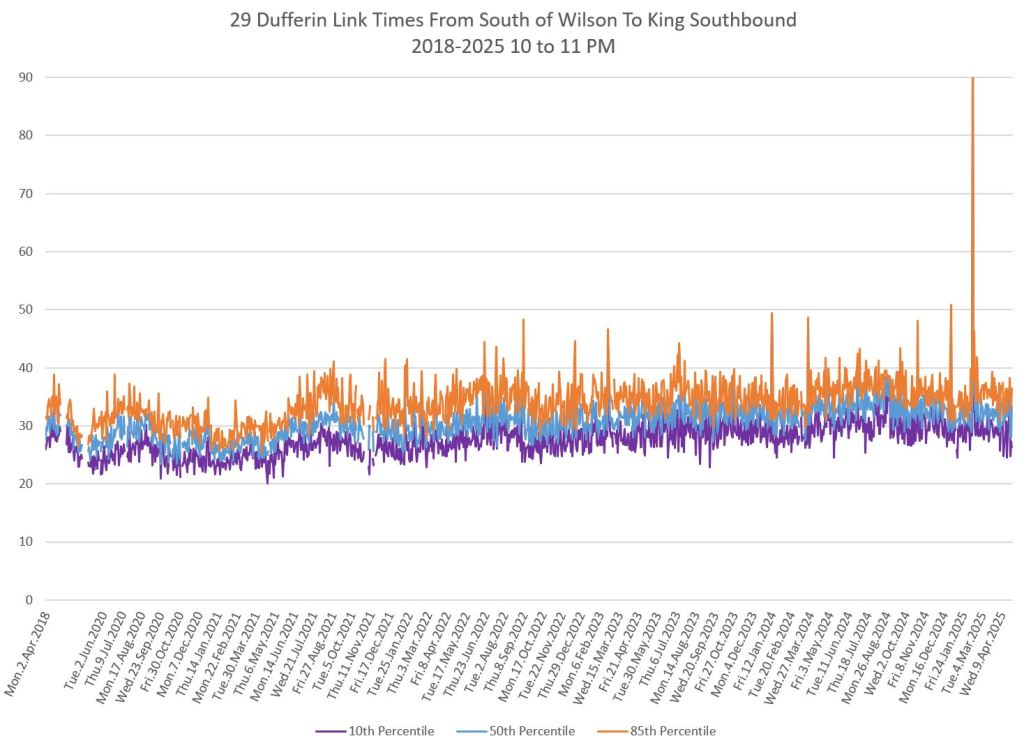 In the first two parts of this series, I reviewed headway and travel time data for the 29/929 Dufferin bus during April 2025.