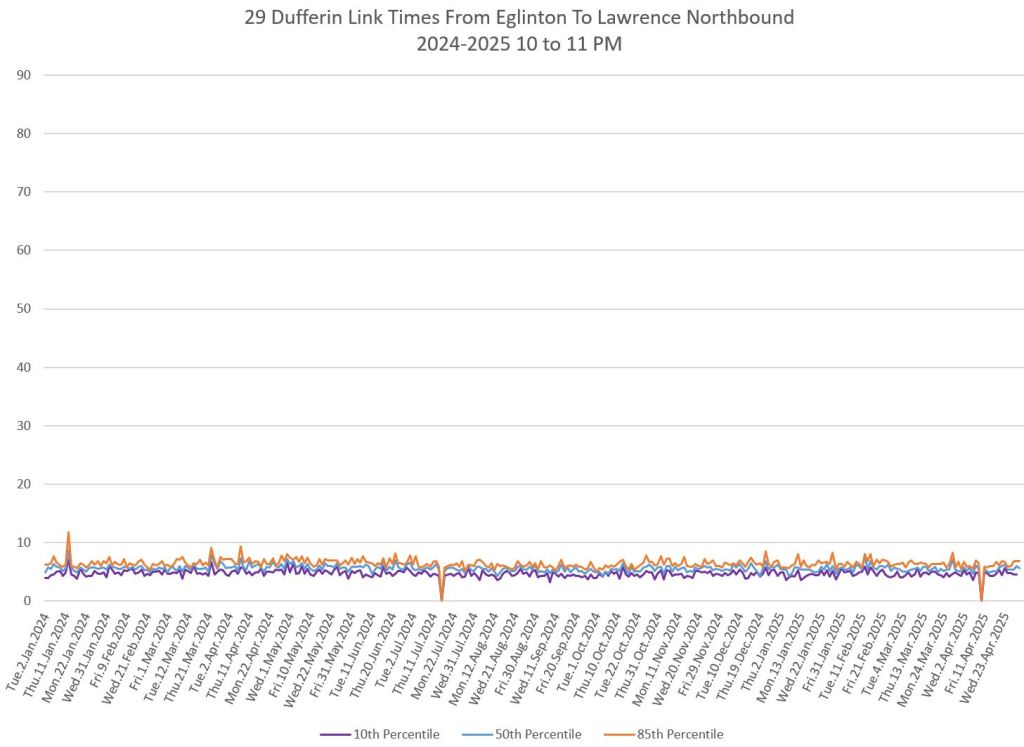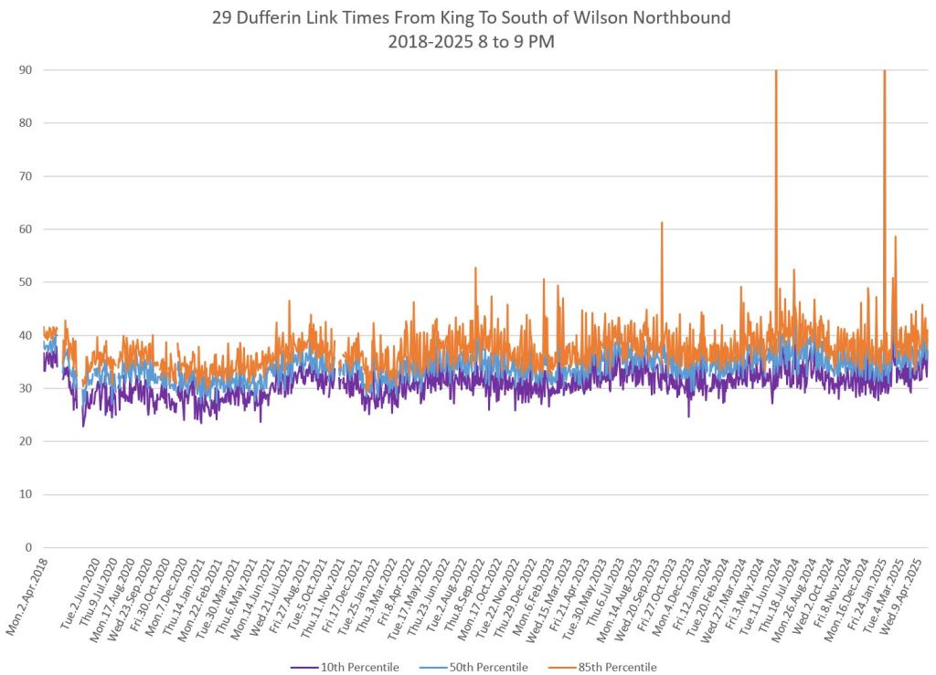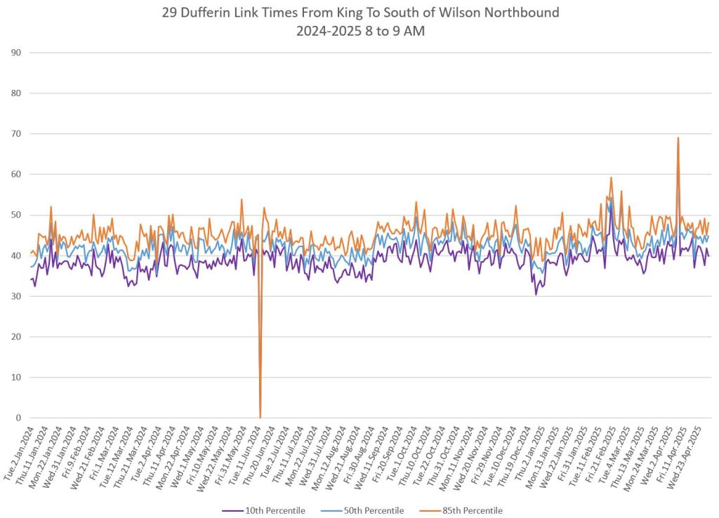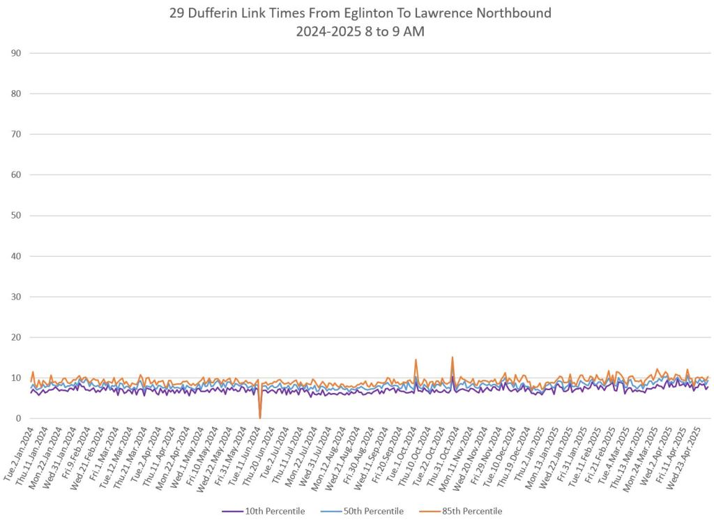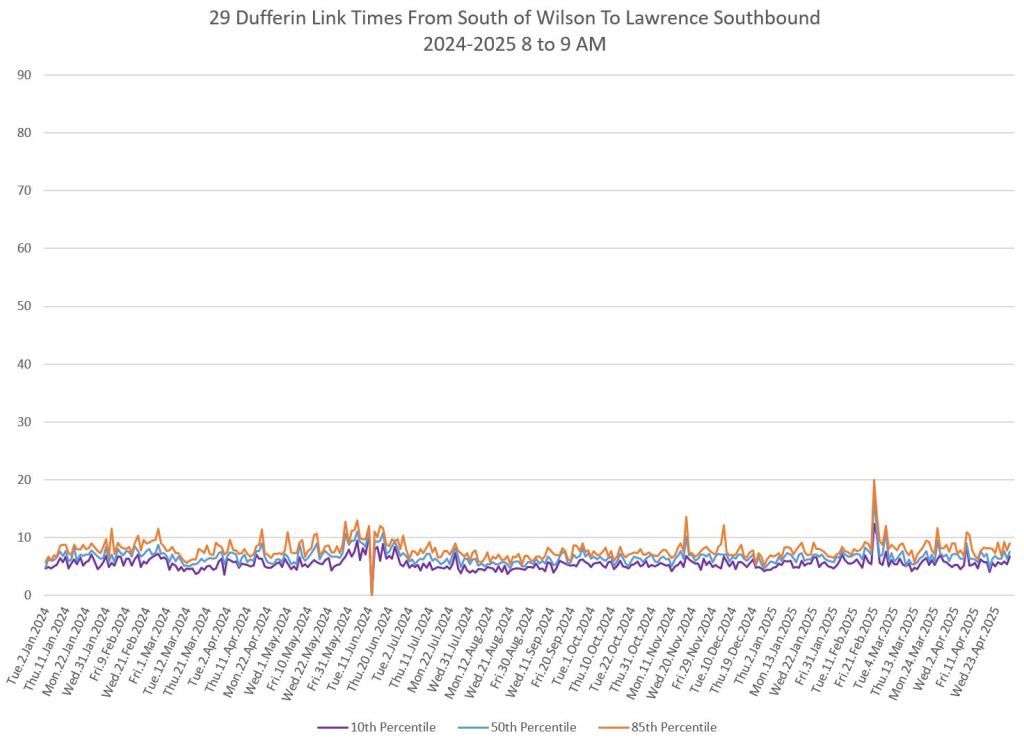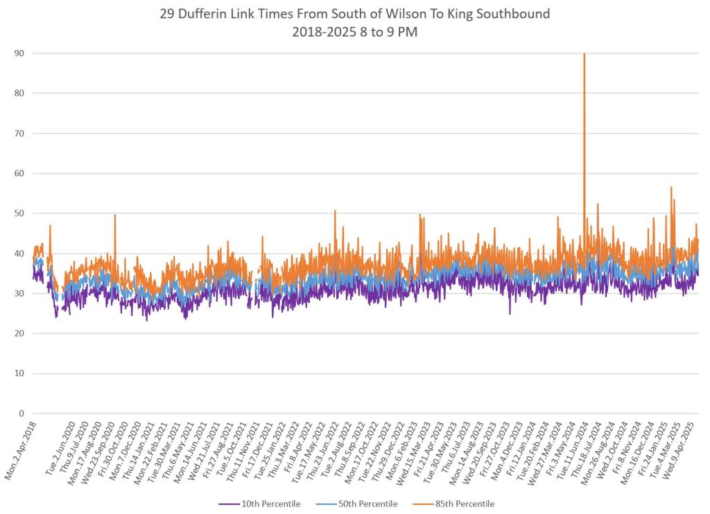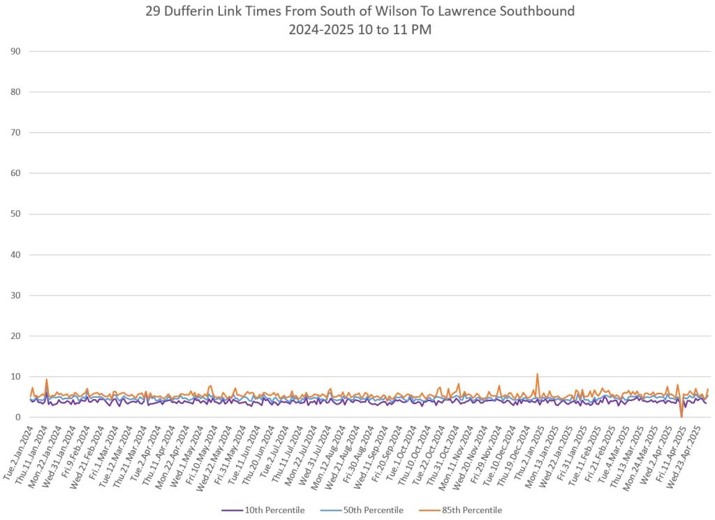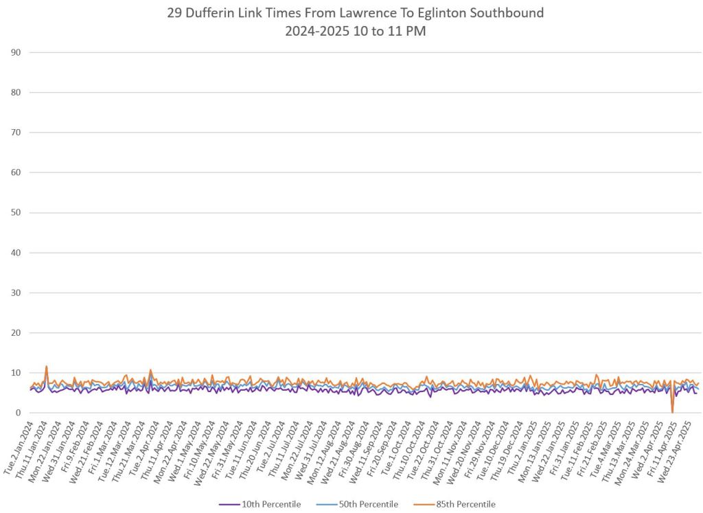 In the first two parts of this series, I reviewed headway and travel time data for the 29/929 Dufferin bus during April 2025.