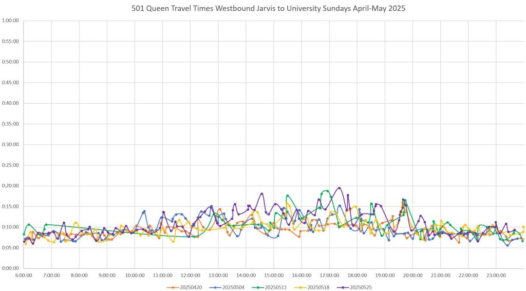 The data in these charts are adapted from the TransSee website where analytical charts for streetcar routes are provided free of charge by the site’s proprietor and designer, Darwin O’Connor. I have used these because my regular monthly feed of tracking data from TTC will not come in for May until early in June.