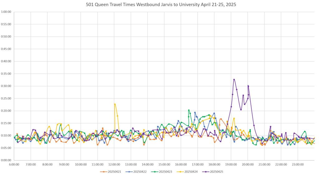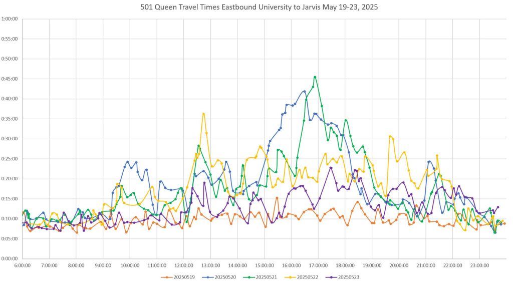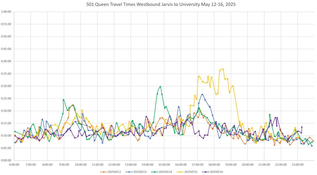 Beyond removing any obstructions from Adelaide Street and ensuring no new ones appear, it is difficult to think how the situation can be improved merely by “tweaking” the street. From the travel time charts, it is clear that when traffic is light, streetcars can navigate the diversion without excessive delay. However, as more road capacity is used by cars in the late afternoon and early evening, the road cannot handle the combined demand.
