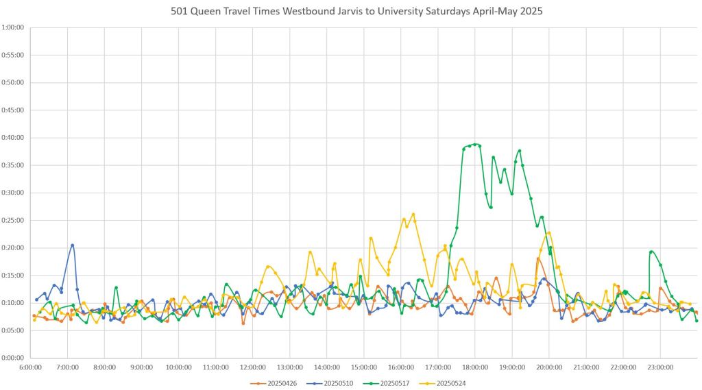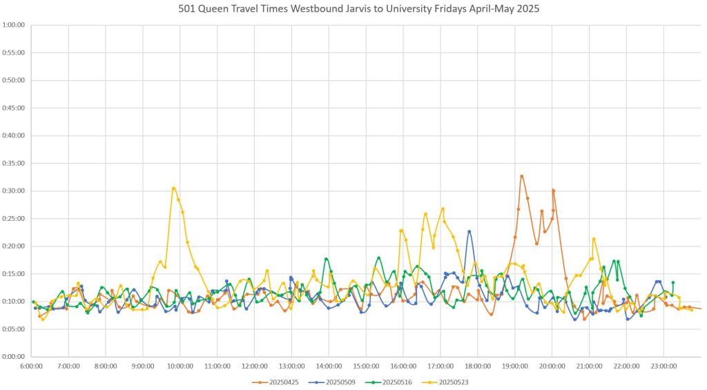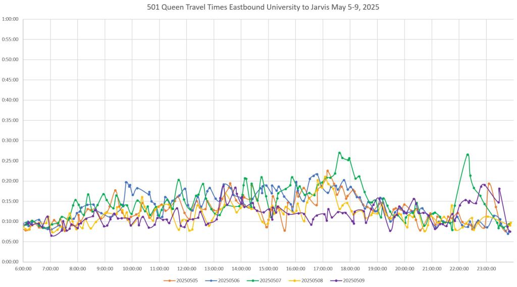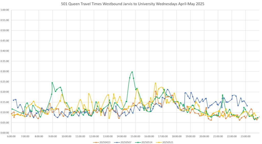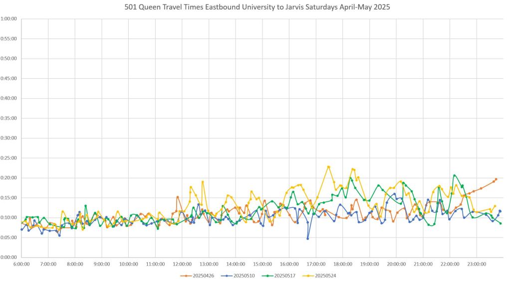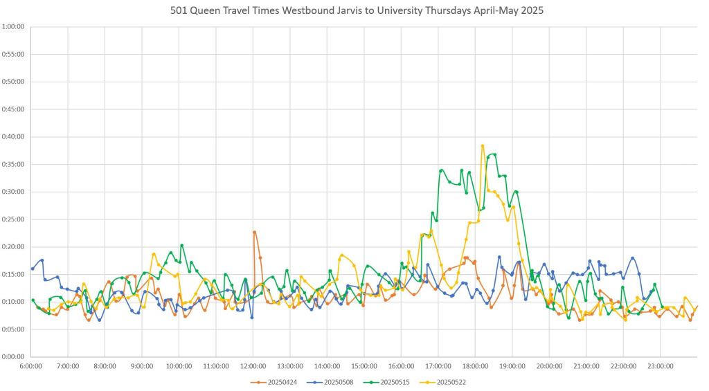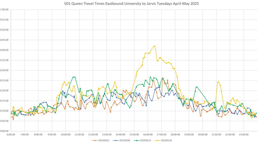 Charts in the following section show travel times between University and Jarvis both ways, and how these rose when the volume of 503-504-508 service was added along the diversion.