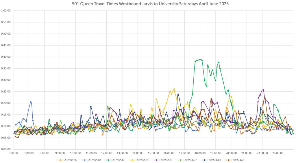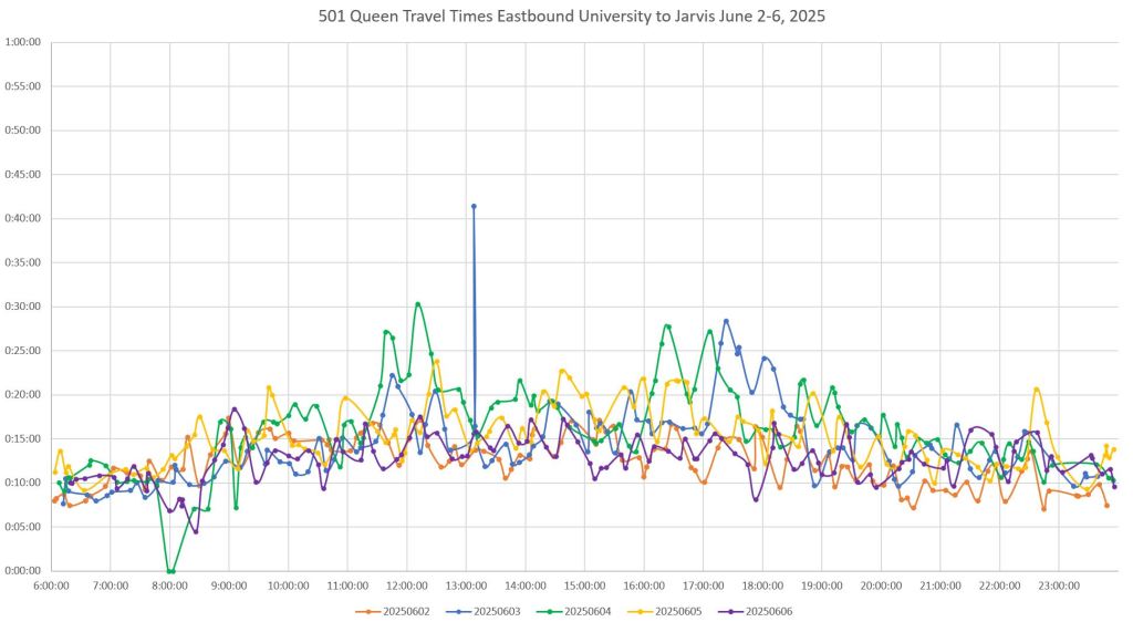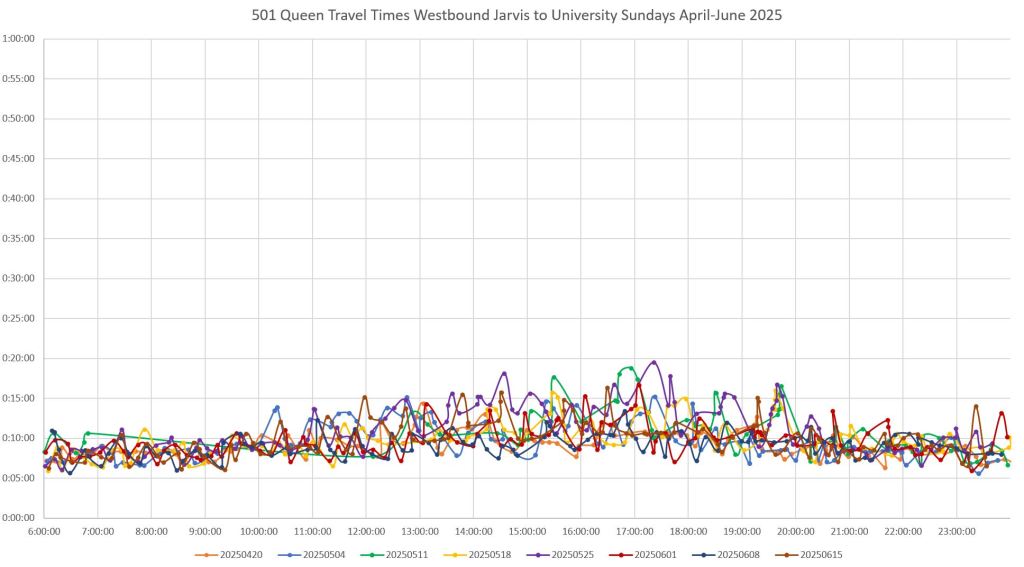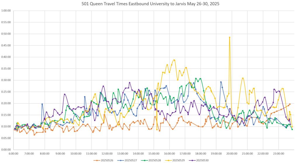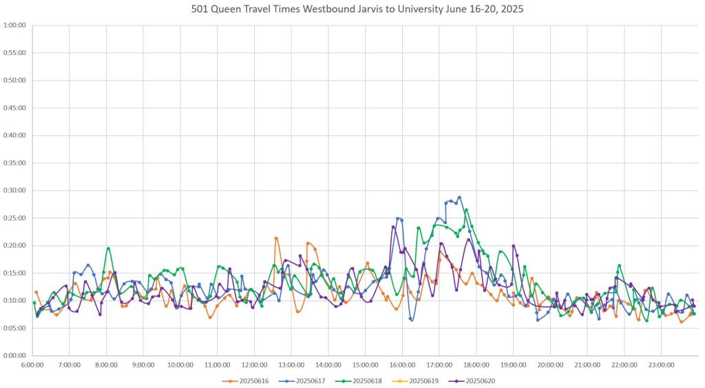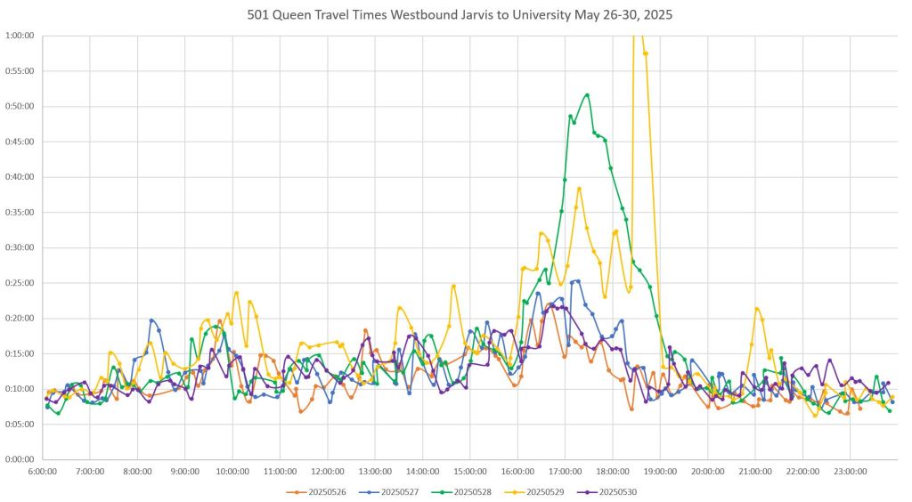 Note that travel times are less erratic from June 2 onward. From personal observation, an important change was that with Church Street closed at King, the queue of northbound traffic on Church trapping eastbound streetcars (and hence traffic on Adelaide) was reduced.