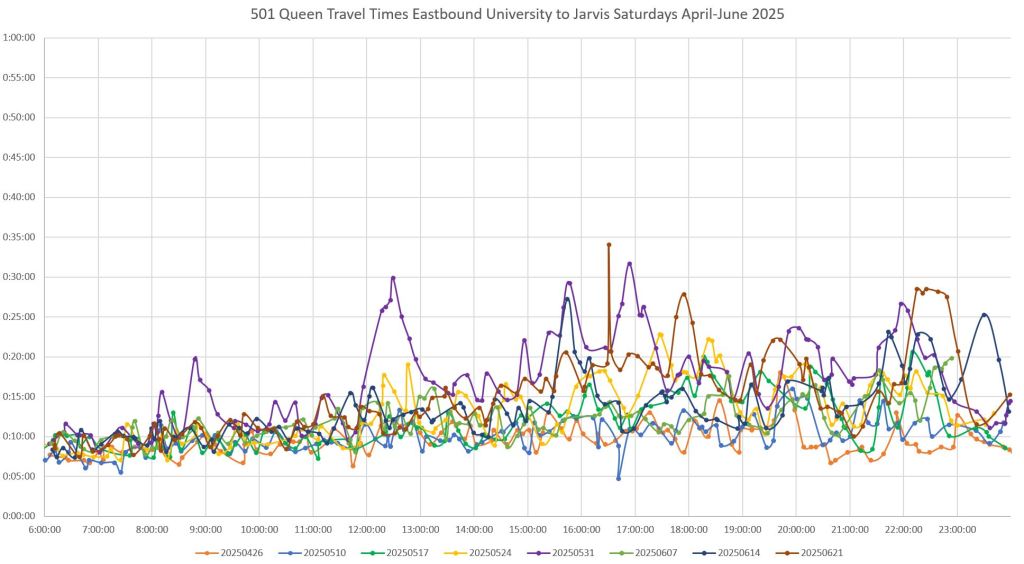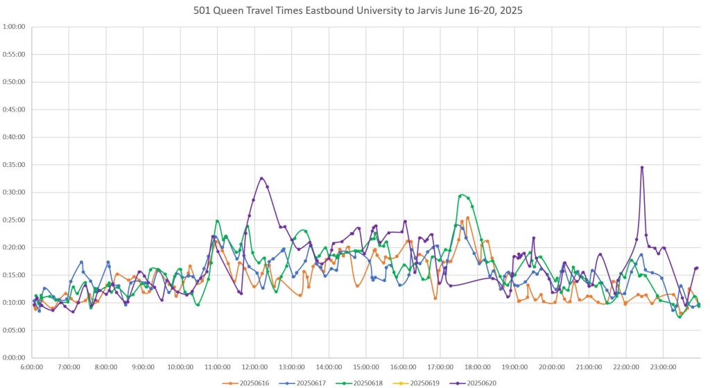 Steve: Looking at the tracking chart for yesterday’s service, the congestion started at about 12:30pm and dd not relent until 8pm or so. I can put some of this, but not all, down to the Pride parade, but there was never an actual stoppage, only very, very slow progress along the route. We have reached the point where re-opening of King Street to traffic is about 6 weeks away (the Mayor cited August 8 in a recent Council meeting), and by the time anything significant gets organized, we won’t need it. There seems to be an attitude in the City of making do with whatever happens because it’s “temporary”. I suspect FIFA will be a real mess because nobody has the guts to tell motorists to just get lost during major events.