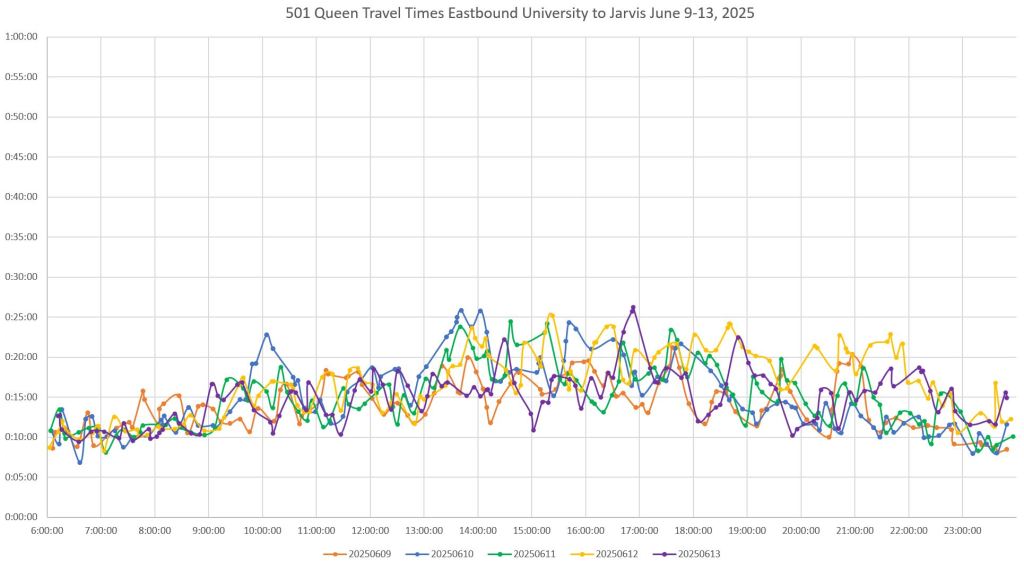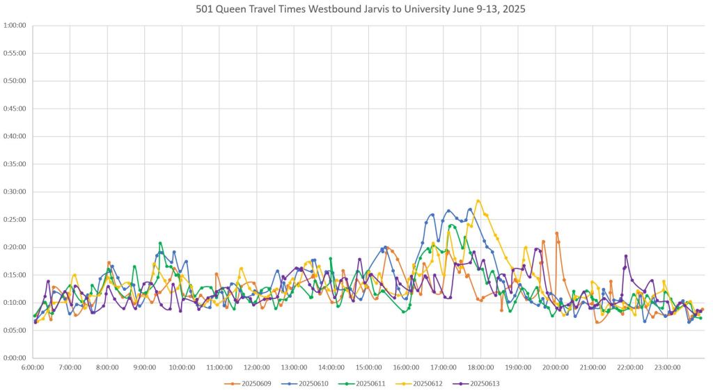 The remainder of this article updates previously-published charts about streetcar travel times on Richmond and Adelaide Streets.