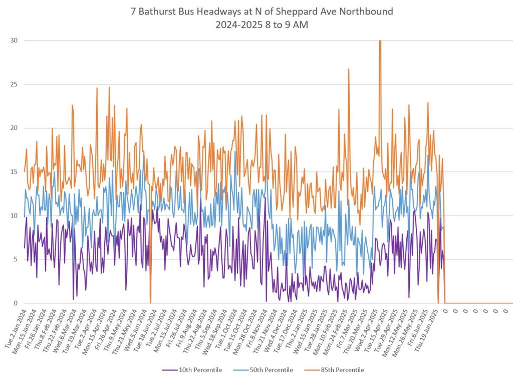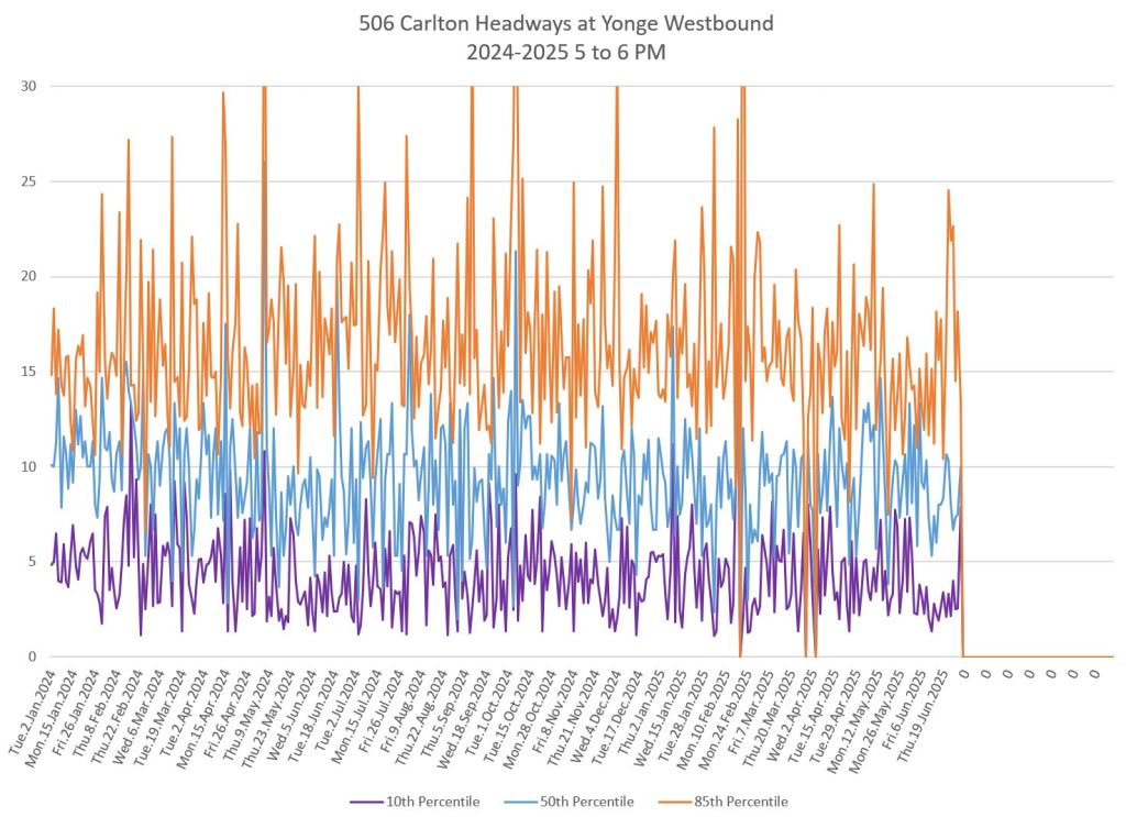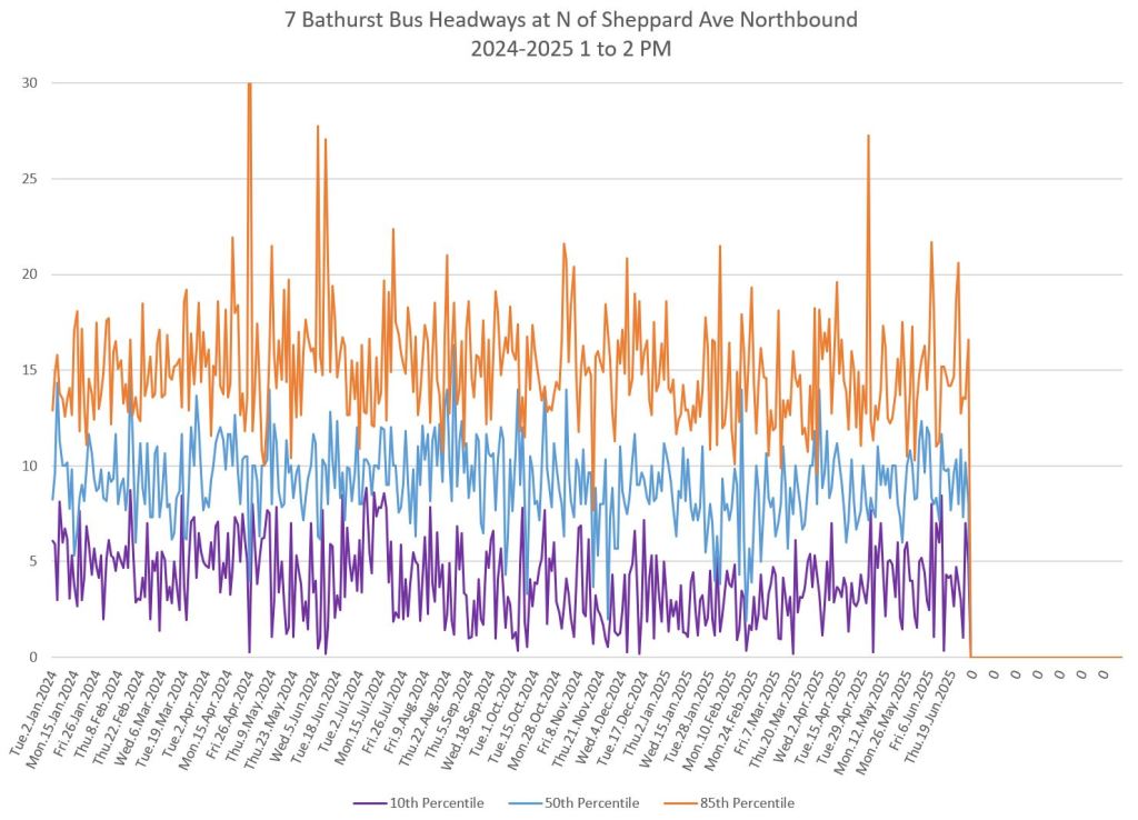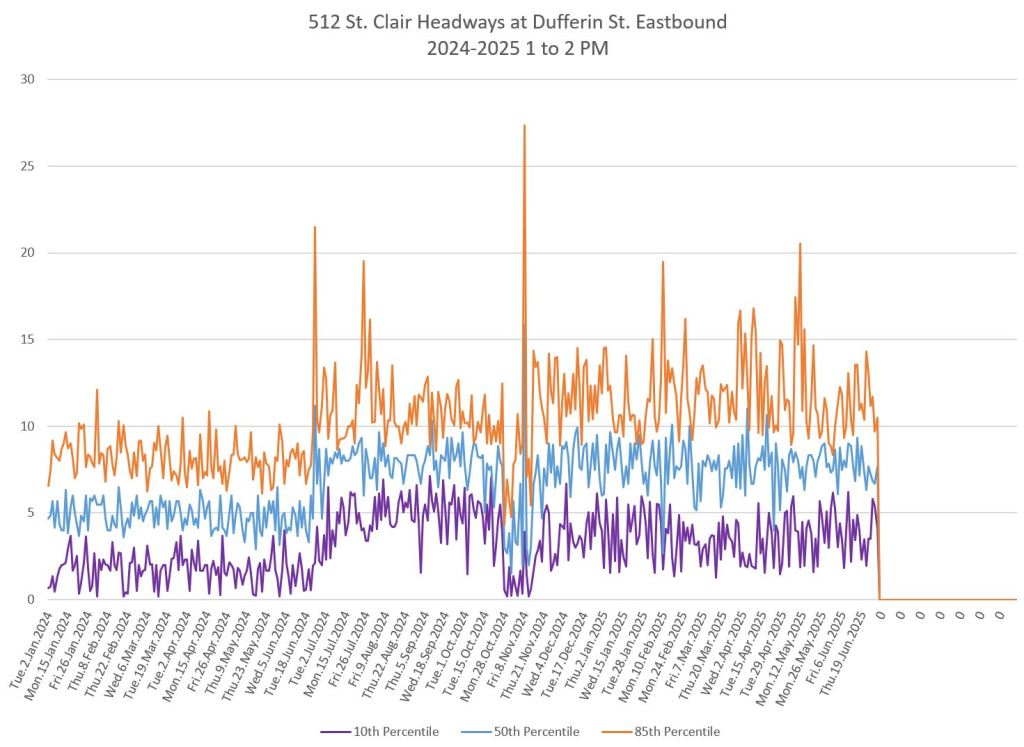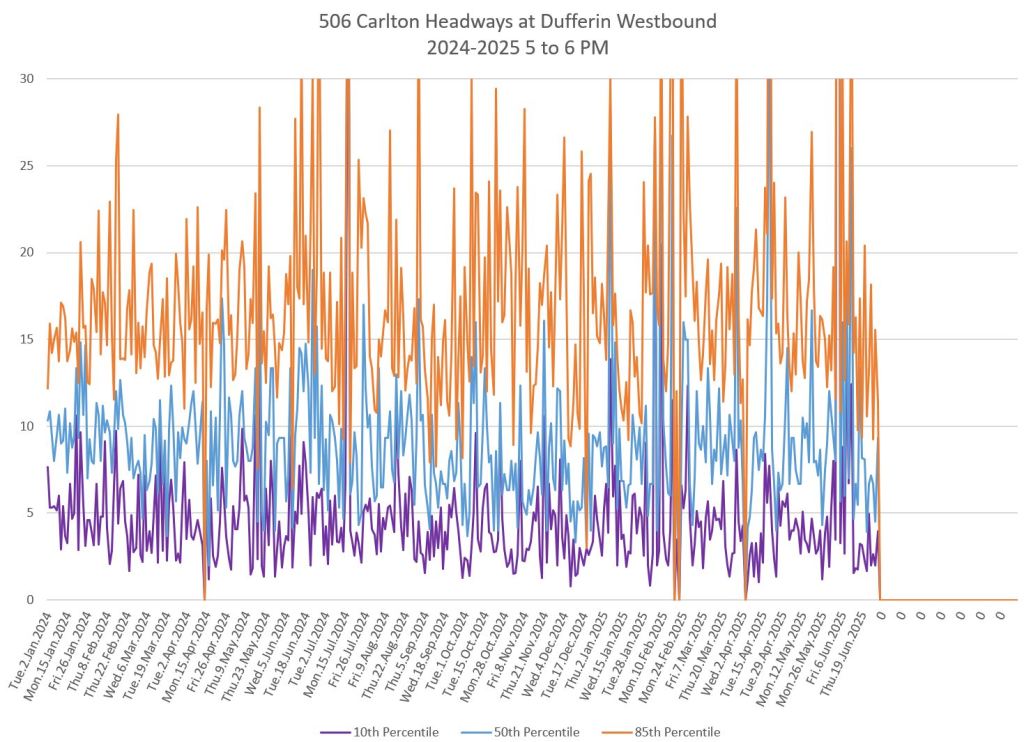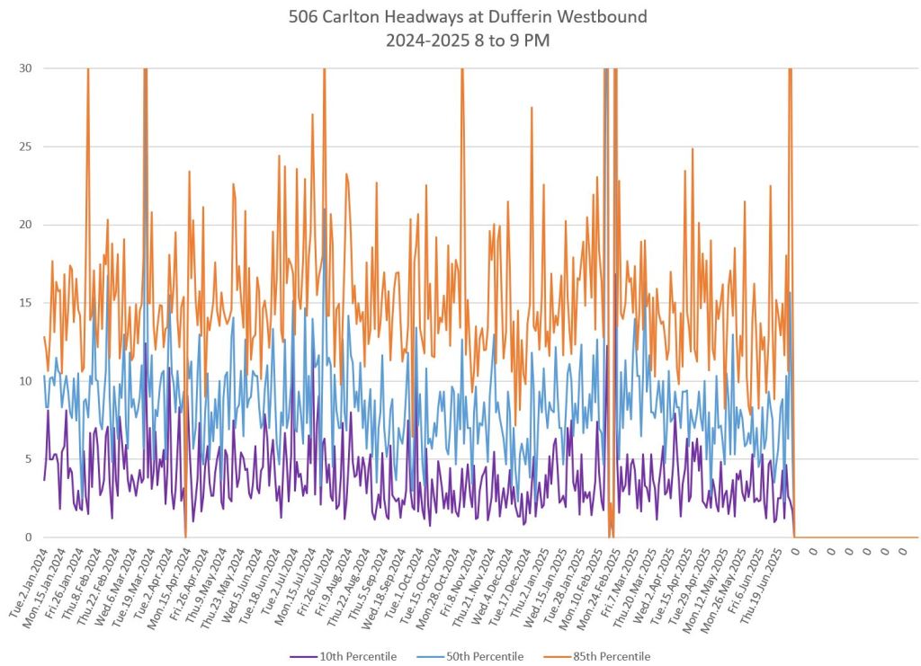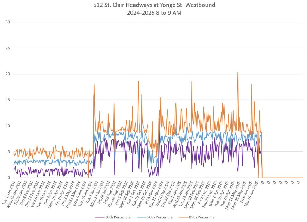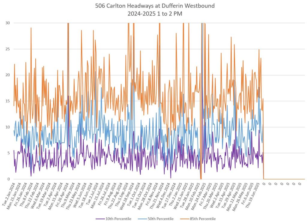 Partly to hold their feet to the fire, and to provide the type of information that should be routinely available to the Board, management and the public, this article will do the work the TTC claims they cannot. Here are headway reliability analyses for the routes involved over much or all of the period from January 1, 2024 to June 30, 2025.