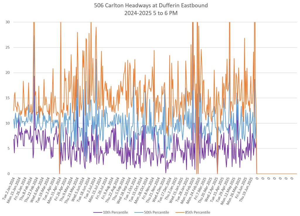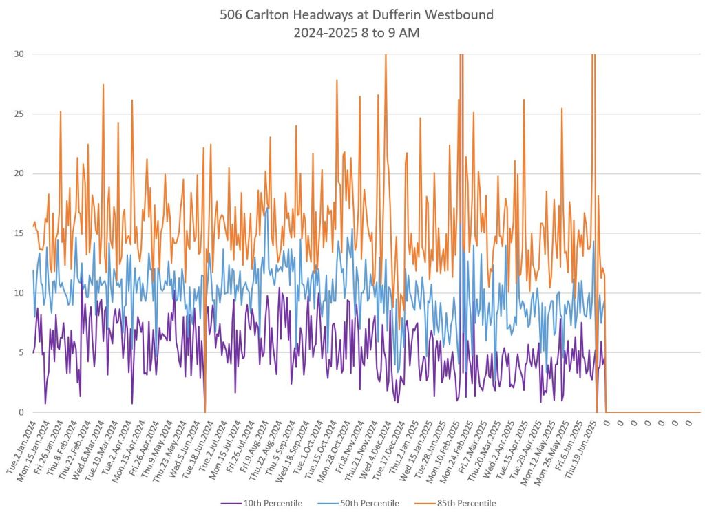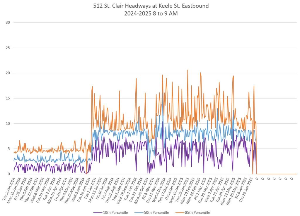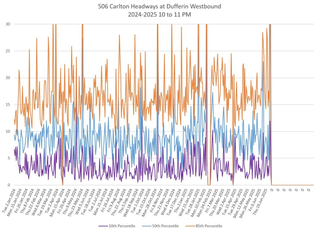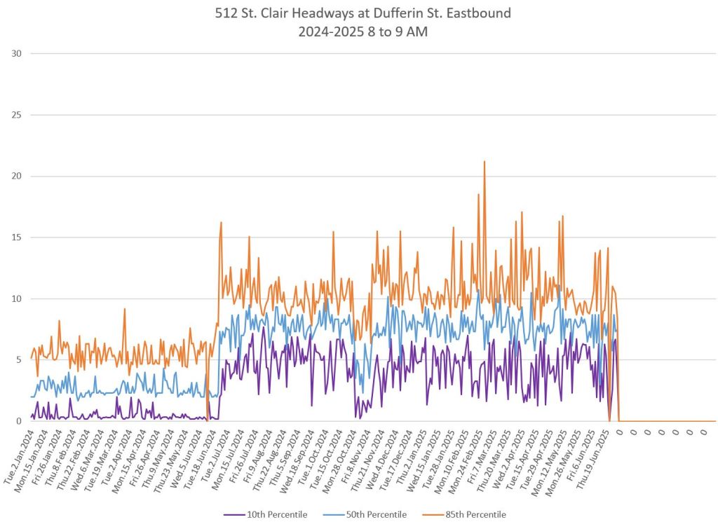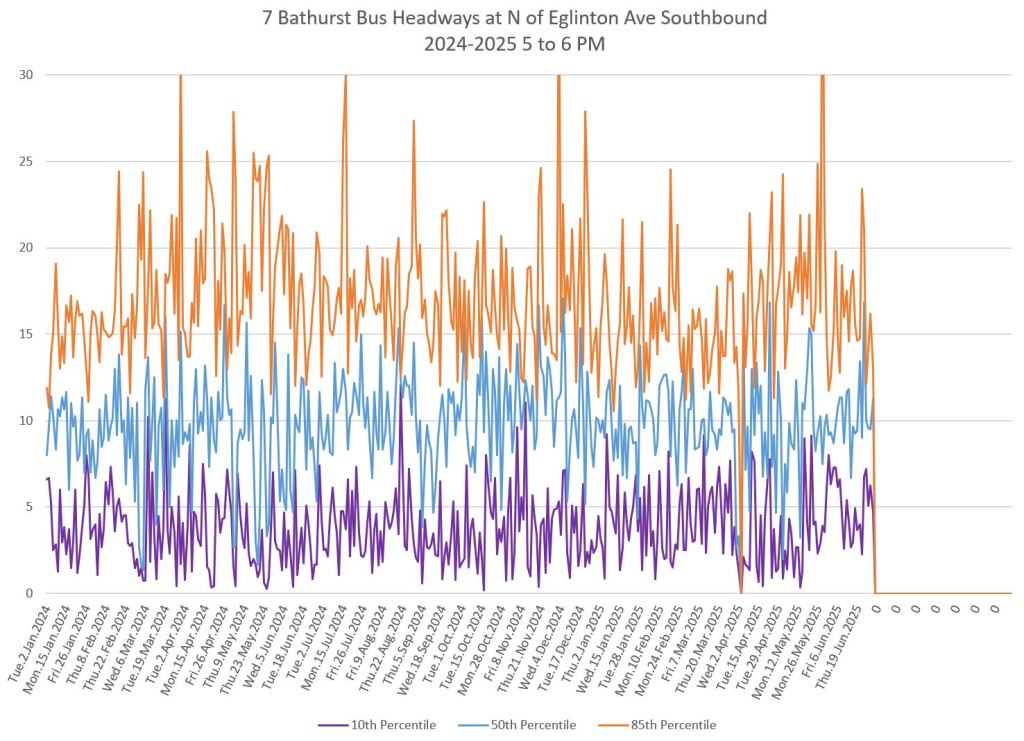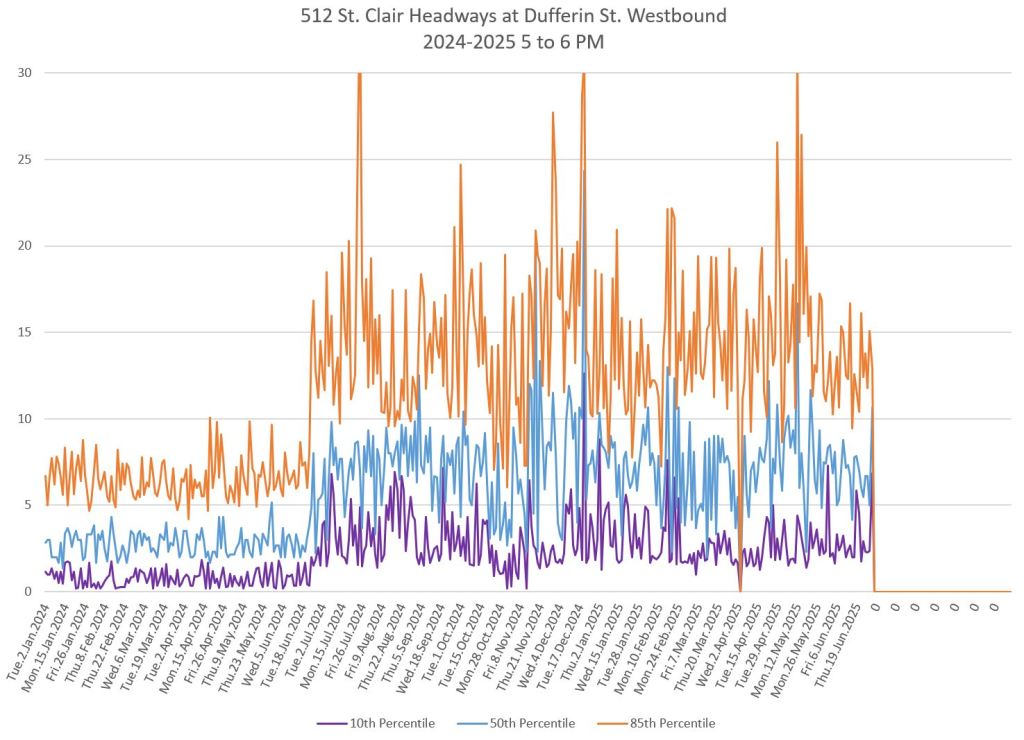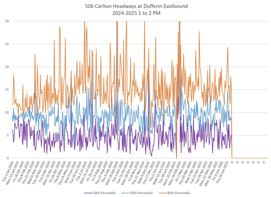 Partly to hold their feet to the fire, and to provide the type of information that should be routinely available to the Board, management and the public, this article will do the work the TTC claims they cannot. Here are headway reliability analyses for the routes involved over much or all of the period from January 1, 2024 to June 30, 2025.