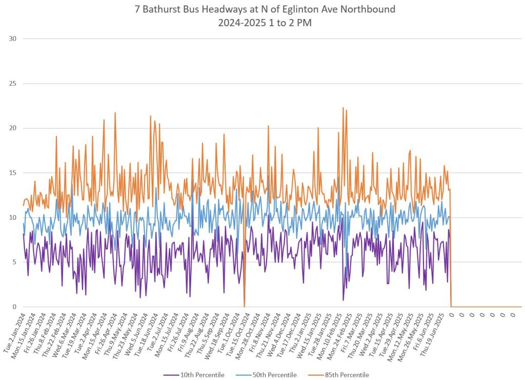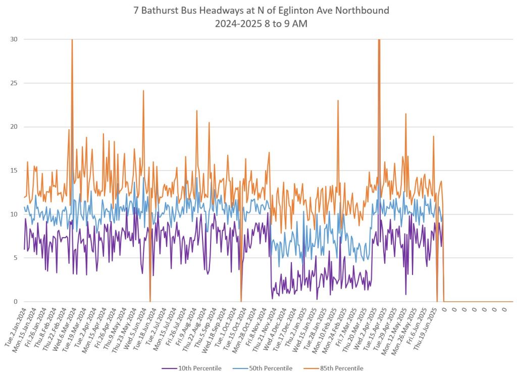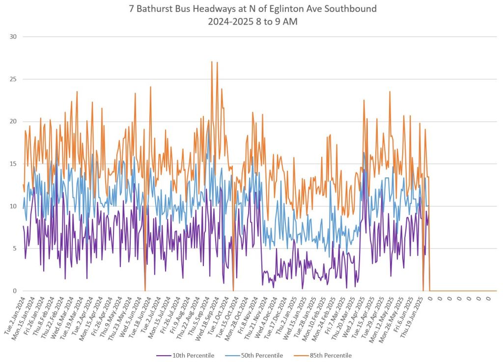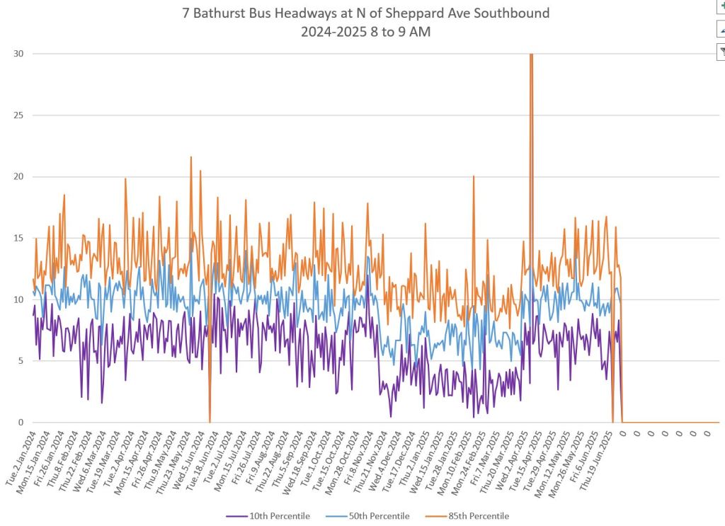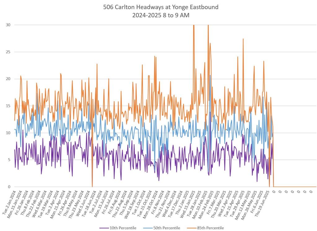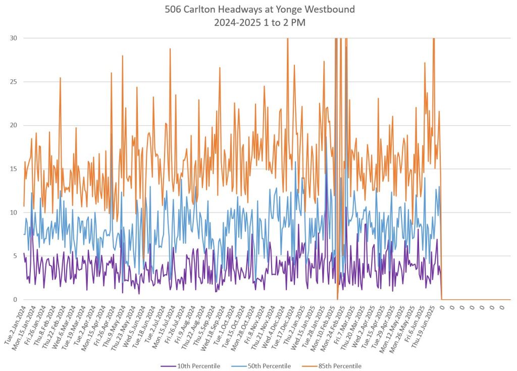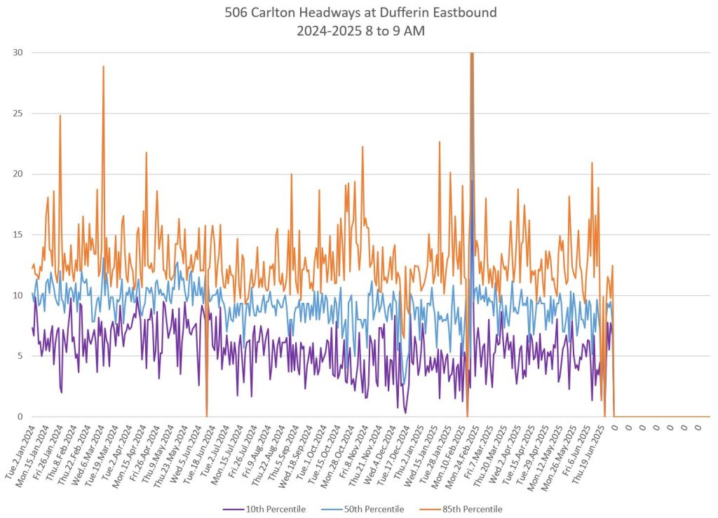 Partly to hold their feet to the fire, and to provide the type of information that should be routinely available to the Board, management and the public, this article will do the work the TTC claims they cannot. Here are headway reliability analyses for the routes involved over much or all of the period from January 1, 2024 to June 30, 2025.