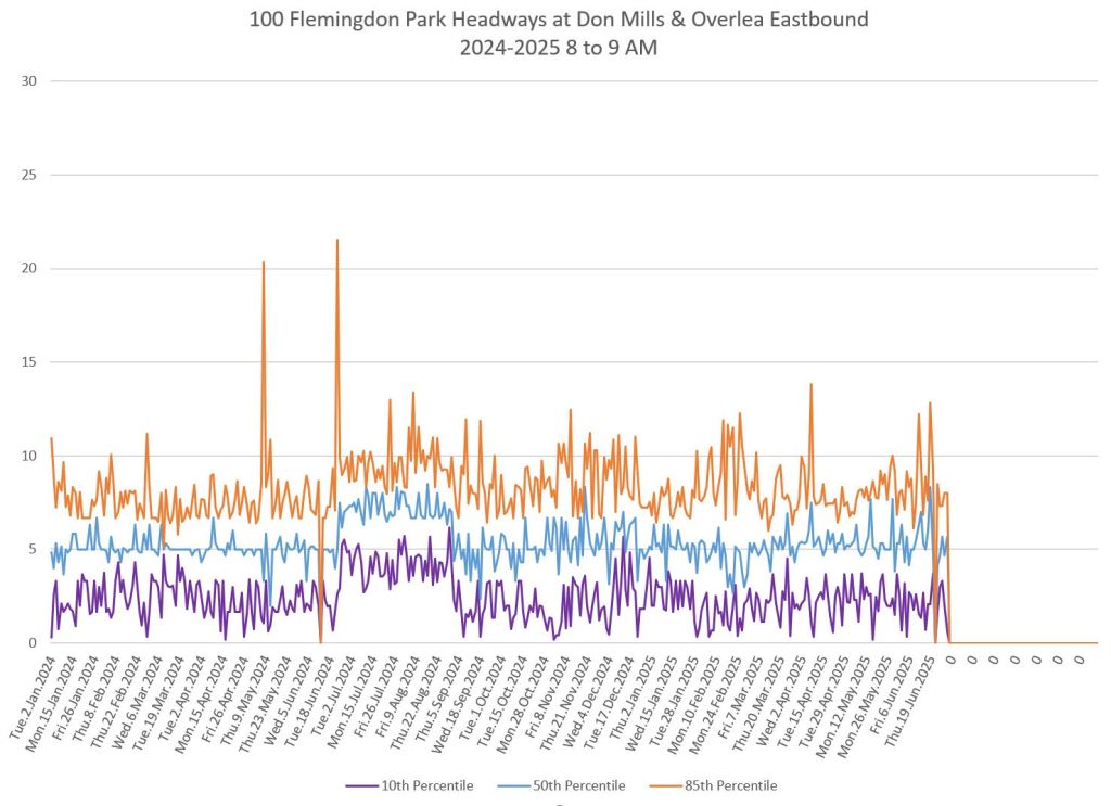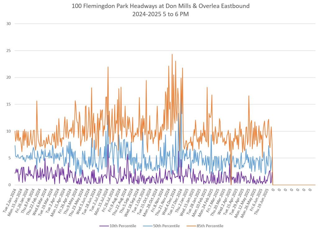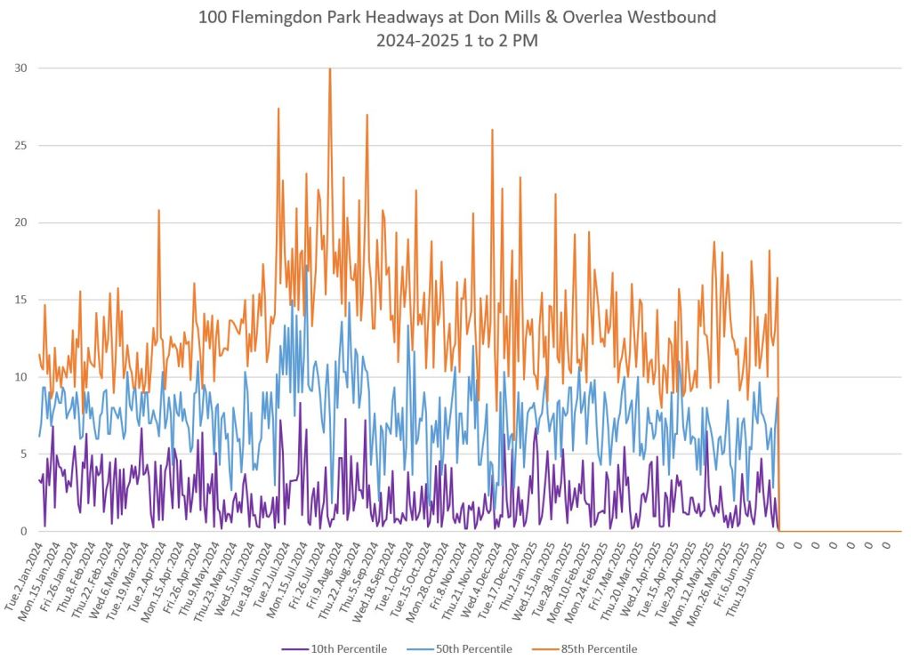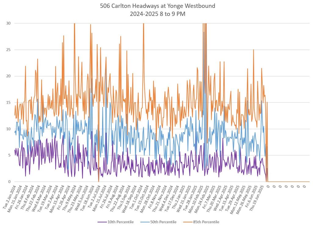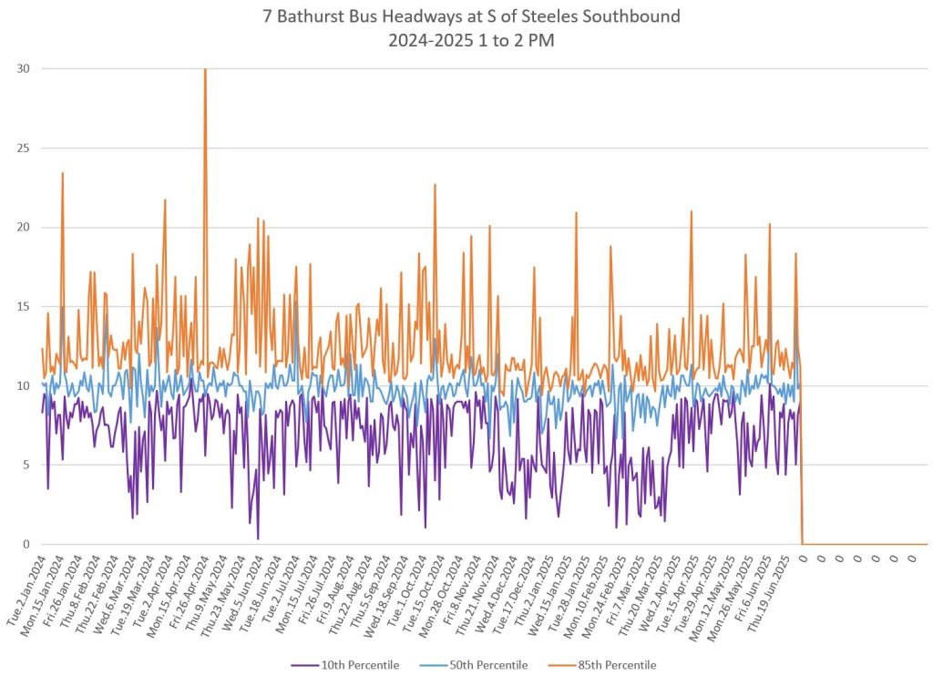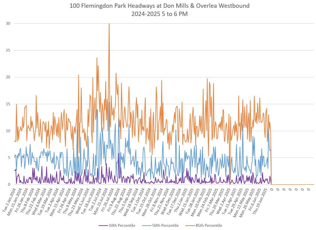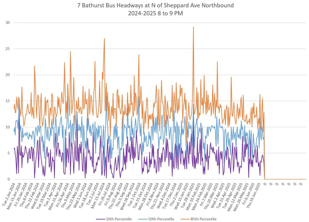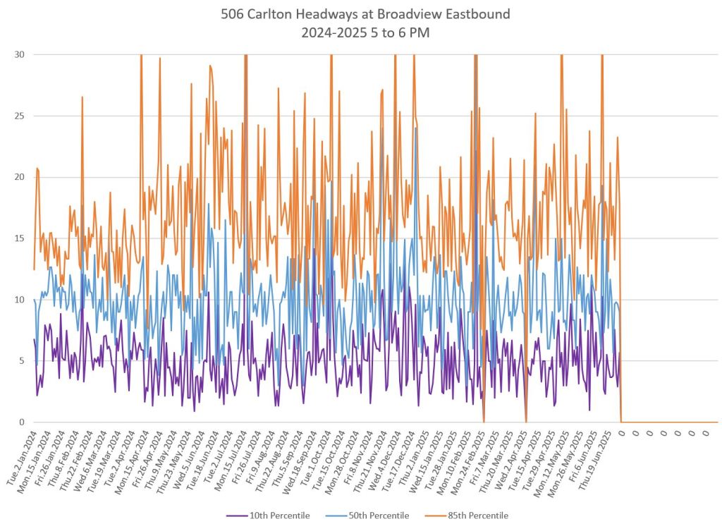 Partly to hold their feet to the fire, and to provide the type of information that should be routinely available to the Board, management and the public, this article will do the work the TTC claims they cannot. Here are headway reliability analyses for the routes involved over much or all of the period from January 1, 2024 to June 30, 2025.