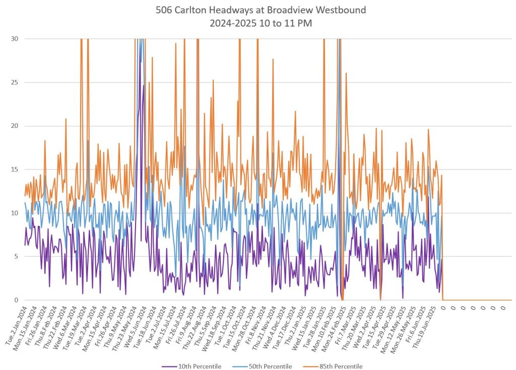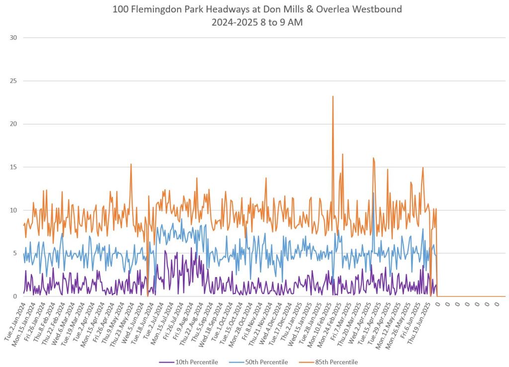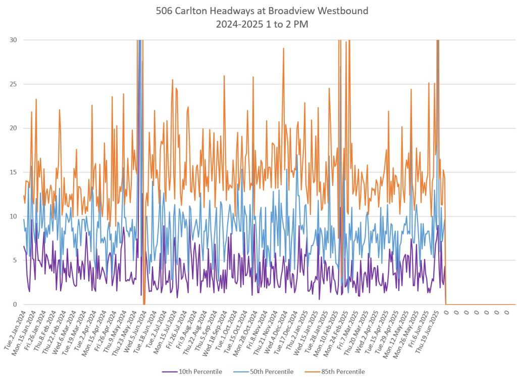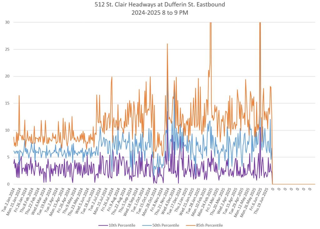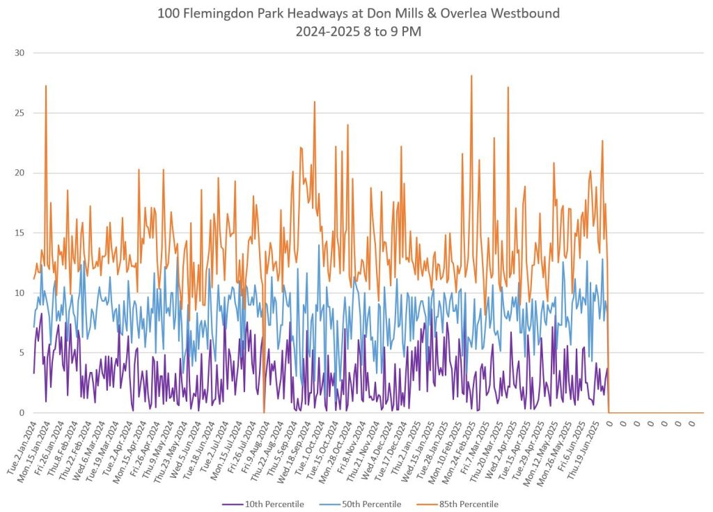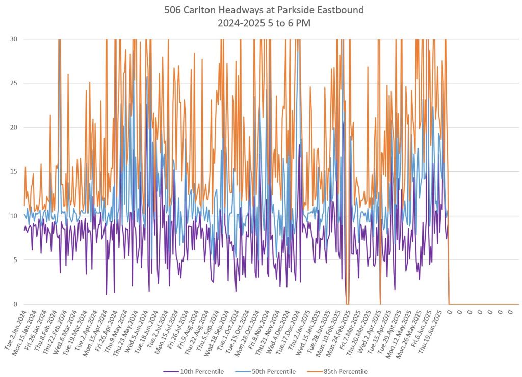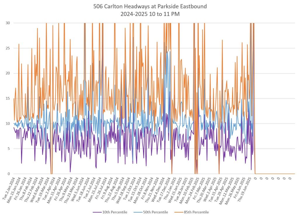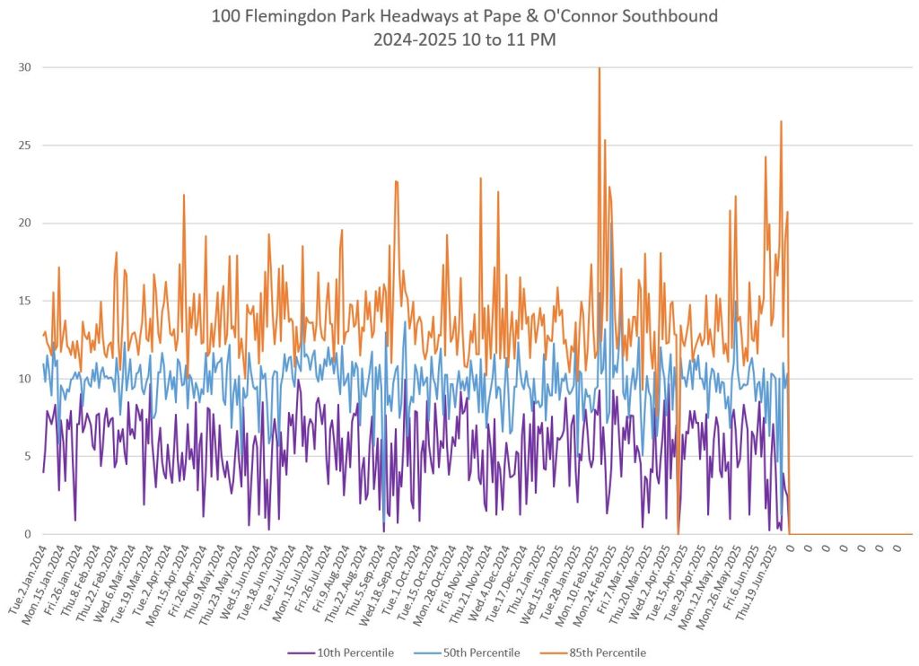 Partly to hold their feet to the fire, and to provide the type of information that should be routinely available to the Board, management and the public, this article will do the work the TTC claims they cannot. Here are headway reliability analyses for the routes involved over much or all of the period from January 1, 2024 to June 30, 2025.