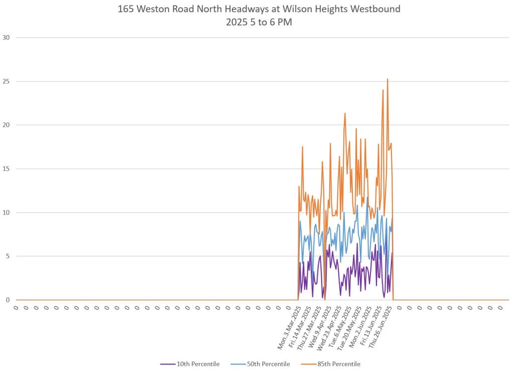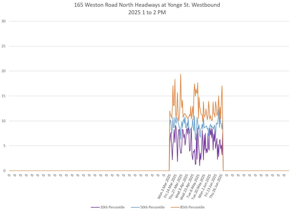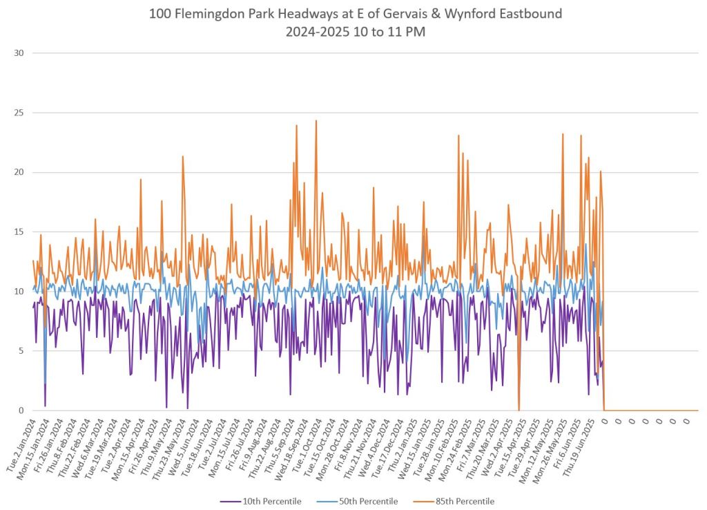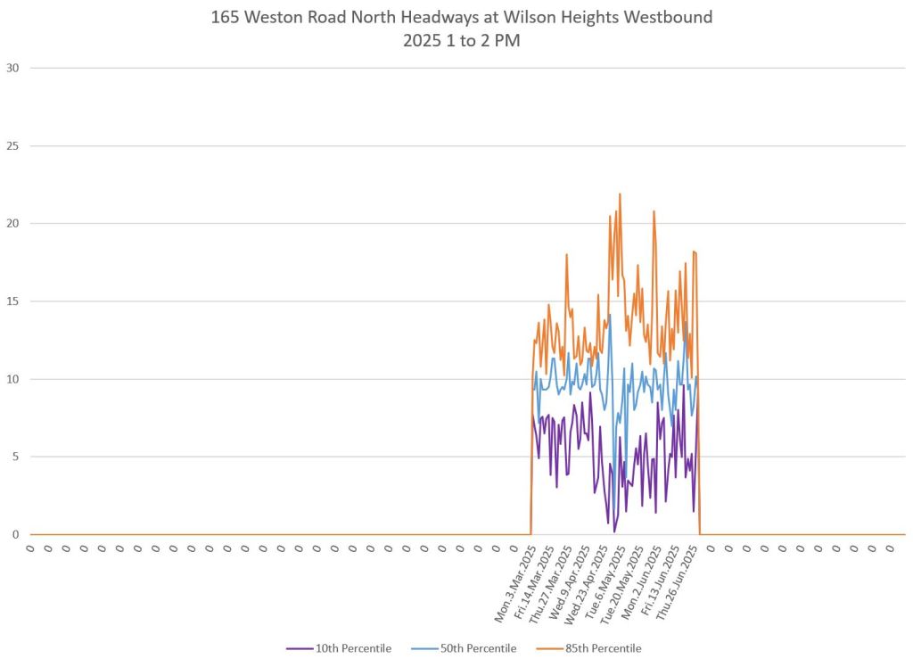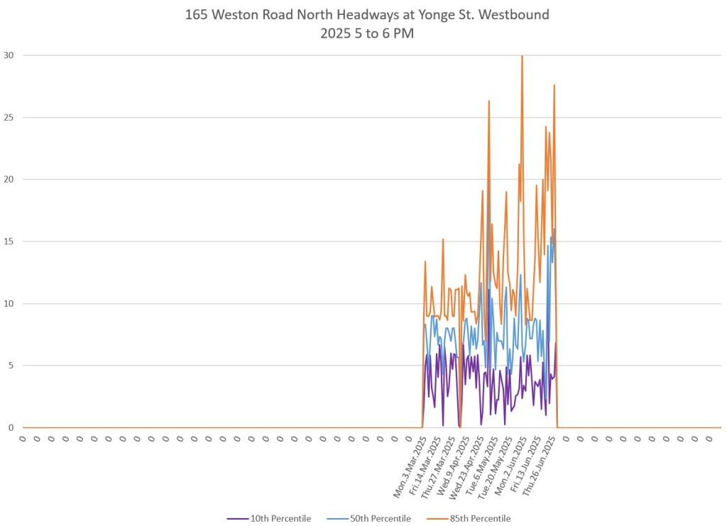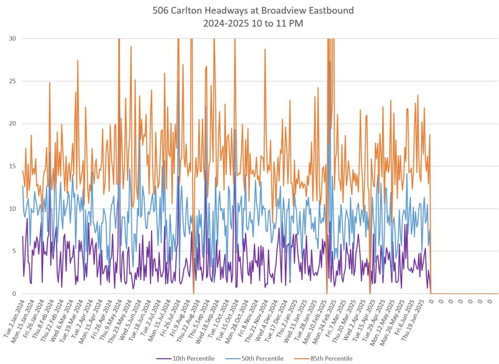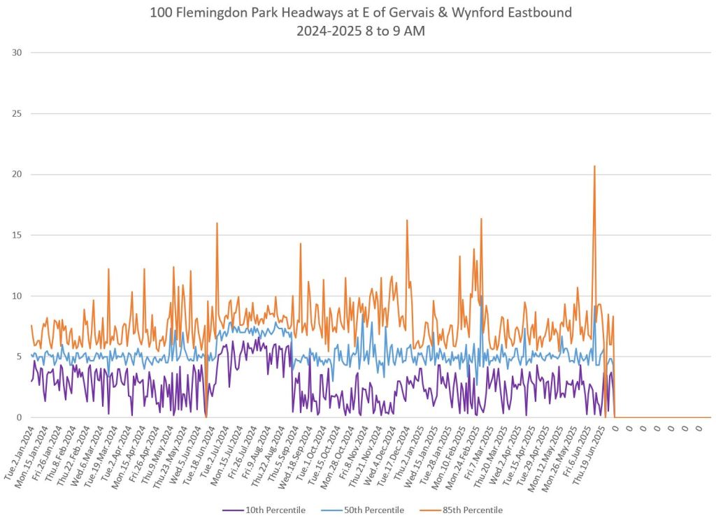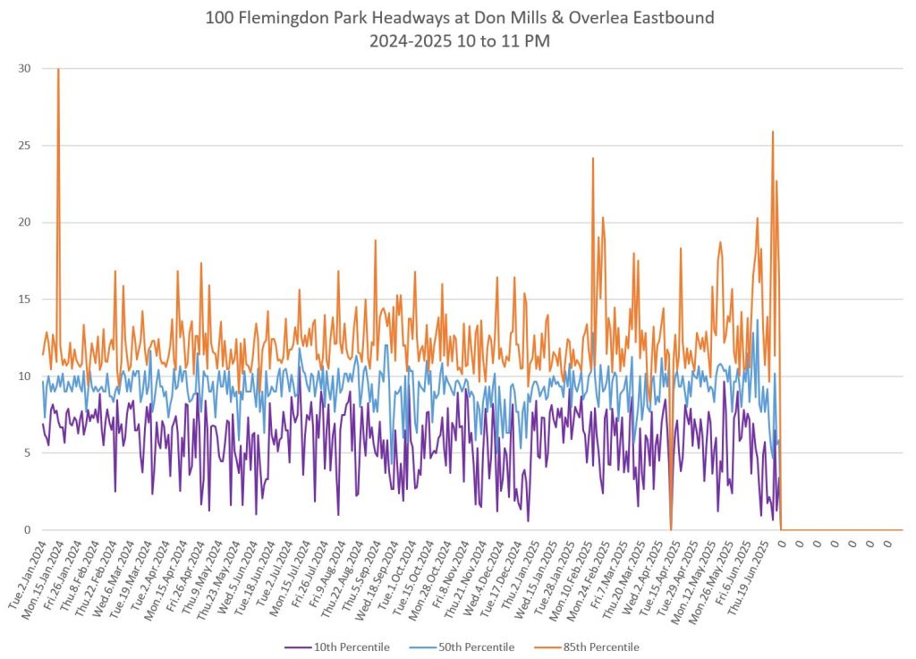 Partly to hold their feet to the fire, and to provide the type of information that should be routinely available to the Board, management and the public, this article will do the work the TTC claims they cannot. Here are headway reliability analyses for the routes involved over much or all of the period from January 1, 2024 to June 30, 2025.